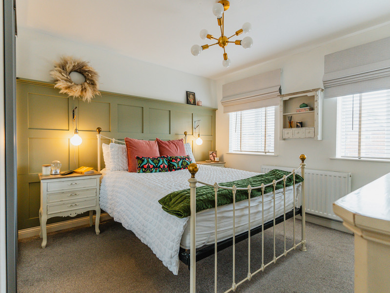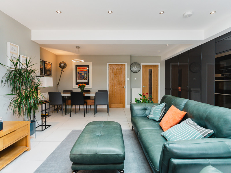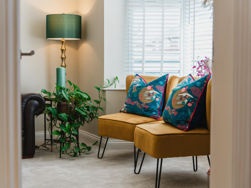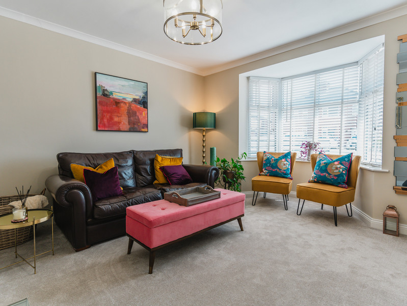A cosy lounge boasts a charming bay window that floods the room with natural light, while a bespoke fitted unit adds both functionality and flair. This is the perfect spot to relax and unwind, whether you're enjoying a quiet evening in or entertaining guests.