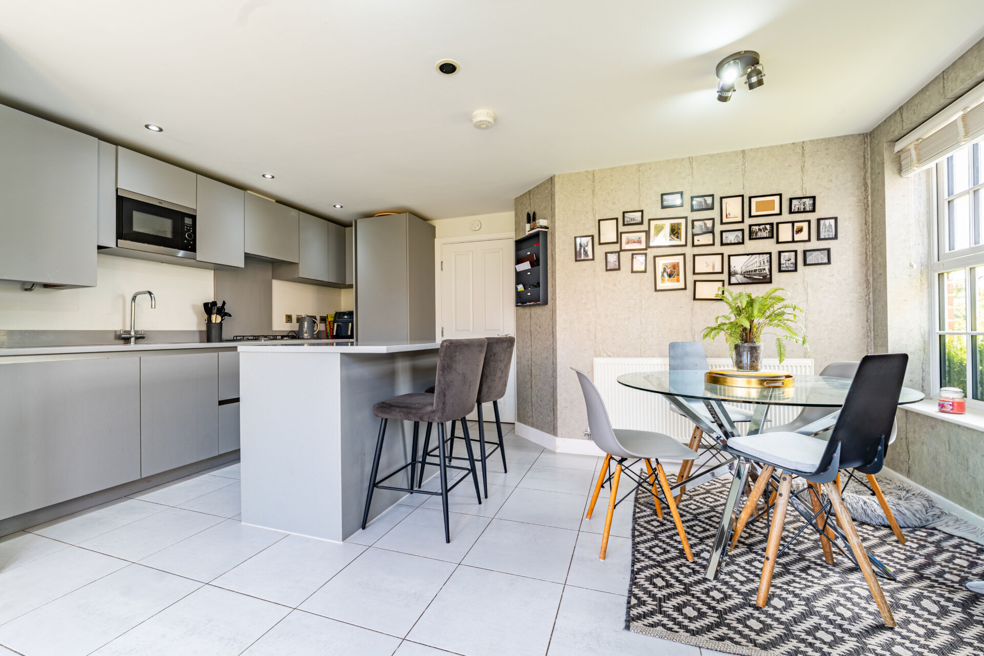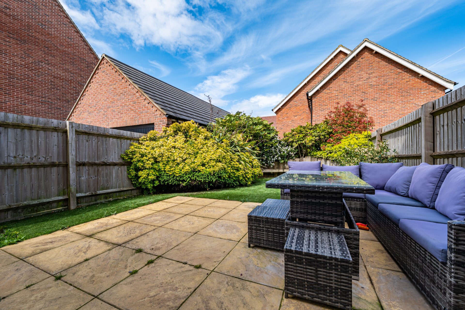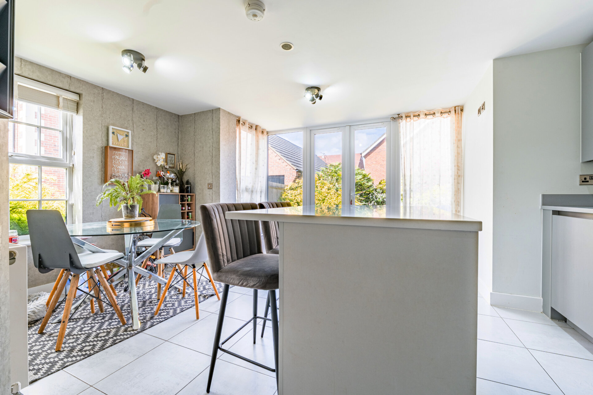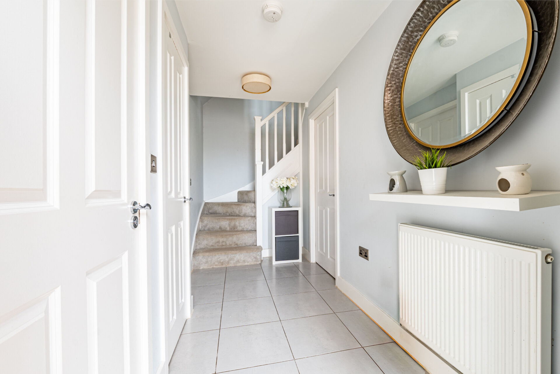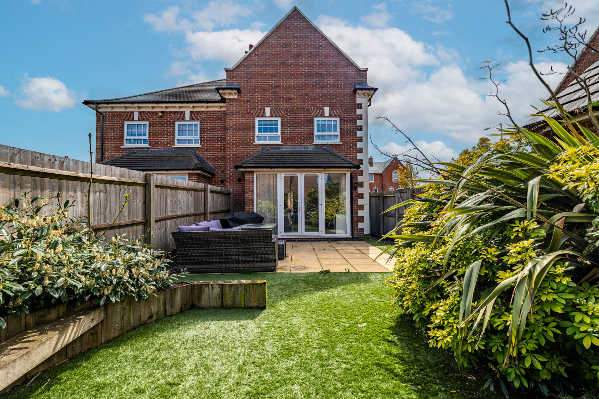 The ground floor is where you’ll find a bright open-plan kitchen diner, where French doors, flanked by two full-height windows, draw in an abundance of natural light and open onto a patio overlooking a private, mature garden. A dual-aspect living room provides a comfortable and versatile setting, while the high specification of a former show home is evident in the finer details, including built-in wardrobes to all three bedrooms and beautifully finished tiling throughout the kitchen and bathrooms. Additional storage is thoughtfully integrated, with cupboards located in the hallway, beneath the stairs and above the stairwell. Upstairs, three well-proportioned bedrooms are served by a modern four-piece family bathroom, with the principal bedroom benefitting from a well-appointed en-suite.