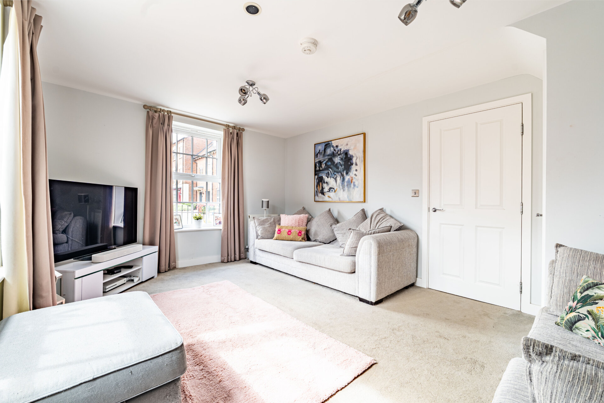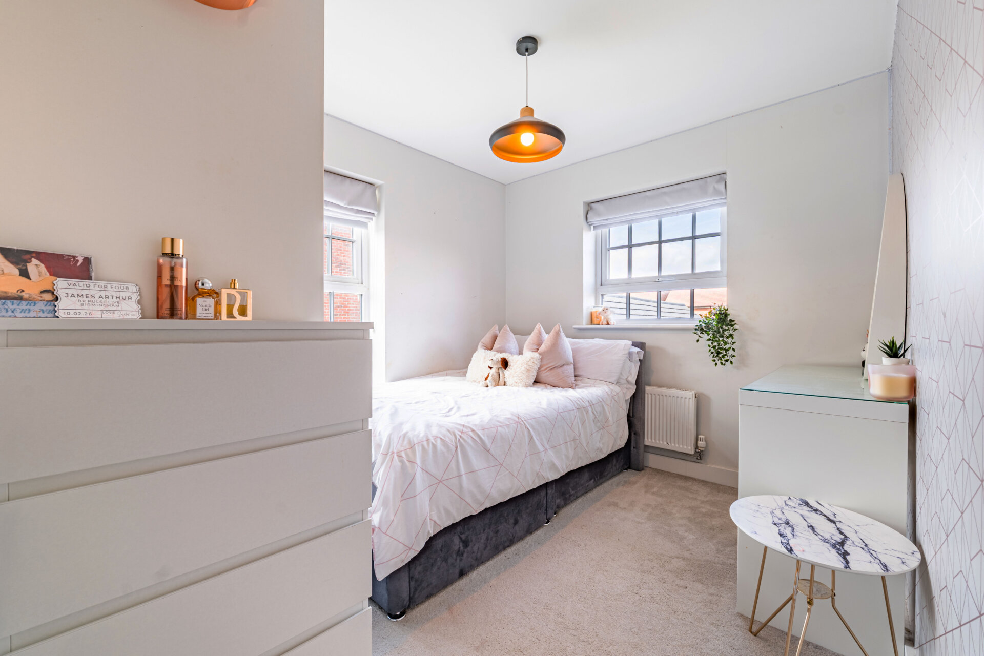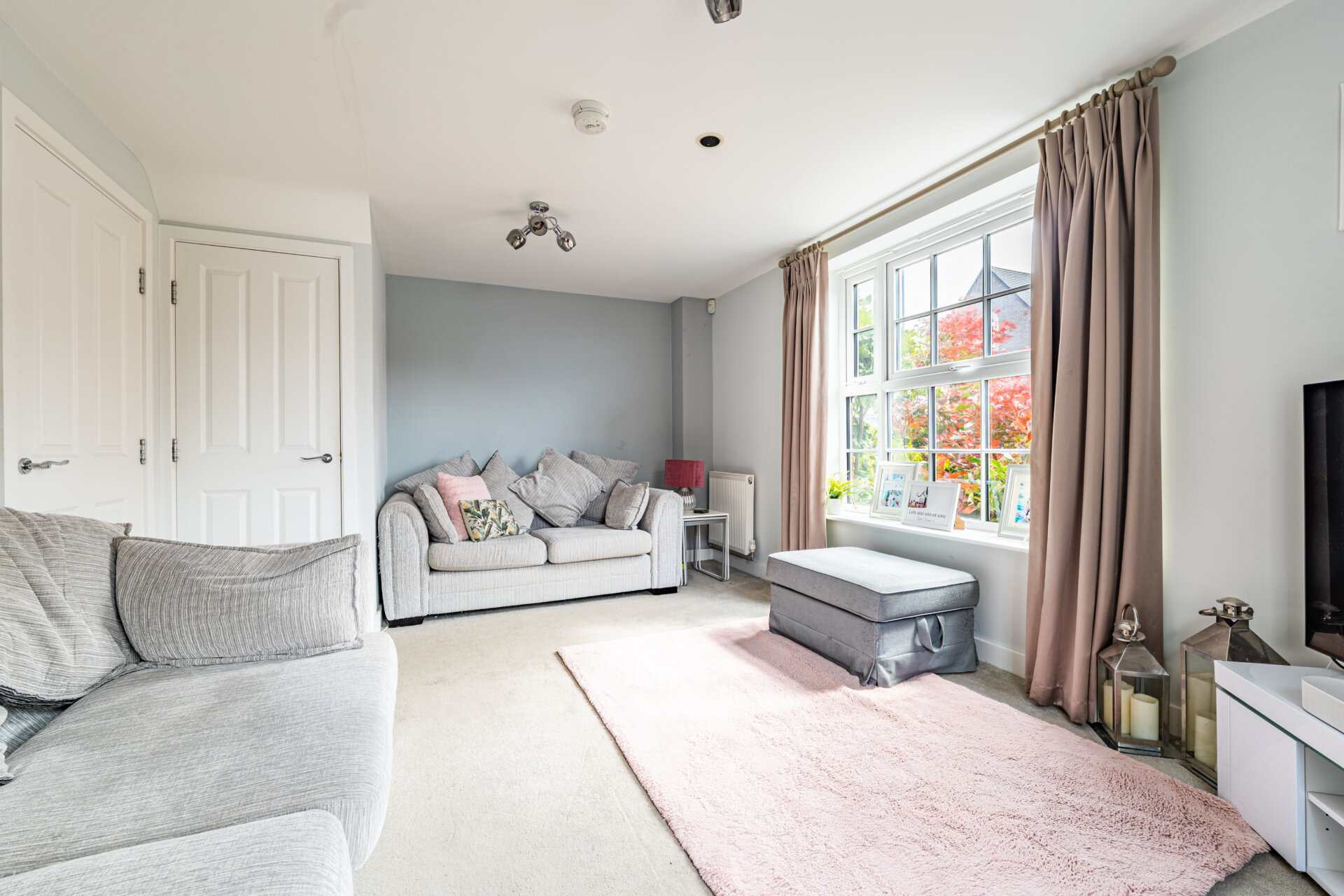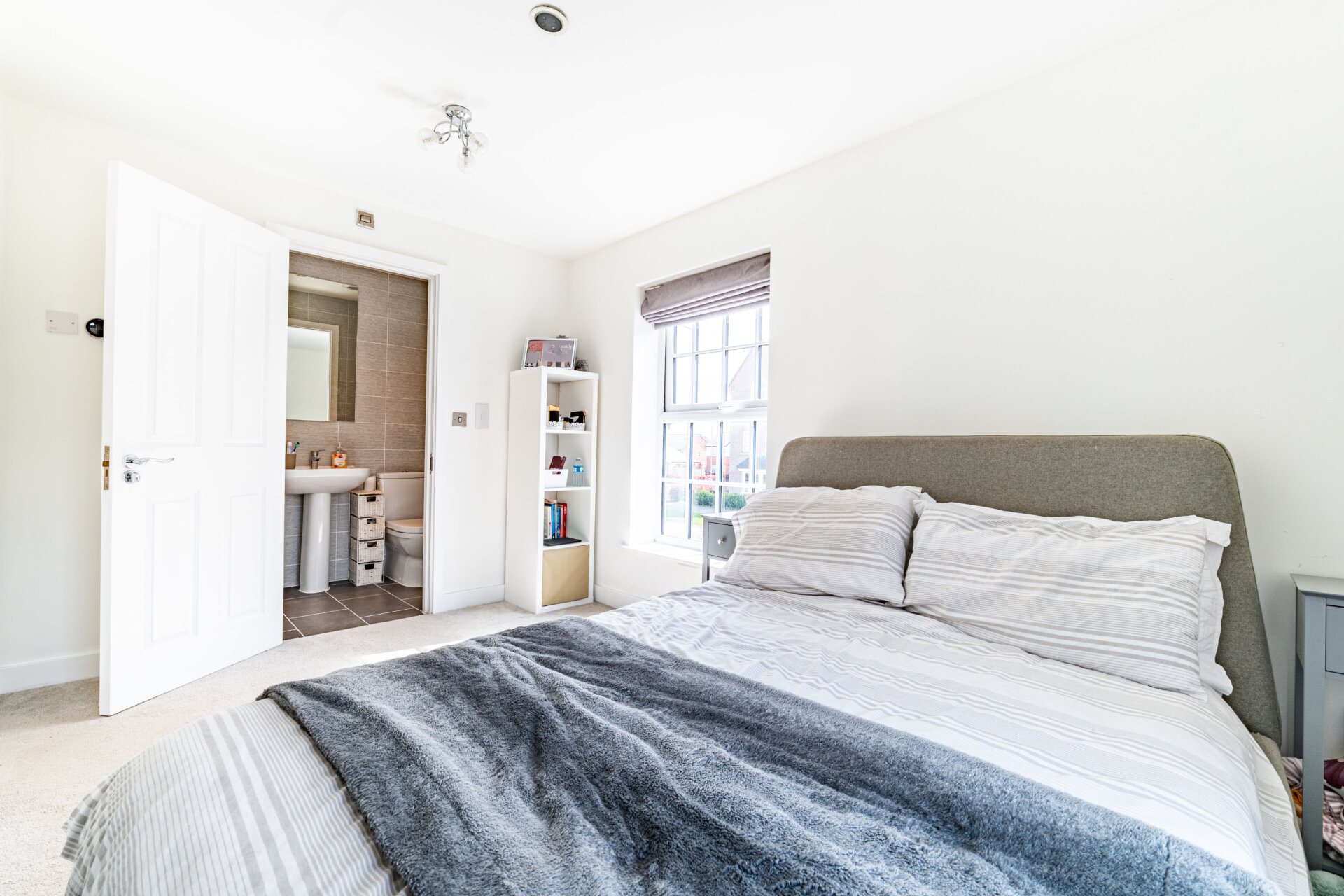 The ground floor is where you’ll find a bright open-plan kitchen diner, where French doors, flanked by two full-height windows, draw in an abundance of natural light and open onto a patio overlooking a private, mature garden. A dual-aspect living room provides a comfortable and versatile setting, while the high specification of a former show home is evident in the finer details, including built-in wardrobes to all three bedrooms and beautifully finished tiling throughout the kitchen and bathrooms. Additional storage is thoughtfully integrated, with cupboards located in the hallway, beneath the stairs and above the stairwell. Upstairs, three well-proportioned bedrooms are served by a modern four-piece family bathroom, with the principal bedroom benefitting from a well-appointed en-suite.