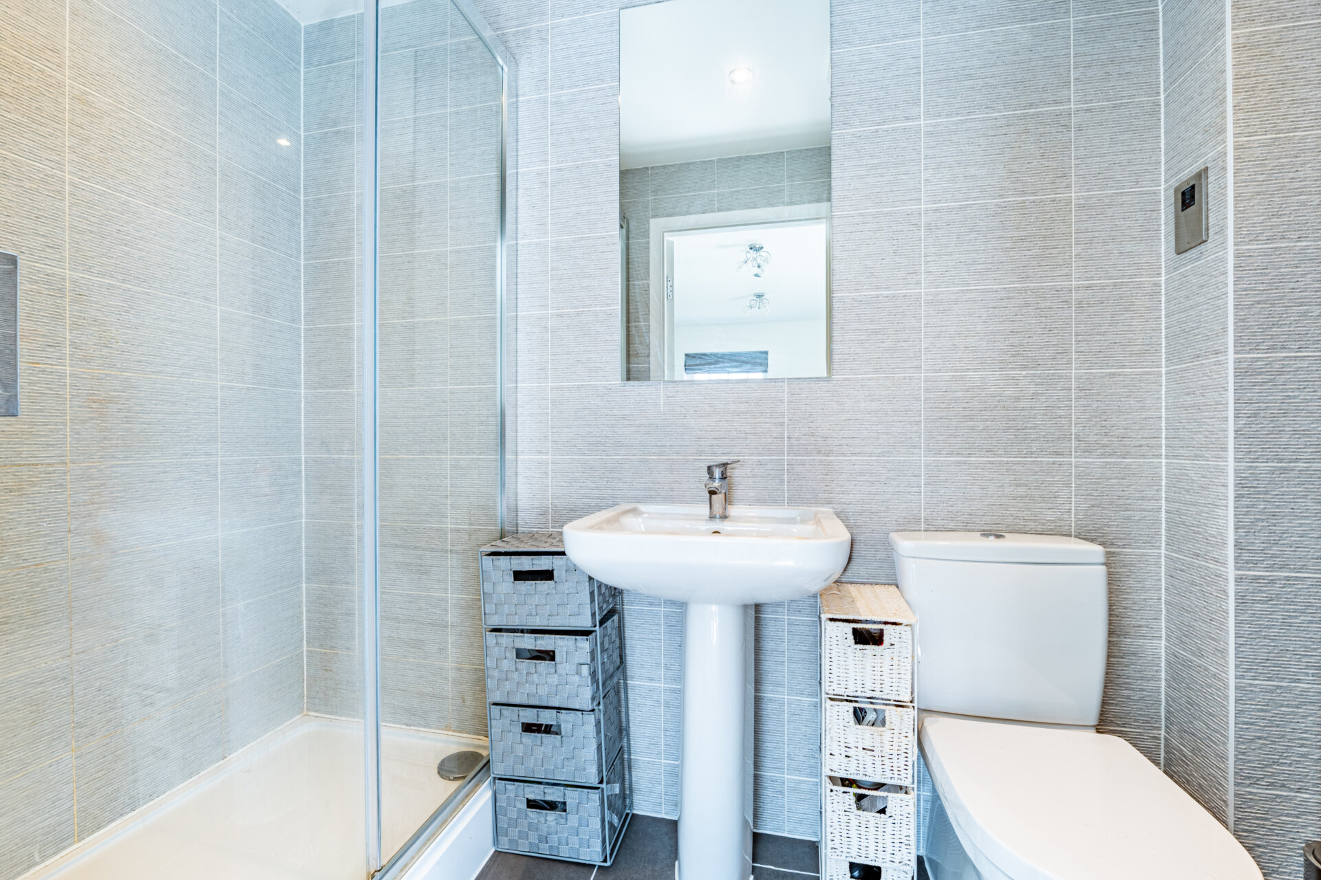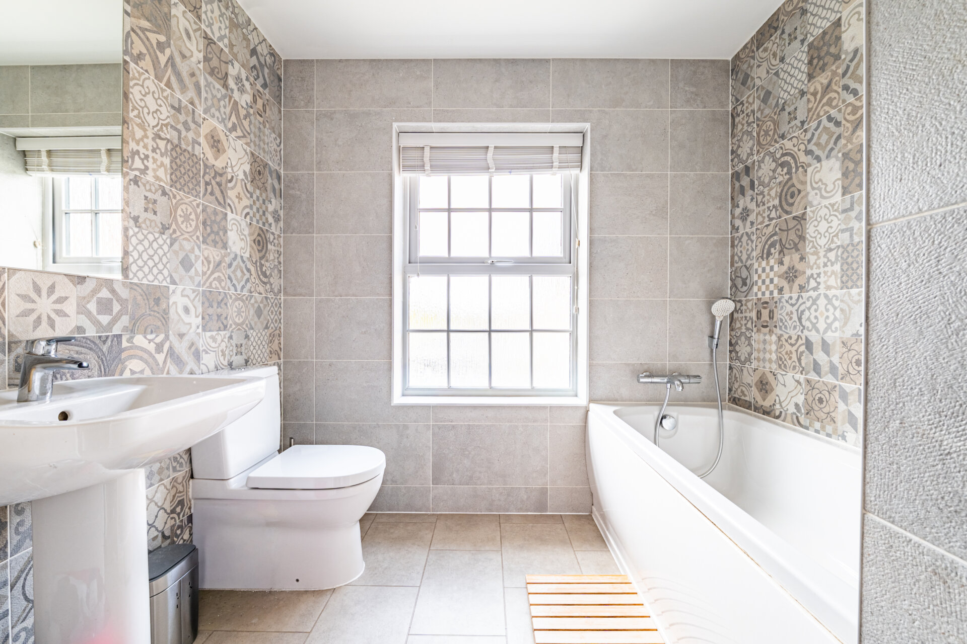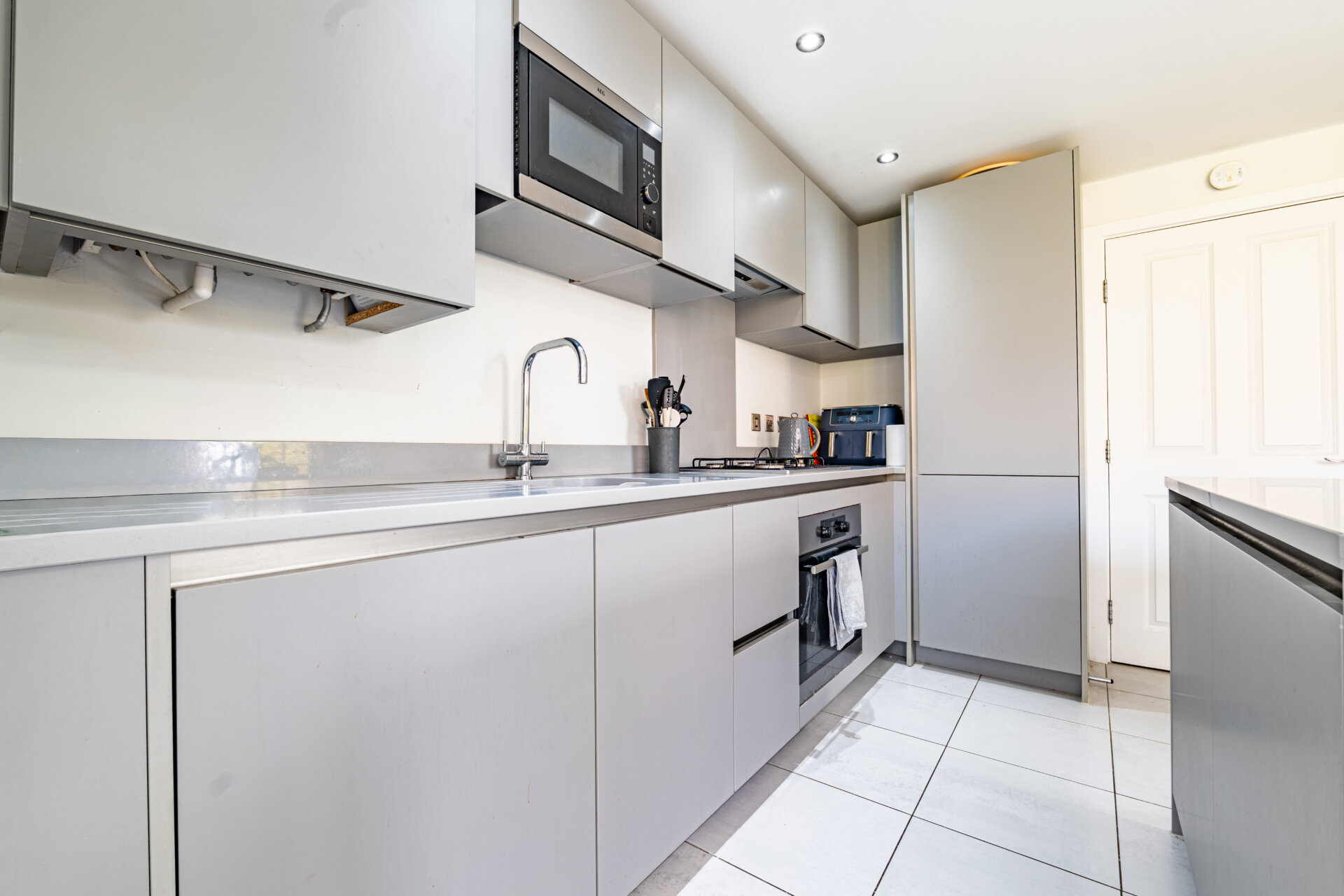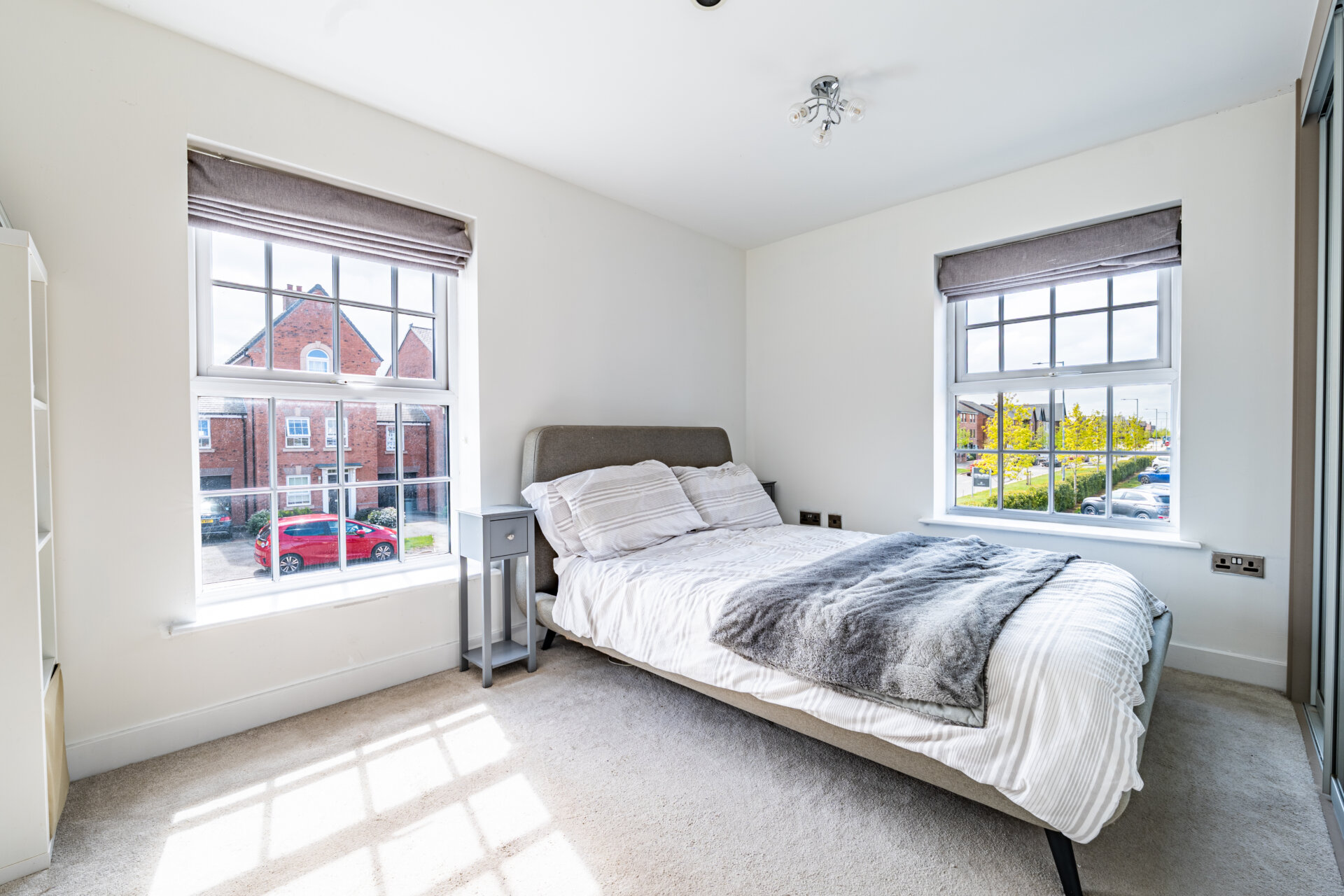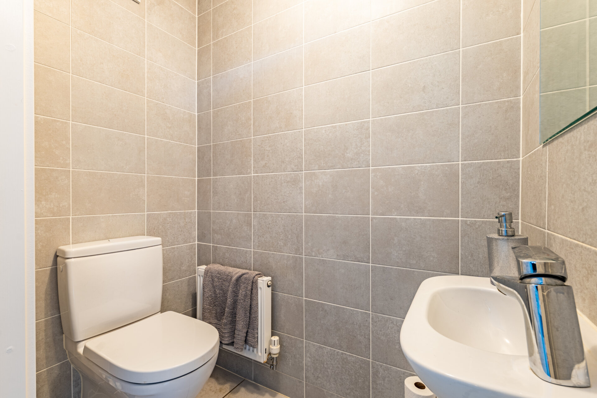 The ground floor is where you’ll find a bright open-plan kitchen diner, where French doors, flanked by two full-height windows, draw in an abundance of natural light and open onto a patio overlooking a private, mature garden. A dual-aspect living room provides a comfortable and versatile setting, while the high specification of a former show home is evident in the finer details, including built-in wardrobes to all three bedrooms and beautifully finished tiling throughout the kitchen and bathrooms. Additional storage is thoughtfully integrated, with cupboards located in the hallway, beneath the stairs and above the stairwell. Upstairs, three well-proportioned bedrooms are served by a modern four-piece family bathroom, with the principal bedroom benefitting from a well-appointed en-suite.