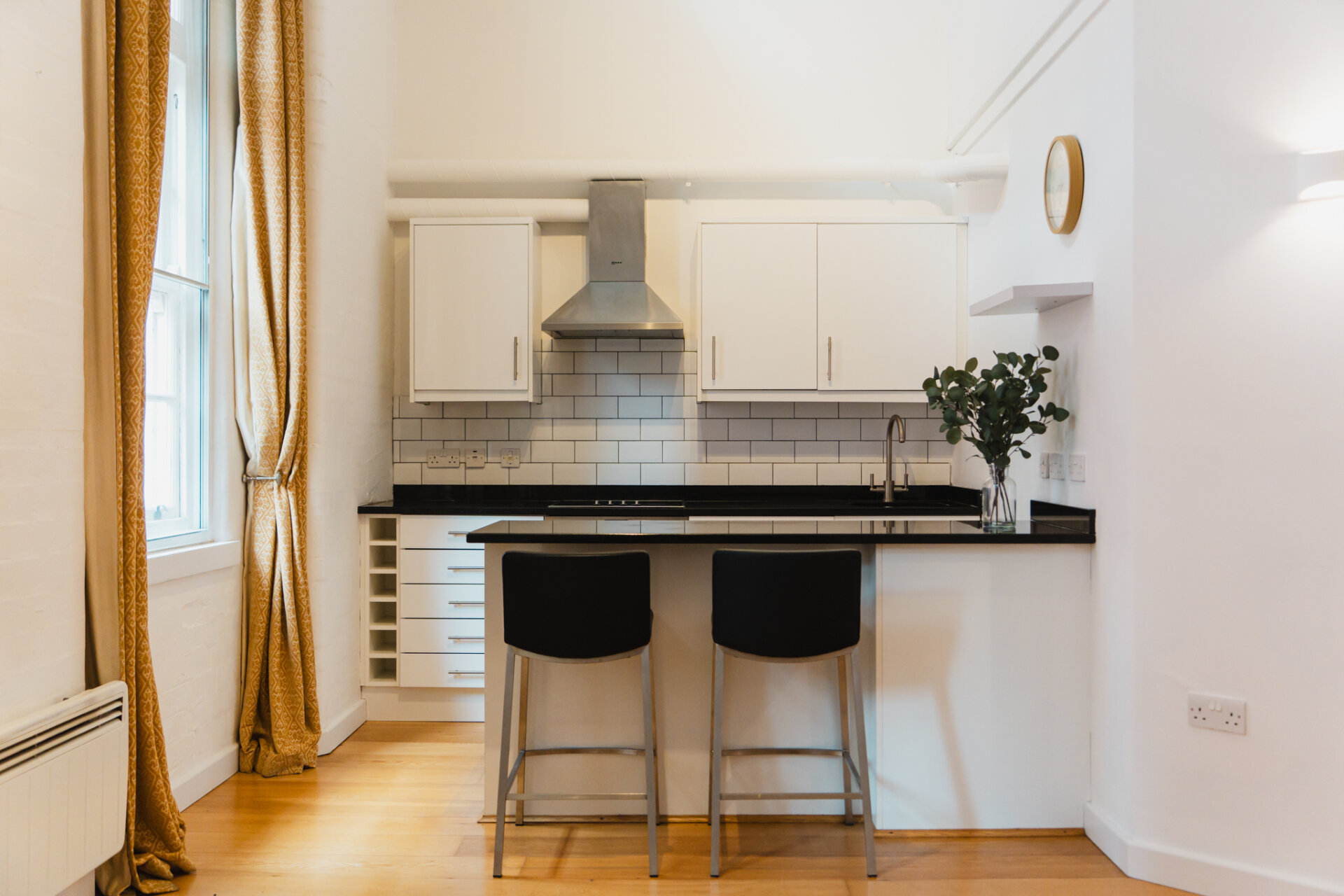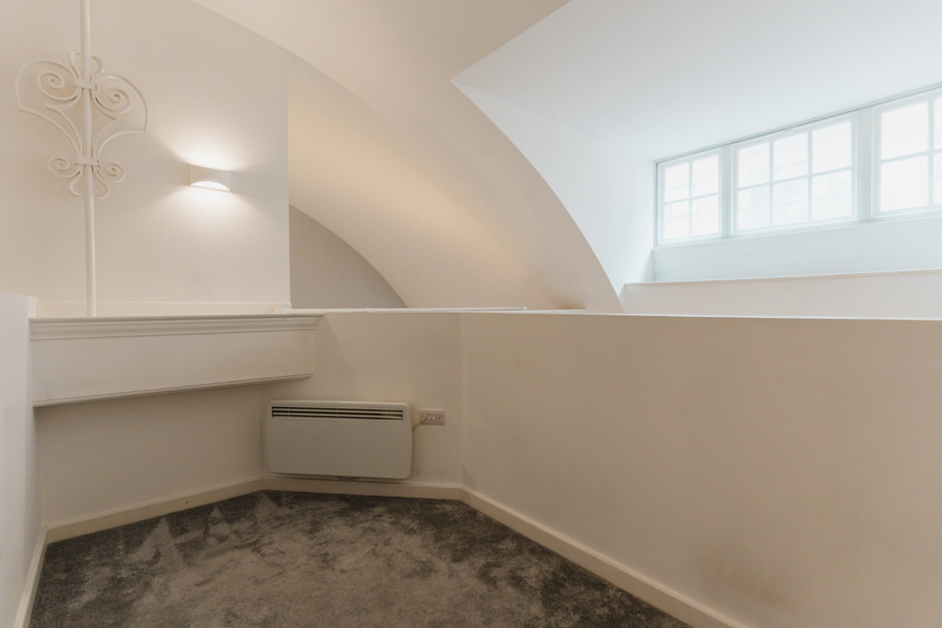 The apartment itself extends to over 540 sq ft and has been arranged with a quiet elegance, balancing lofty industrial proportions with soft modern finishes. A voluminous, open-plan living space is illuminated by full-height glazing and original sash windows, the latter subtly enhanced with secondary glazing for acoustic and thermal comfort. French doors open onto a private Juliet balcony, drawing fresh air and urban views into the heart of the plan. At one end, the kitchen is neatly composed of glossy cabinetry and granite worktops, with integrated appliances concealed behind sleek façades. Above, a cleverly conceived mezzanine introduces a study space suspended in the double-height void, a perfect vantage for quiet contemplation or work. The bedroom is a peaceful double, with tall ceilings and generous proportions with a walk-in dressing room, while the bathroom is simply appointed in a palette of soft neutrals, with a shower above the bath and elegant chrome fittings.