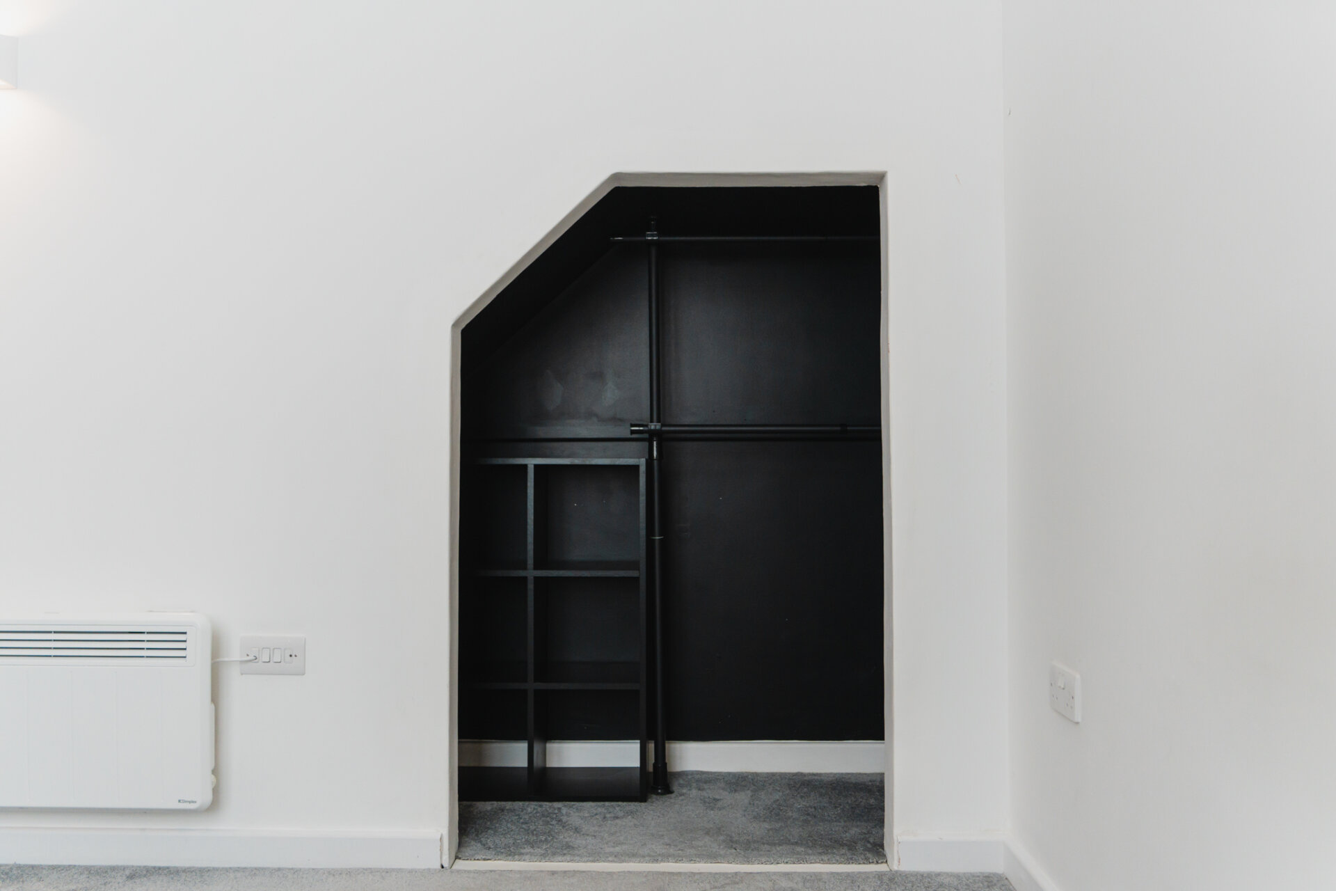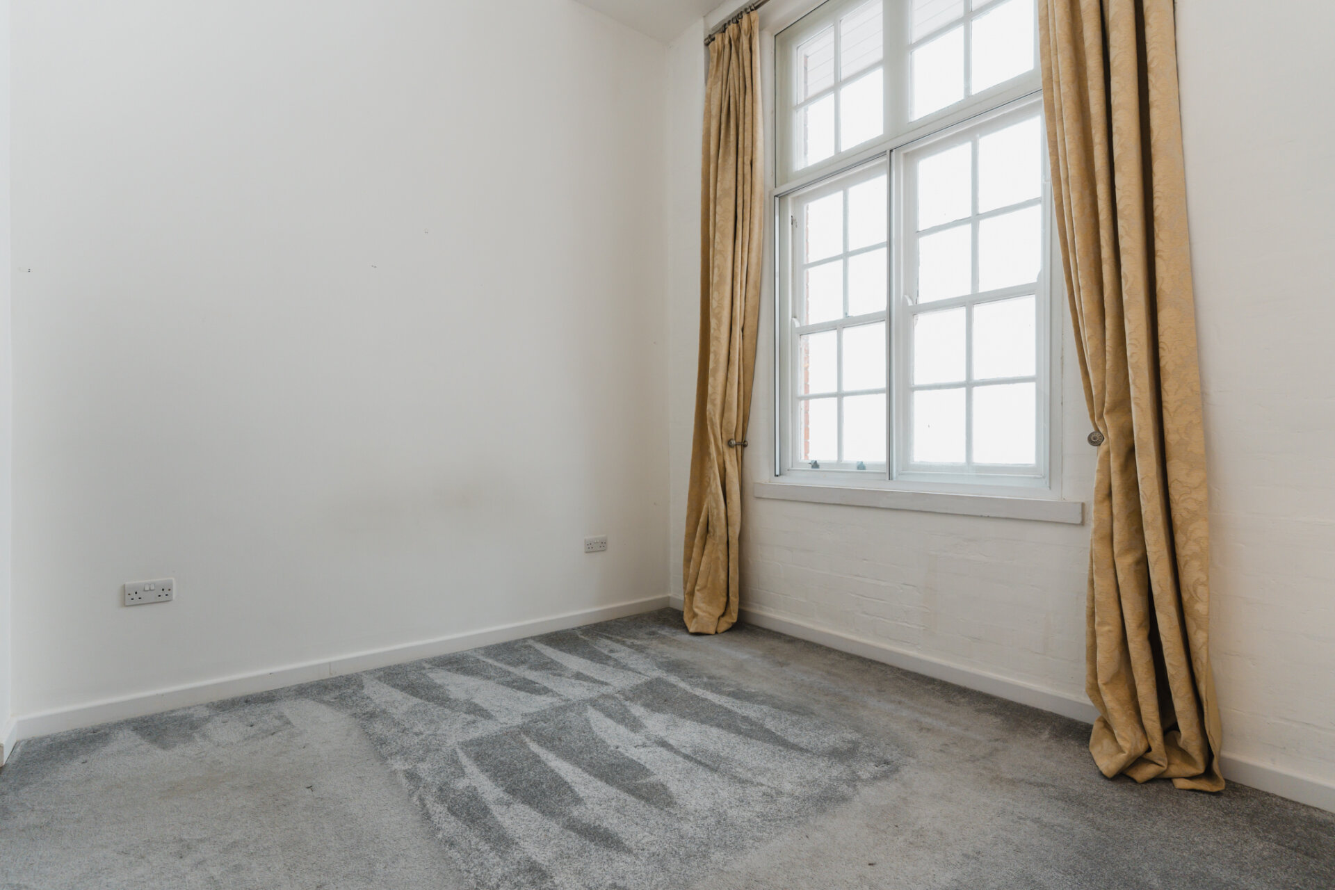 Occupying the first floor of a handsome former knitwear factory in Leicester’s thriving Cultural Quarter, this one-bedroom apartment forms part of a sensitive conversion of the historic Cherub Works, once home to the renowned Foister manufacturing company. Set behind a smart red-brick façade with tall sash windows, the building has been thoughtfully repurposed, preserving much of its late Victorian integrity while introducing contemporary comfort across eleven carefully considered dwellings.