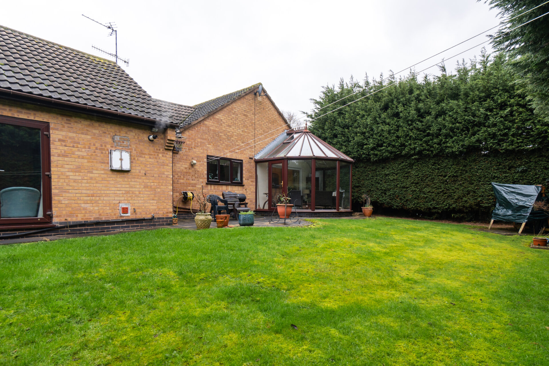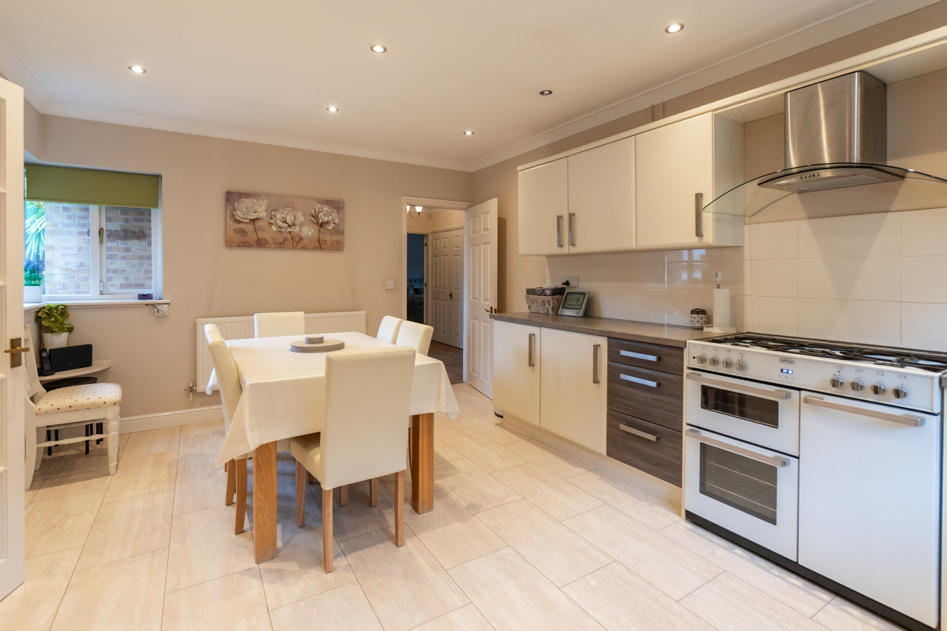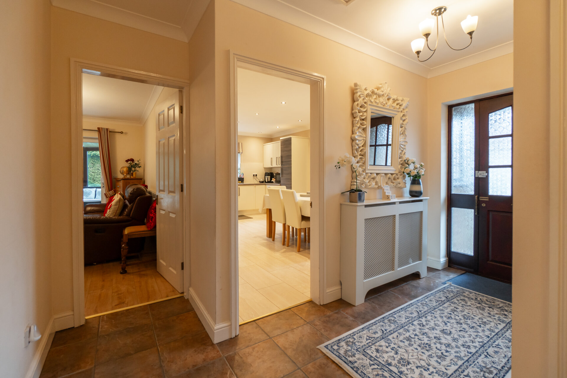At the centre of the home, a newly refurbished kitchen and dining room forms the primary social space, arranged to accommodate both daily use and larger gatherings. Sightlines extend into the adjacent lounge, creating a gentle continuity between spaces, while a discreet utility room sits to the rear, keeping practical functions out of view. The lounge is well proportioned and opens directly into the conservatory, which extends across the rear elevation. This light-filled room mediates between house and garden, offering a flexible setting for dining, reading or cultivation.