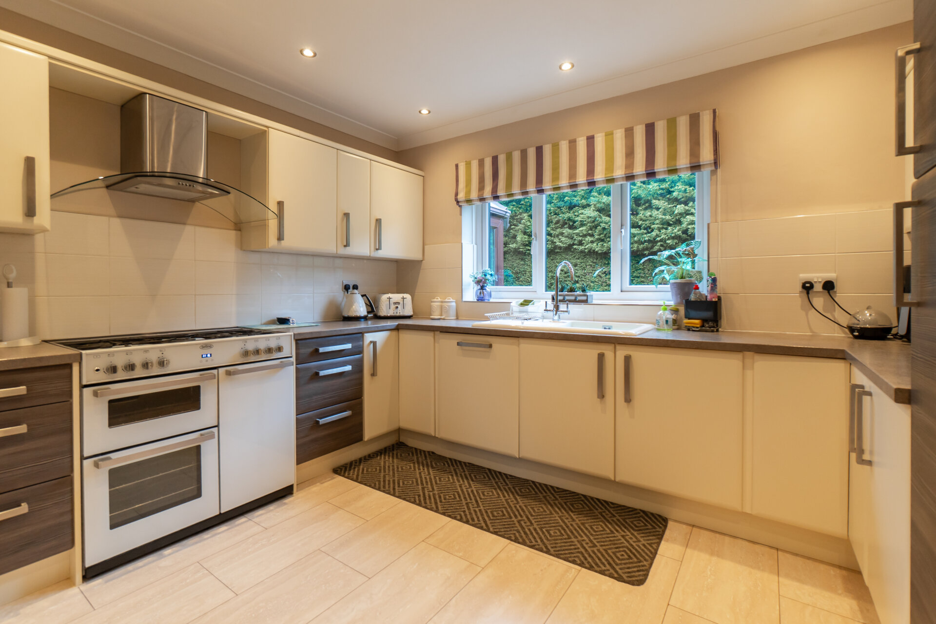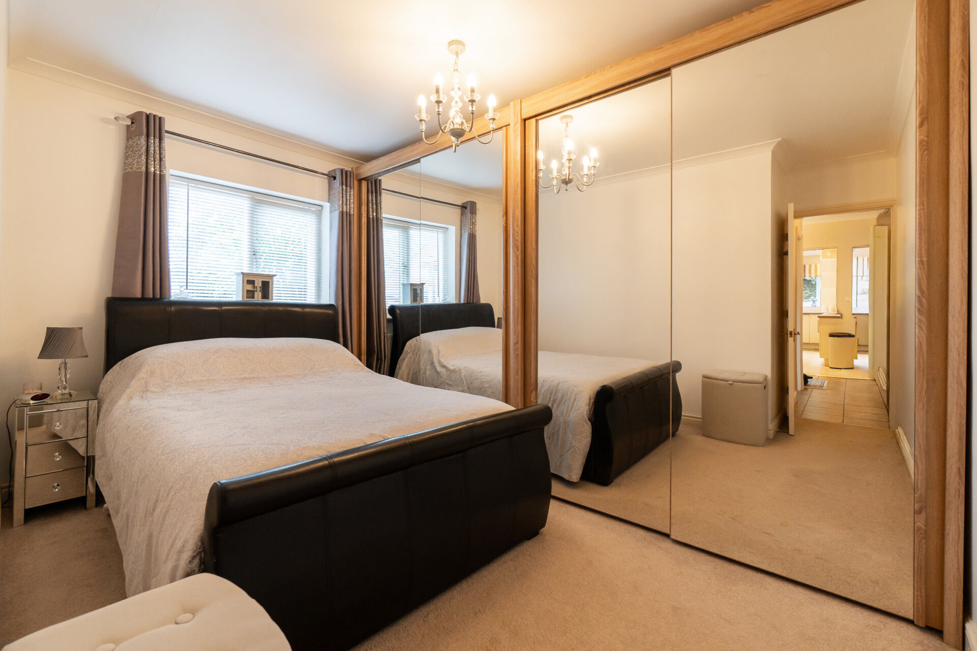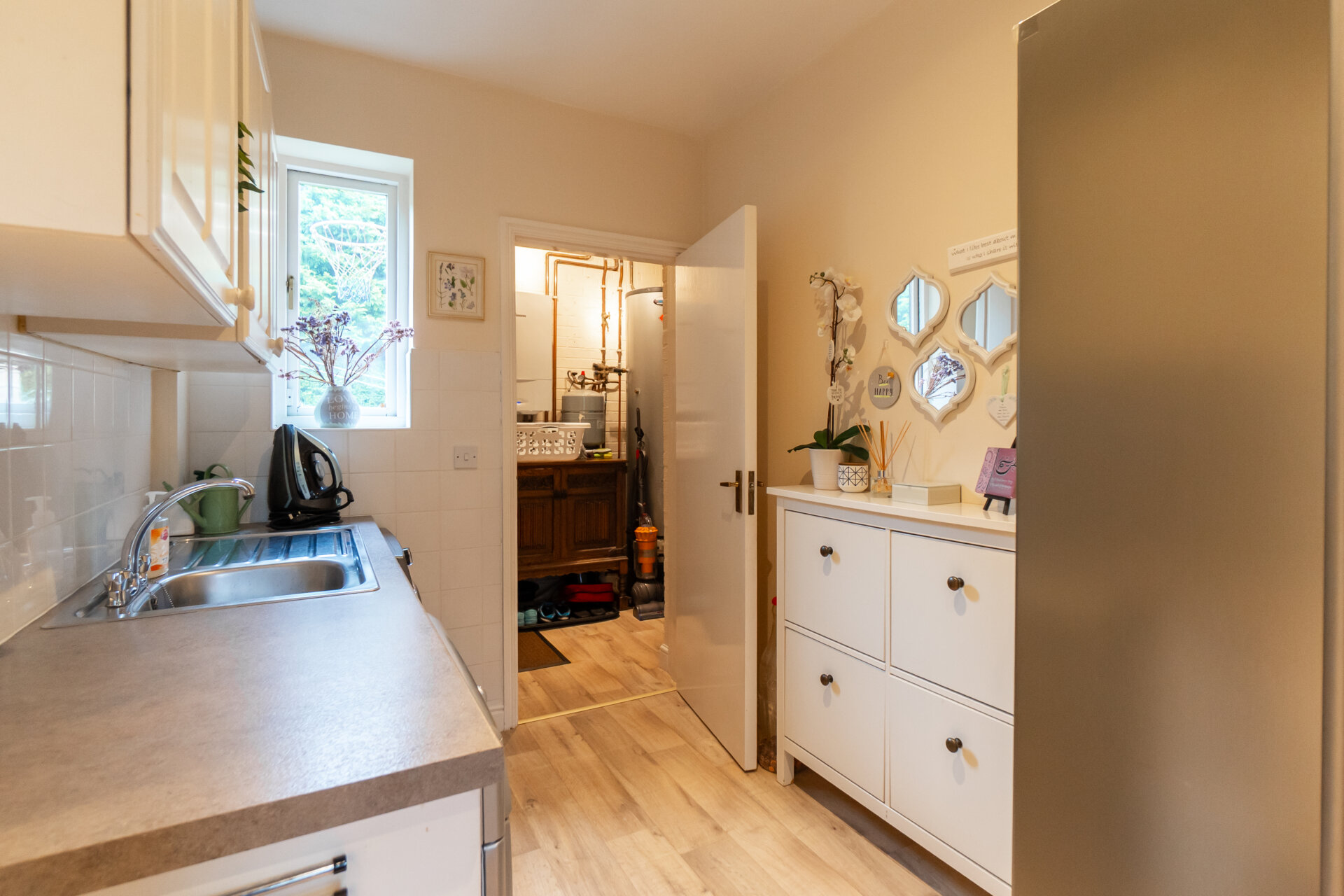 At the centre of the home, a newly refurbished kitchen and dining room forms the primary social space, arranged to accommodate both daily use and larger gatherings. Sightlines extend into the adjacent lounge, creating a gentle continuity between spaces, while a discreet utility room sits to the rear, keeping practical functions out of view. The lounge is well proportioned and opens directly into the conservatory, which extends across the rear elevation. This light-filled room mediates between house and garden, offering a flexible setting for dining, reading or cultivation.
