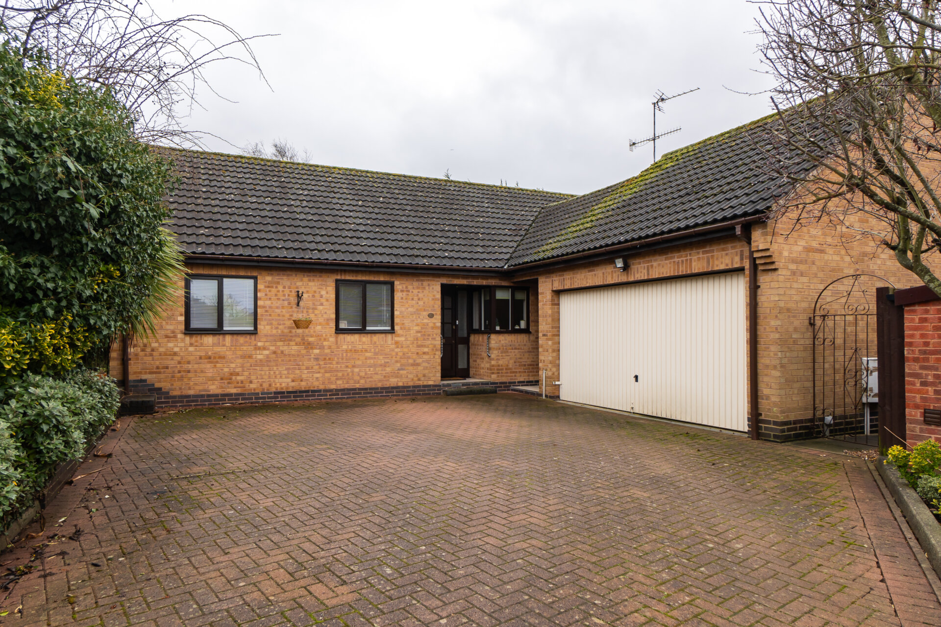 Externally, the house is wrapped by a private and well-established garden, with mature planting and shrubbery creating a strong sense of seclusion from neighbouring properties. A sweeping driveway leads to a garage, providing ample off-street parking and storage.