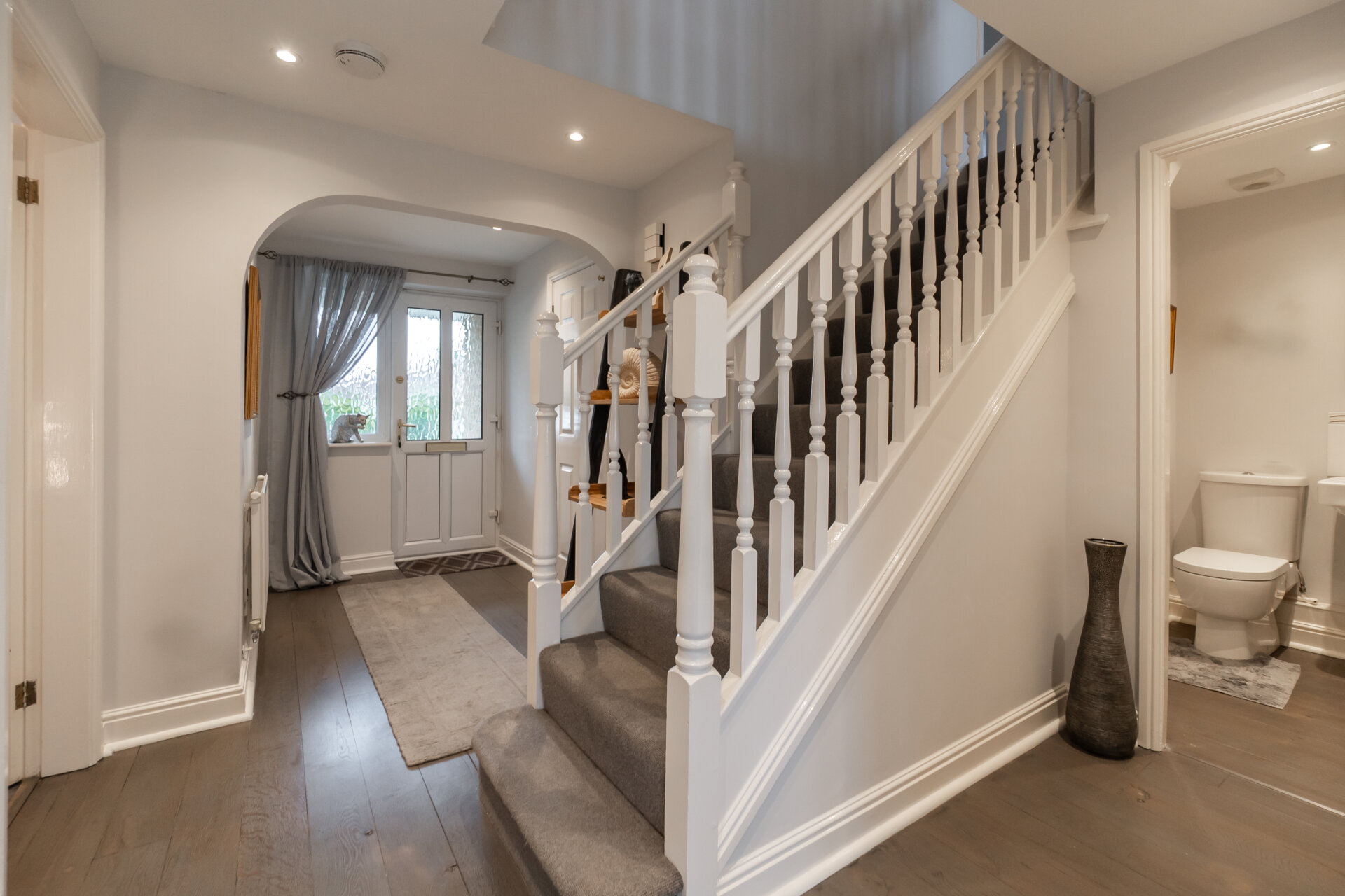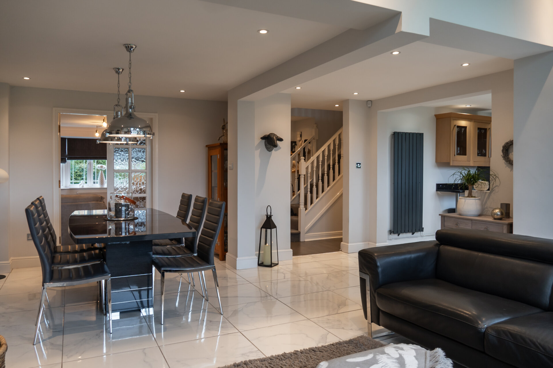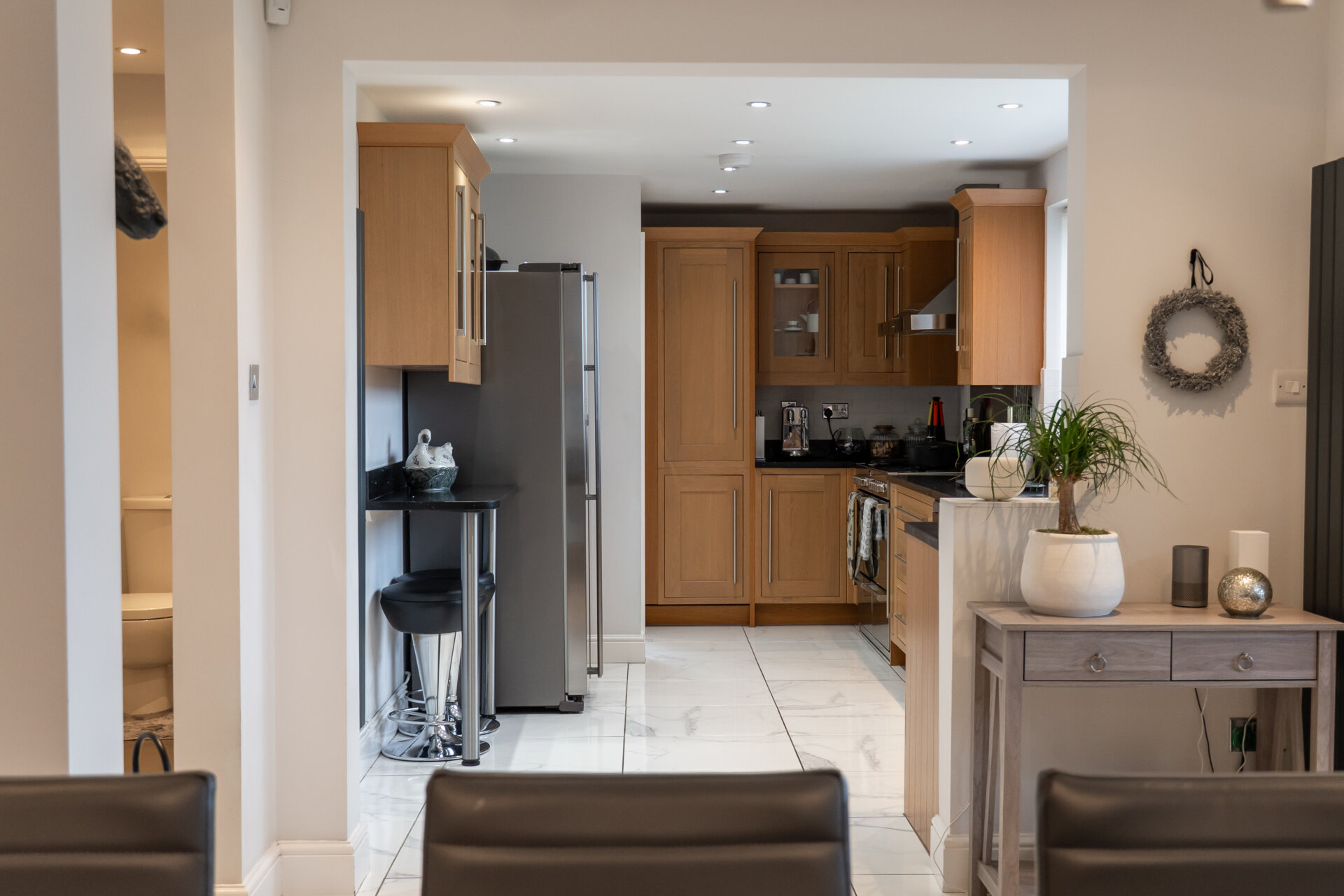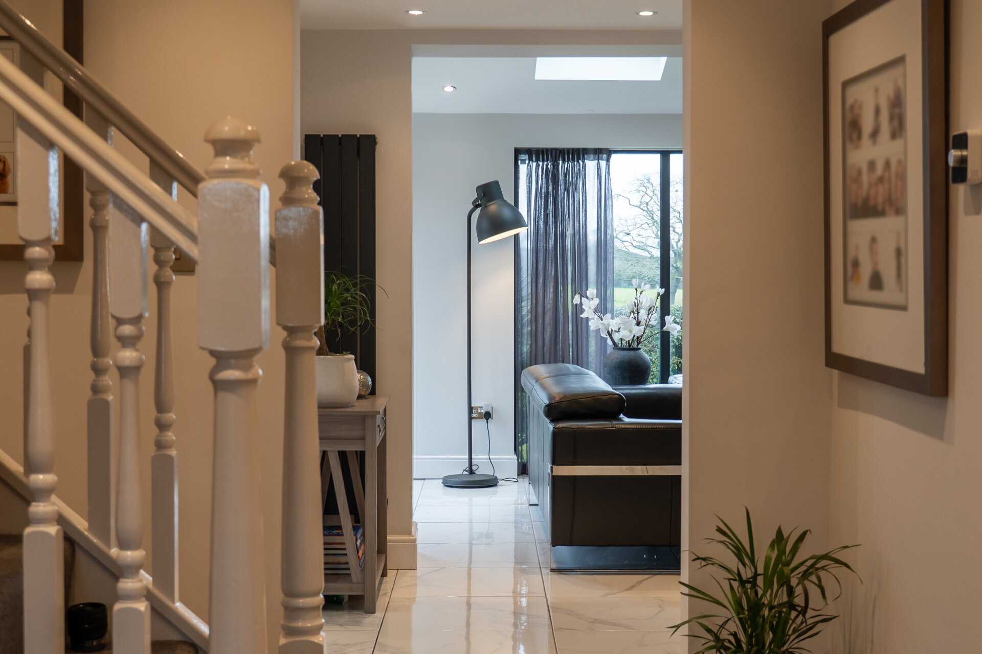 You step into a welcoming entrance hall which immediately sets the tone - bright, spacious and finished to a high standard. From here there is access to the double integral garage, a contemporary guest cloakroom and the main staircase rising to the first floor. Your eye is naturally drawn through towards the rear of the property where the open plan extension and field views beyond create an immediate impact.