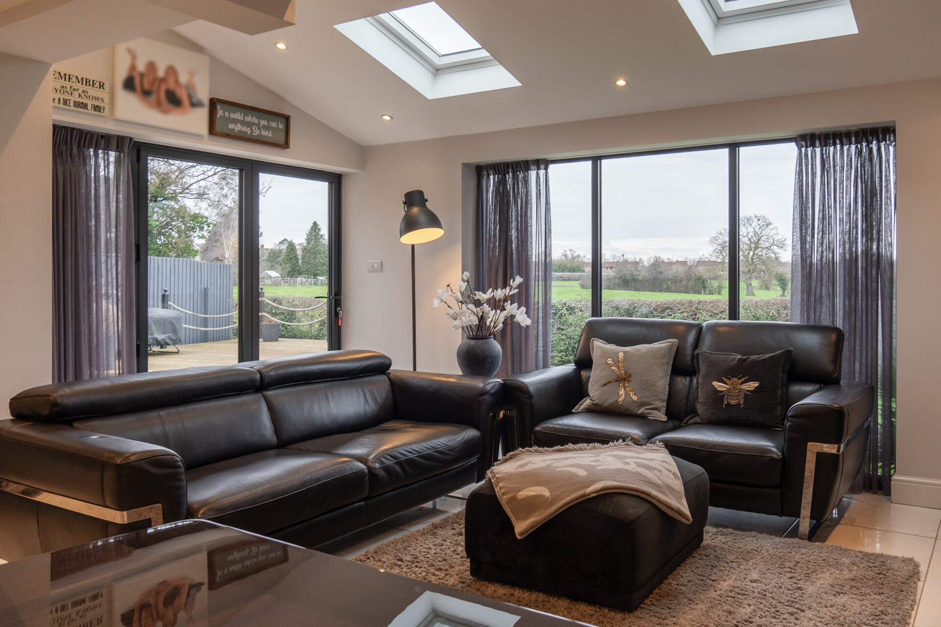 Undoubtedly the heart of the home is the extended open plan living dining kitchen, stretching to approximately 34ft at its widest point. This is a superb everyday family space as well as an exceptional entertaining area. Sleek fitted units provide generous storage and preparation space, with flexibility for appliance choice, while skylights, picture windows and bi-fold doors frame the landscaped garden and open fields beyond. Morning light pours in, and the changing seasons provide a constant backdrop. To the side, a practical utility room with its own external access offers the perfect everyday entrance after countryside walks.