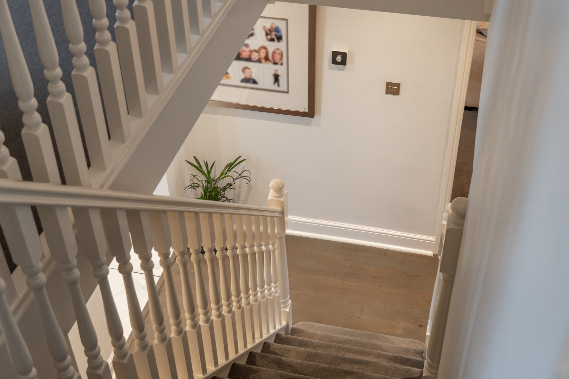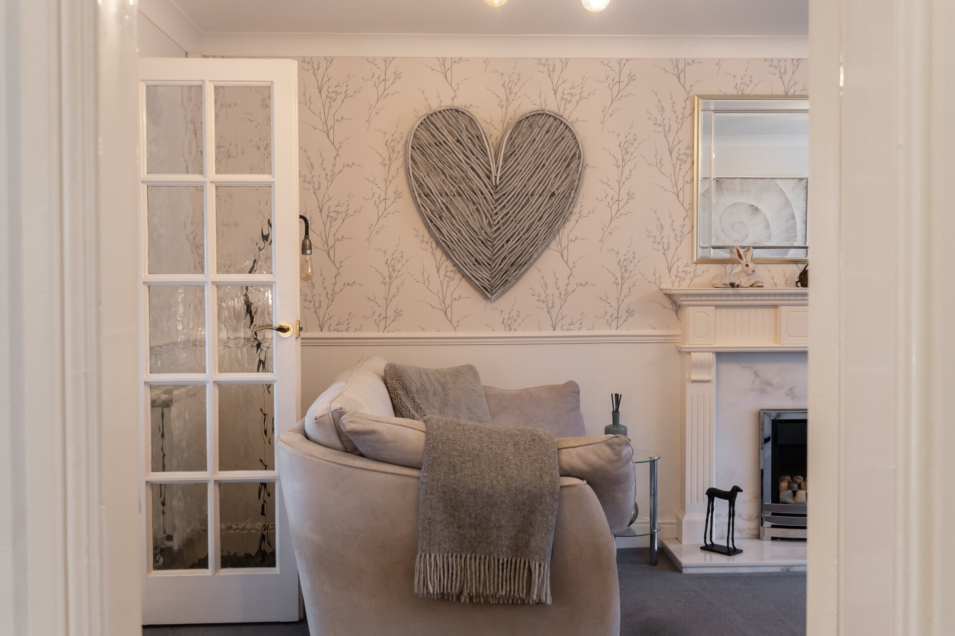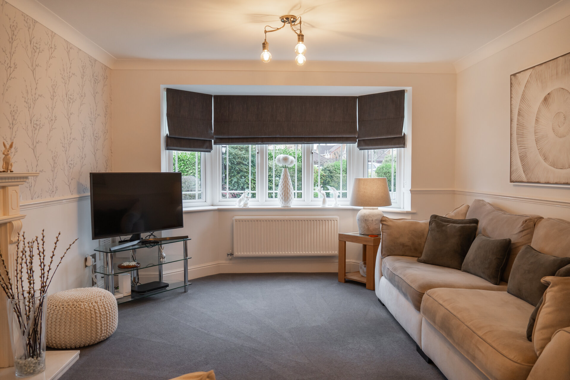 The sitting room is positioned to the front and provides a more intimate reception space, centred around a living flame gas fire and bay window which floods the room with natural light. Double doors allow the room to open through to the main living space, or be closed off when a quieter setting is preferred.