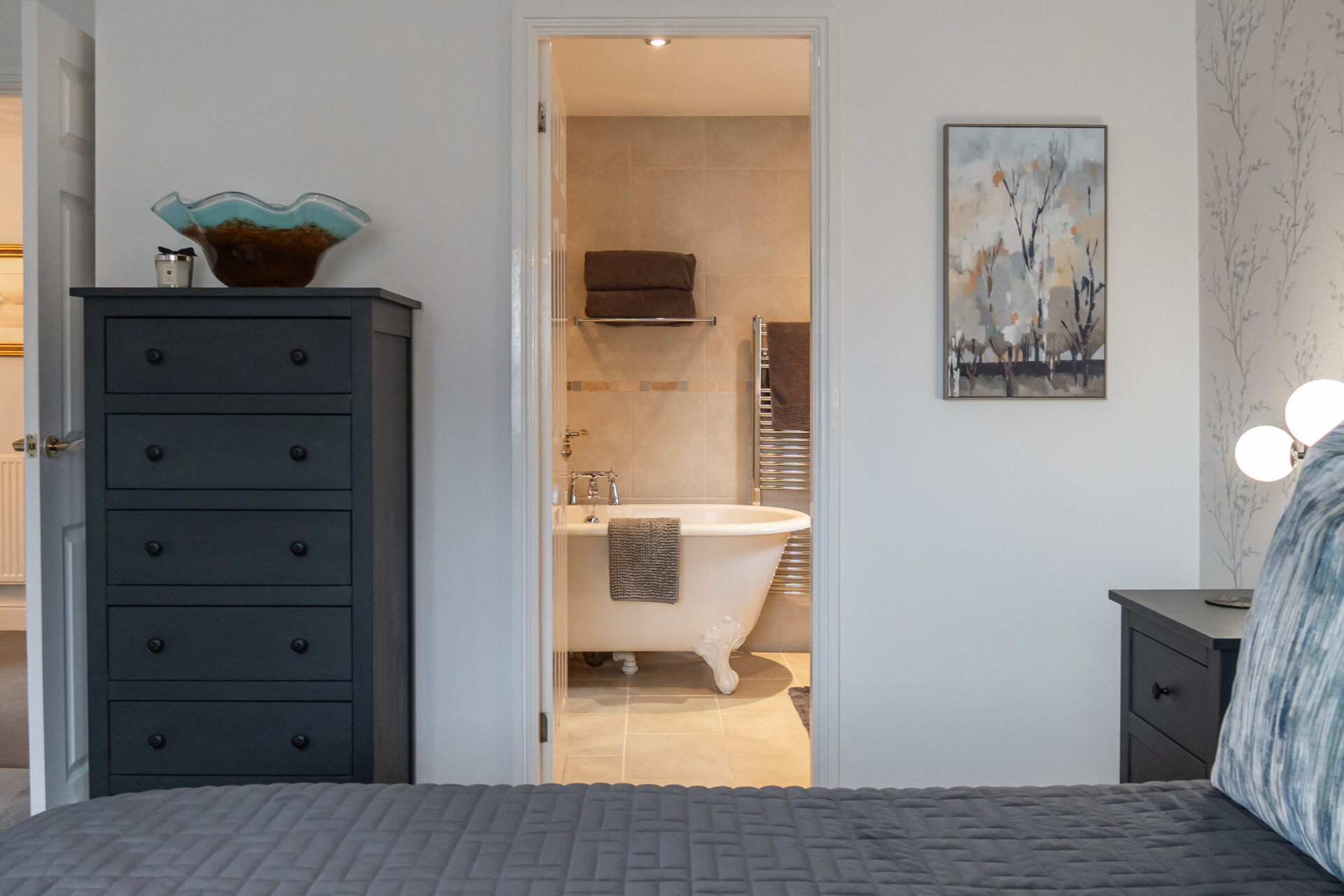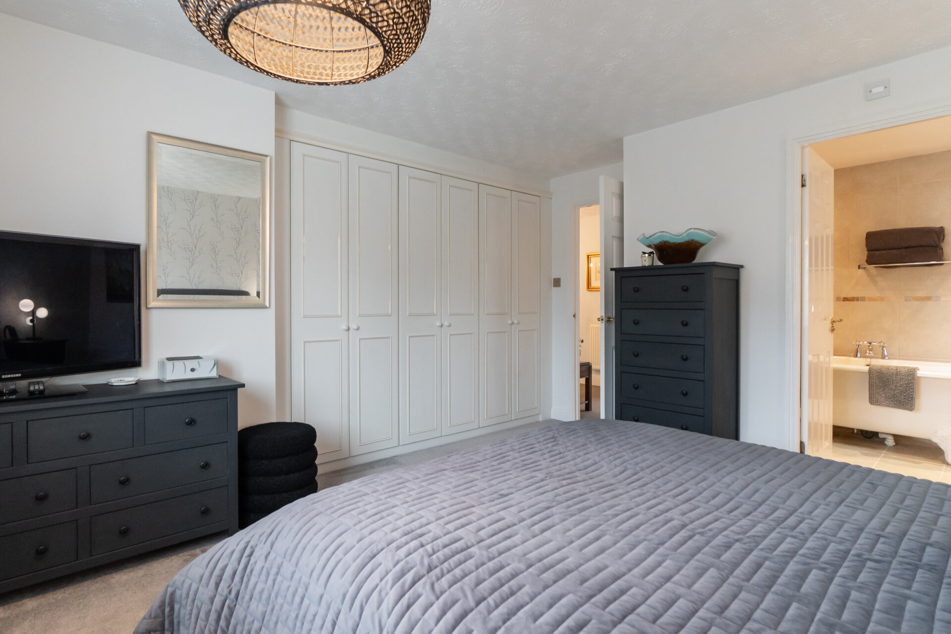 Upstairs, the sense of space continues from a galleried landing. The principal bedroom is generously proportioned, complete with fitted wardrobes and a refitted ensuite featuring a roll top claw and ball bath along with a separate shower. There are four further double bedrooms, all with fitted storage, one currently arranged as a home office. Bedrooms to the rear enjoy the open field views, while the family bathroom has been stylishly updated and includes a spa bath.