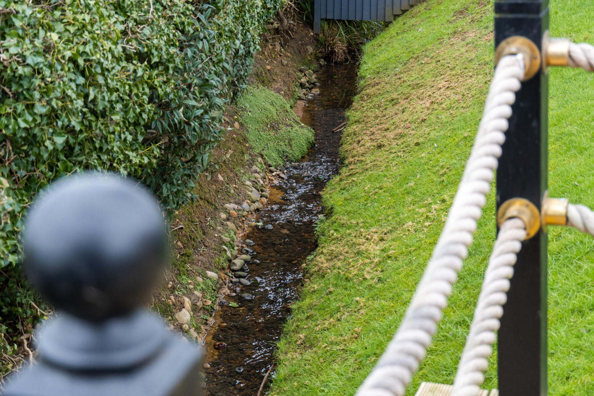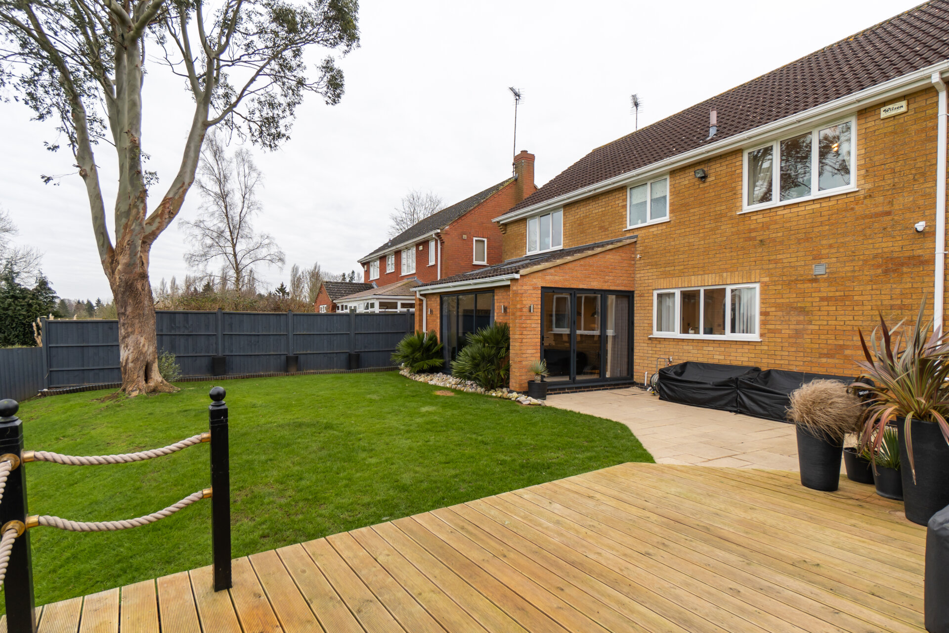Outside, a double width driveway provides ample off road parking and leads to the double integral garage with twin up and over doors and internal access to the house. The garage itself offers excellent storage and, subject to the necessary approvals, could be converted to further accommodation if desired. The front garden is mainly laid to lawn and offers potential to create additional parking if required. Gated side access leads through to the rear garden, which has been thoughtfully landscaped forming one of the main features of this property, with raised timber decked seating area positioned to take full advantage of the views and the gentle sound of the brook below. There is a manicured lawn with mature tree taking centre stage. And a further full width paved patio hugs the rear of the property extending from the side access. The gardens are private and peaceful.