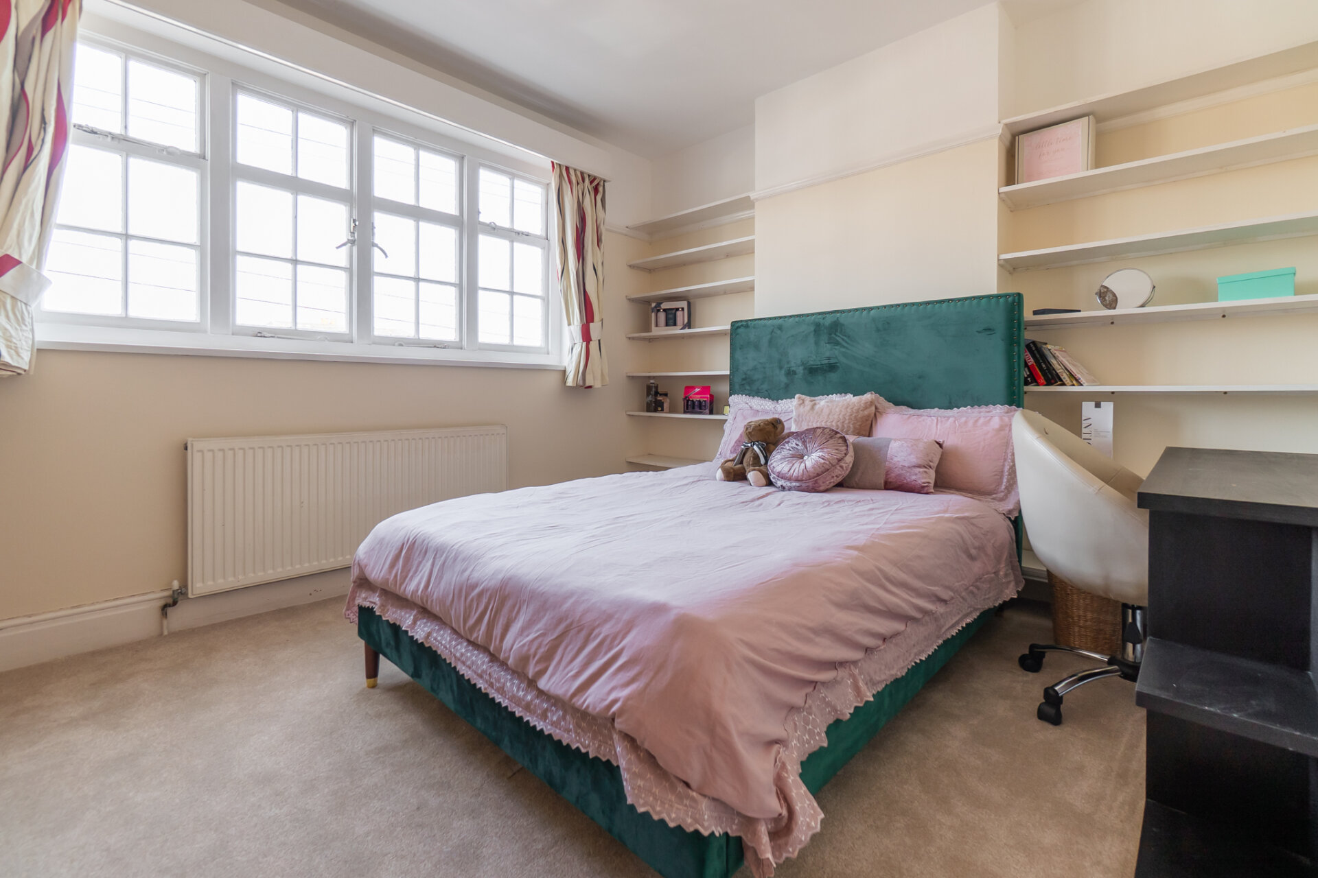 A second reception room sits to the right, offering a wonderfully versatile living space with dual-aspect views across both the front and rear gardens. A feature fireplace once again takes centre stage, while original details such as the picture rail subtly reinforce the home’s period integrity.