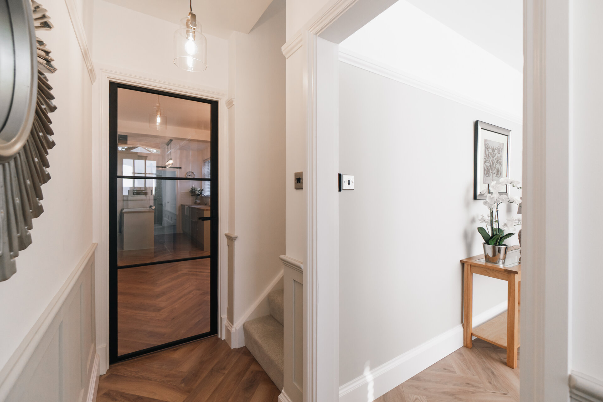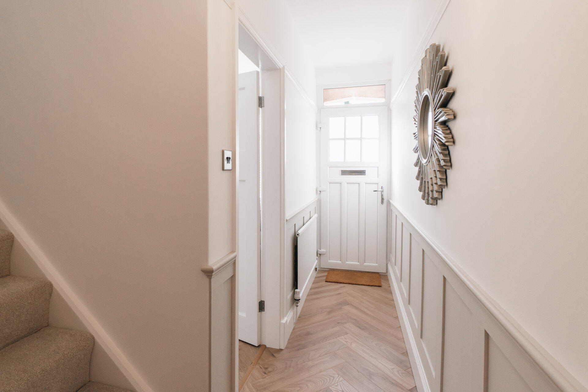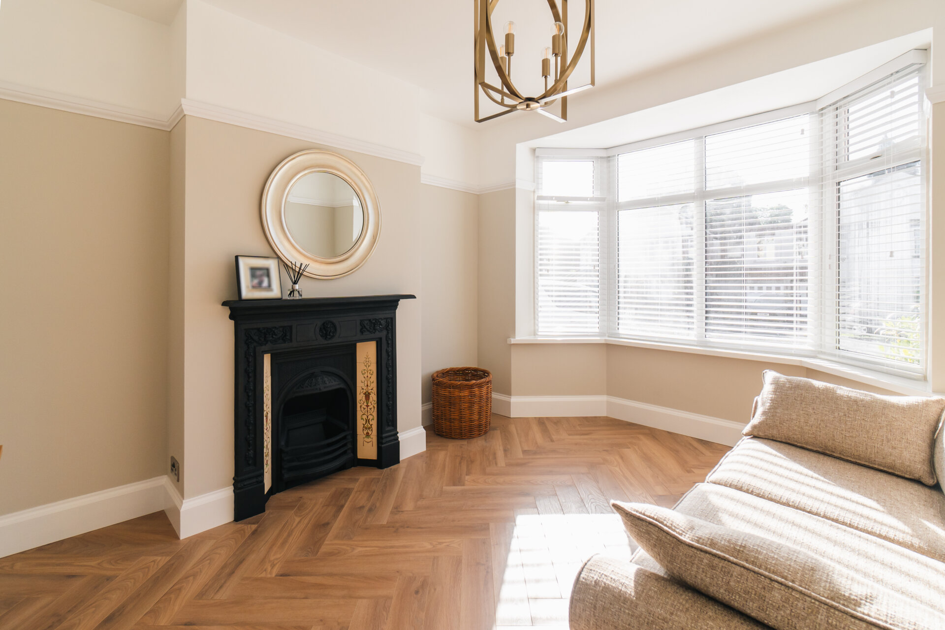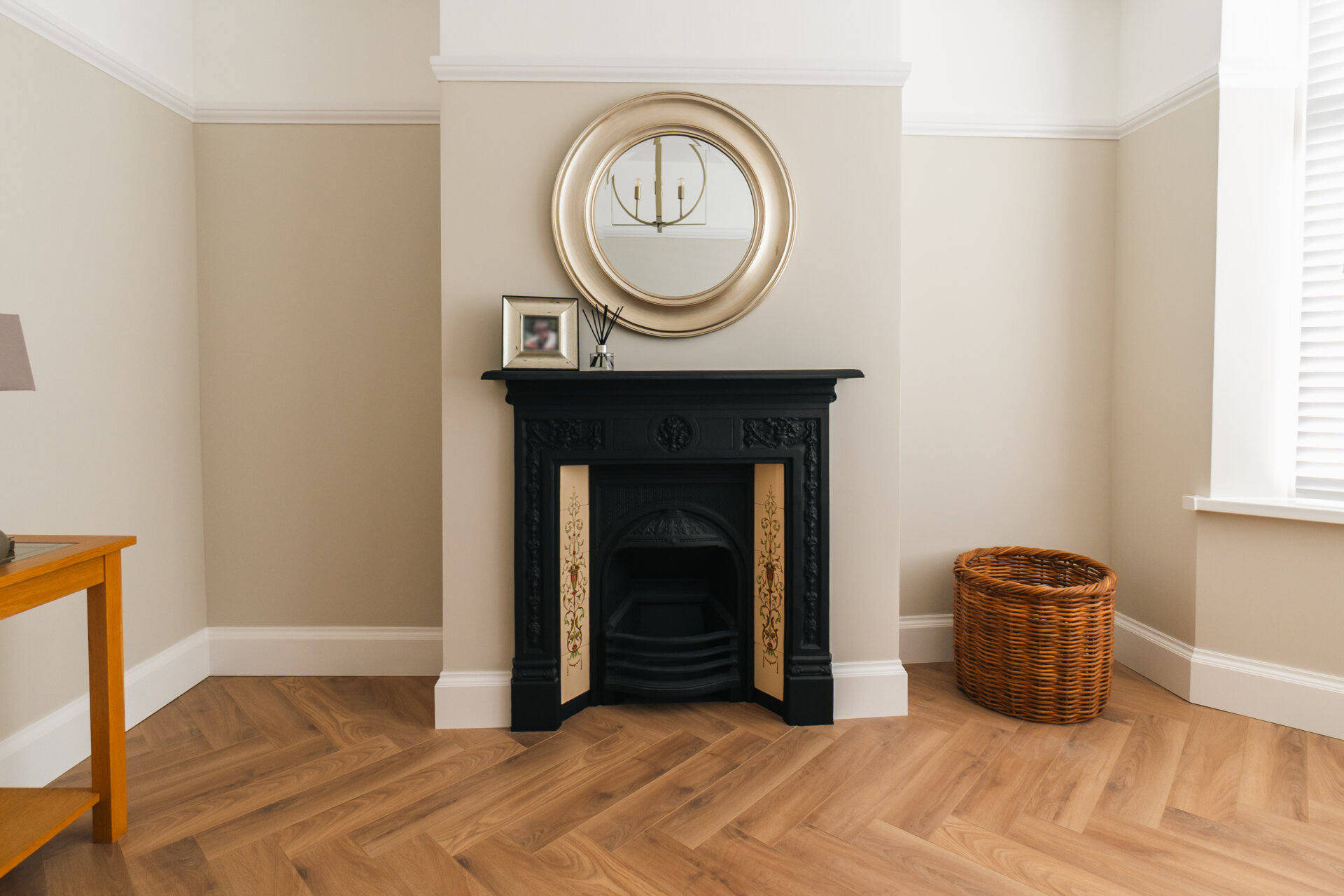 Upon entering, the hallway boasts feature panelling and herringbone wooden floors, creating a warm and inviting ambience throughout. The front reception room is adorned with a decorative fireplace and a bay window that bathes the space in natural light.