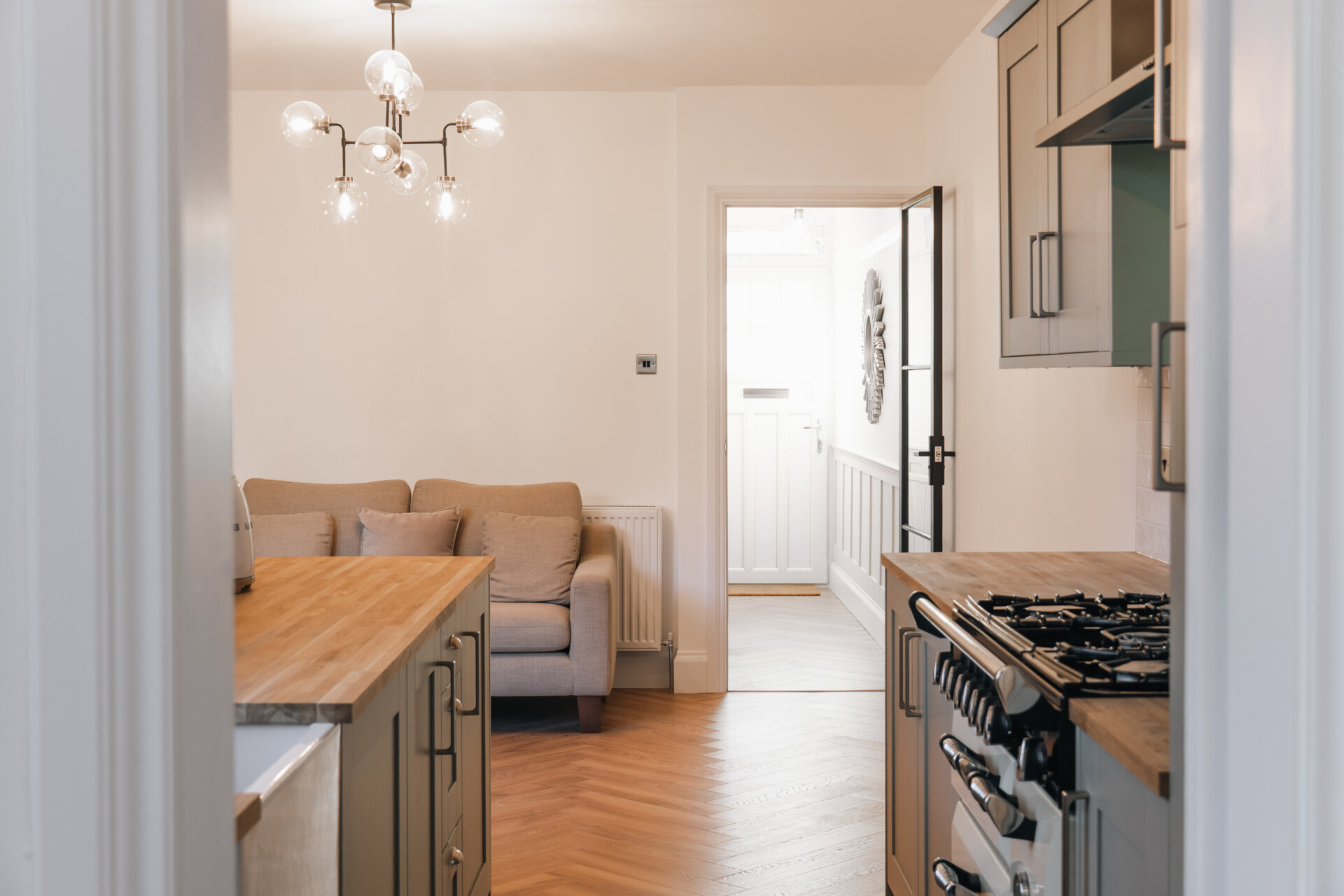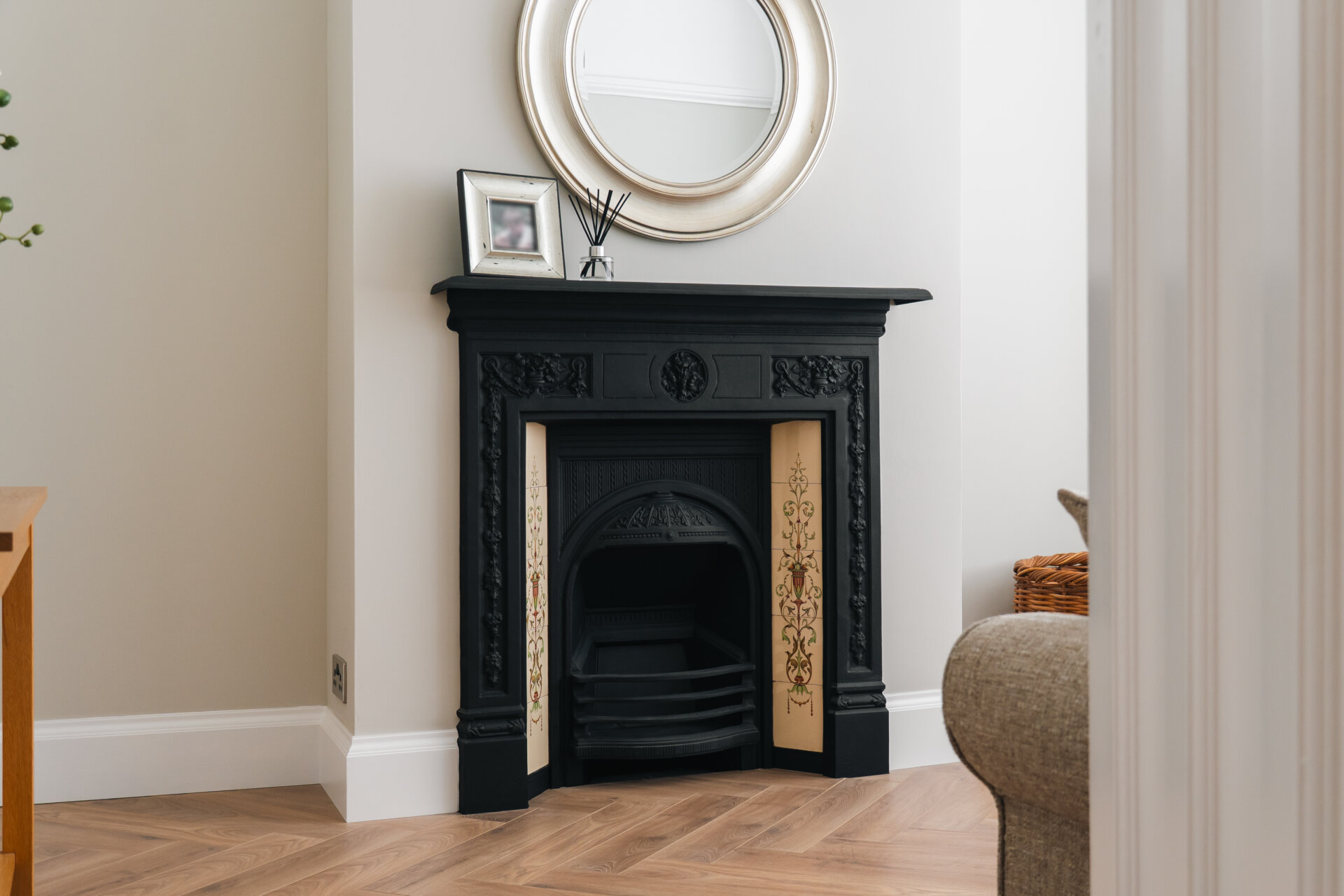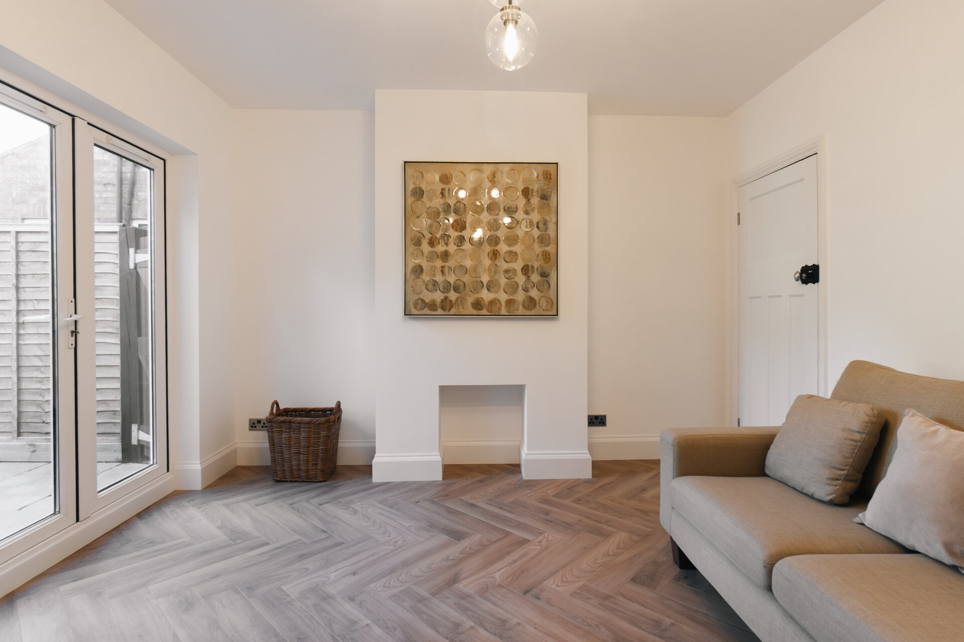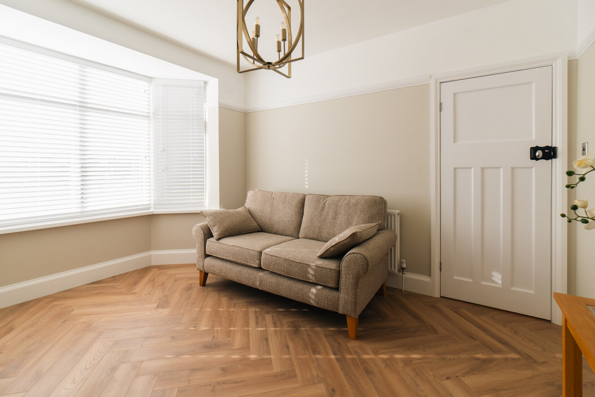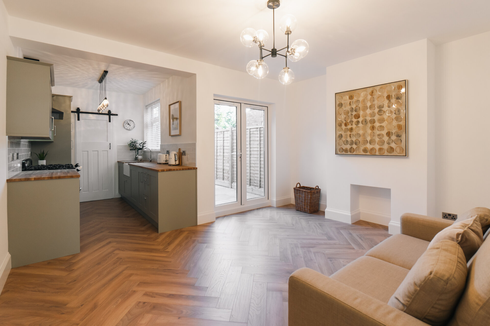 Upon entering, the hallway boasts feature panelling and herringbone wooden floors, creating a warm and inviting ambience throughout. The front reception room is adorned with a decorative fireplace and a bay window that bathes the space in natural light.
