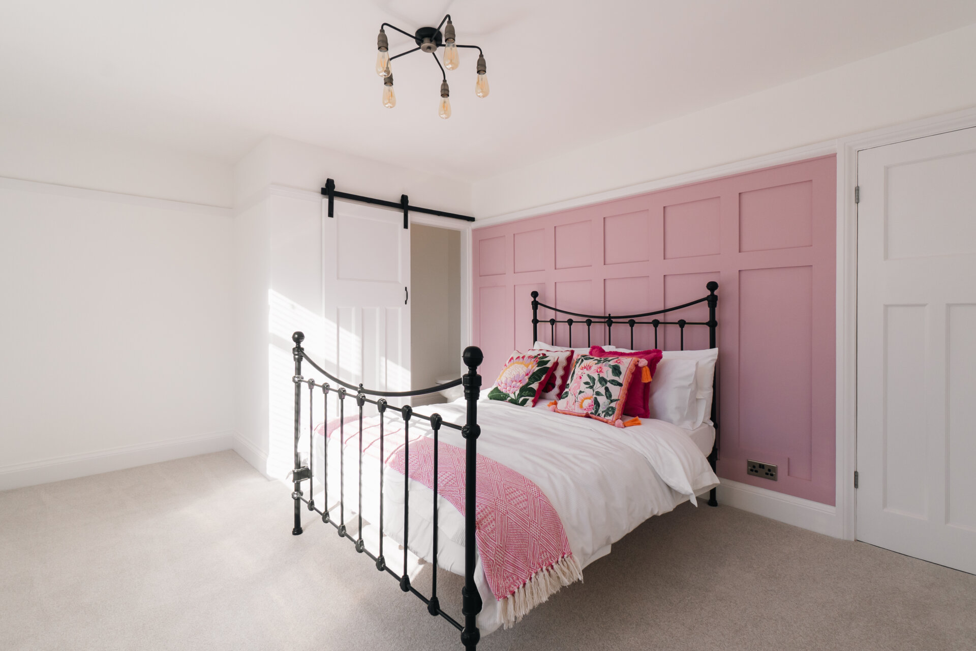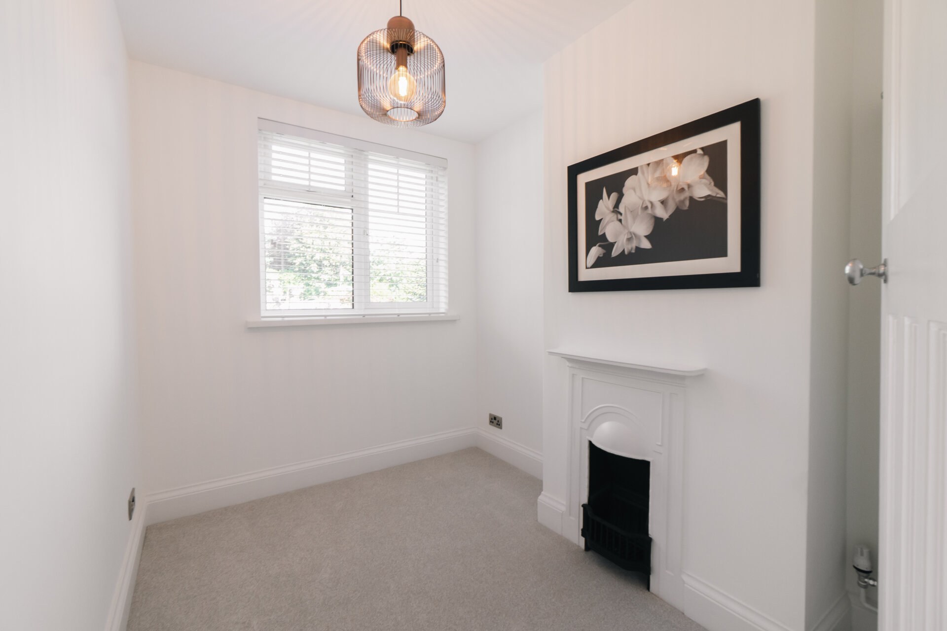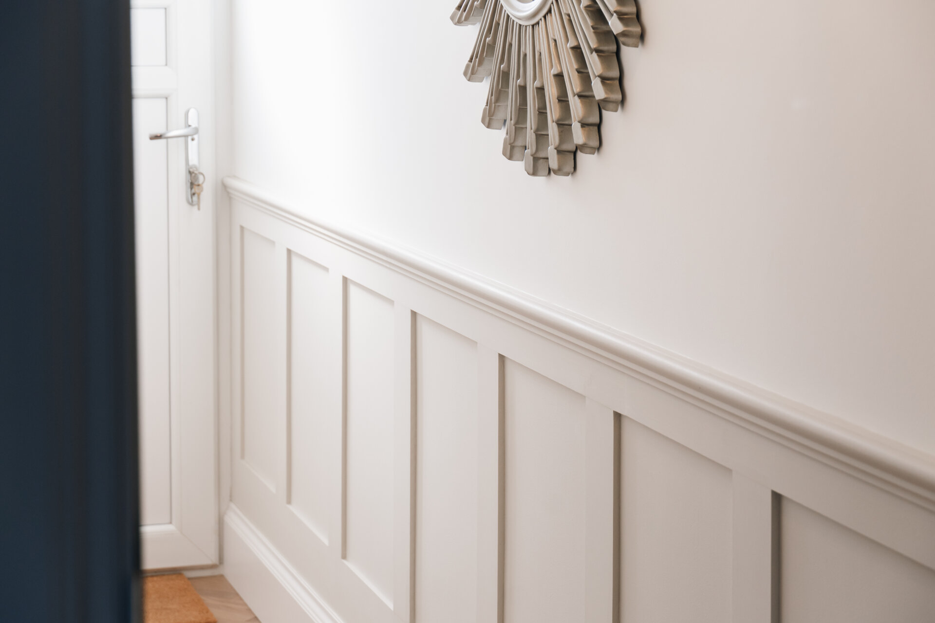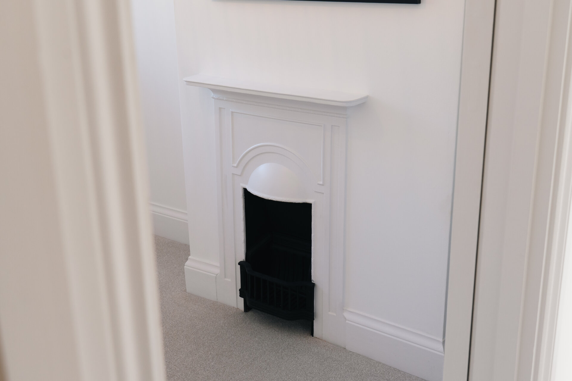 Upon entering, the hallway boasts feature panelling and herringbone wooden floors, creating a warm and inviting ambience throughout. The front reception room is adorned with a decorative fireplace and a bay window that bathes the space in natural light.