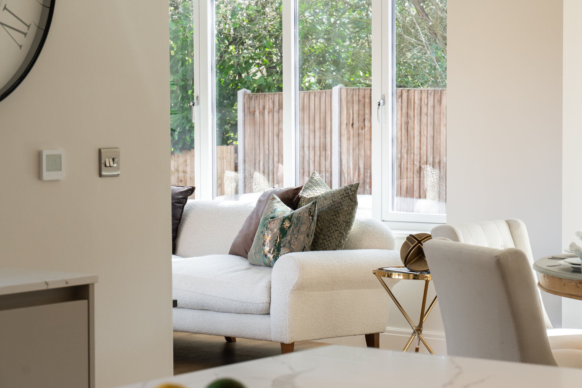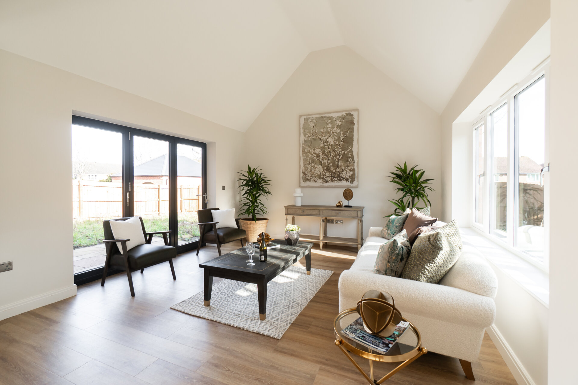 Step inside the property to be greeted by an impressive entrance hall leading to a double garage with electric doors, a guest WC, the first floor, a spacious living room, and a meticulously designed open plan kitchen/living/dining area. The kitchen, by Sherwin Hall, features top-of-the-line appliances, ample dining space, a living area, ideal for both every-day living and entertaining and bi-folding doors opening to the rear garden