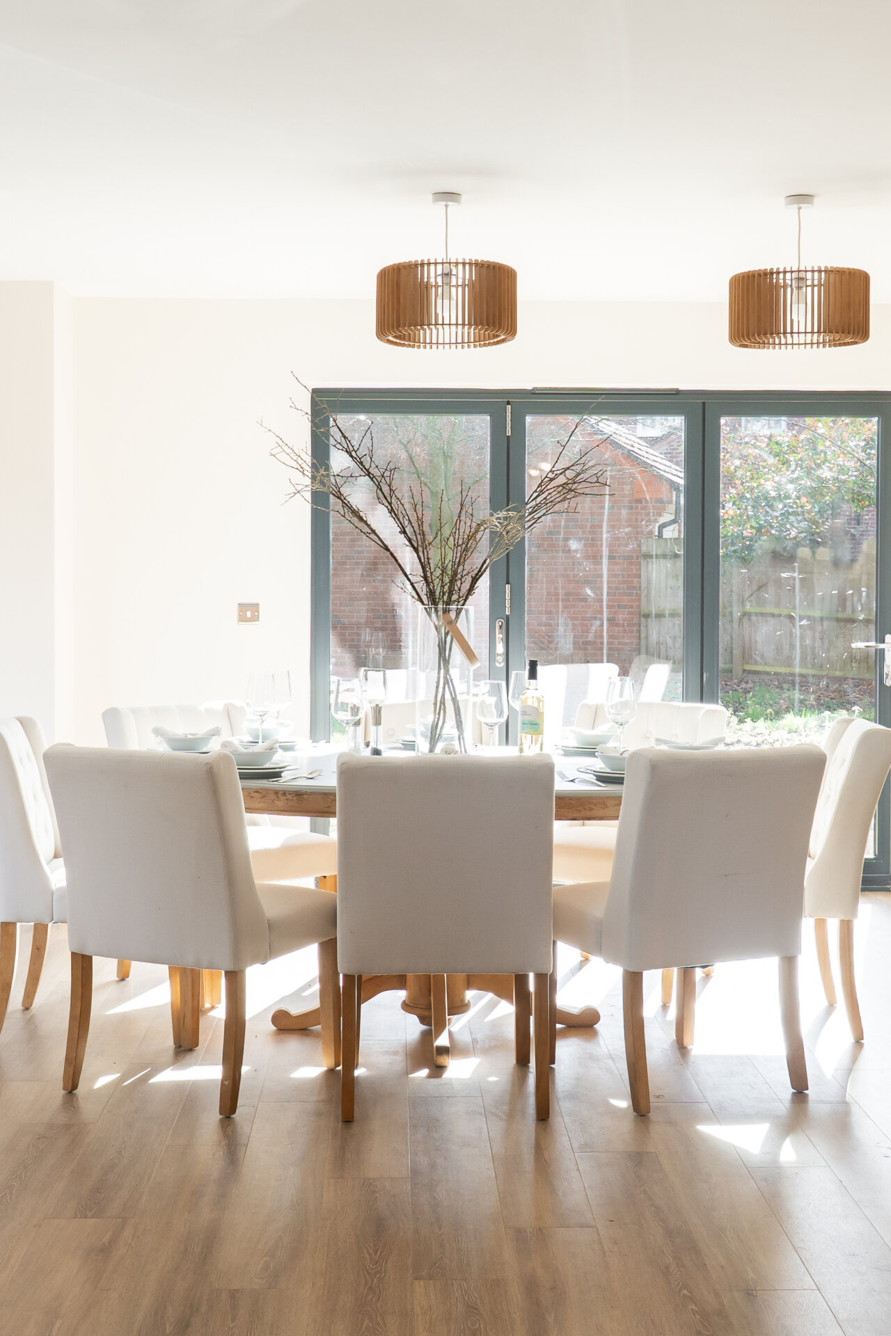 Step inside the property to be greeted by an impressive entrance hall leading to a double garage with electric doors, a guest WC, the first floor, a spacious living room, and a meticulously designed open plan kitchen/living/dining area. The kitchen, by Sherwin Hall, features top-of-the-line appliances, ample dining space, a living area, ideal for both every-day living and entertaining and bi-folding doors opening to the rear garden