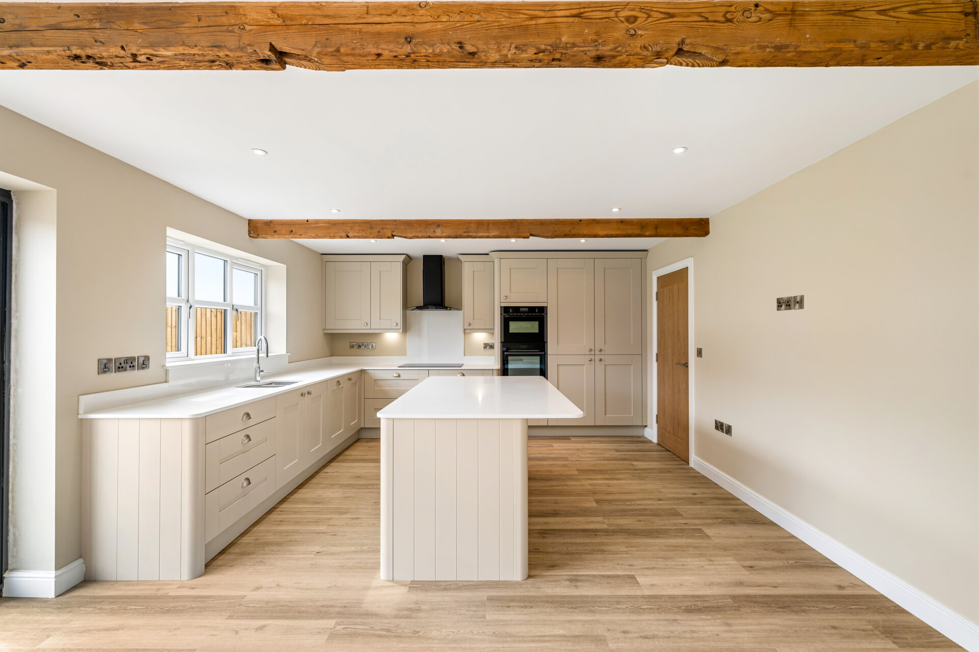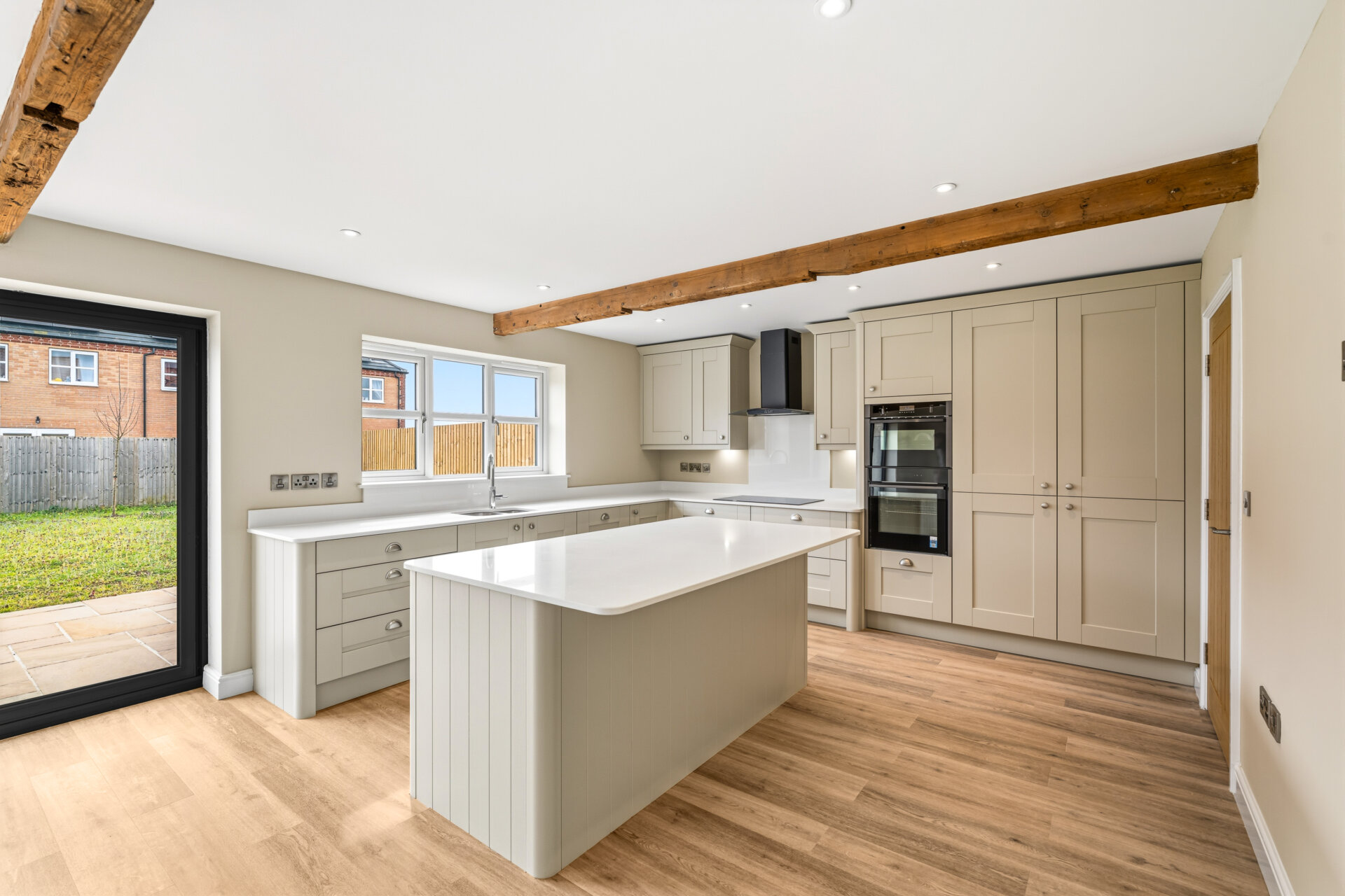 The property benefits from an upgraded specification throughout with the addition of a modern kitchen island and integrated appliances including: Neff Slide and Hide oven, full height fridge and freezer, induction hob, dishwasher, extractor fan and additional Quooker boiling water tap. The open plan kitchen/diner/lounge also features three rustic beams, bringing in the heritage style of the development.