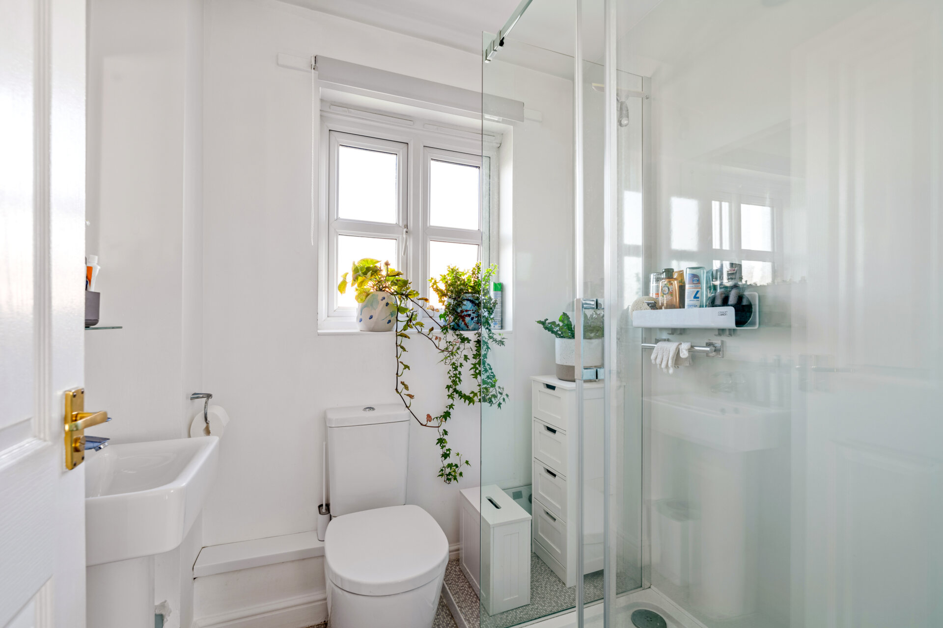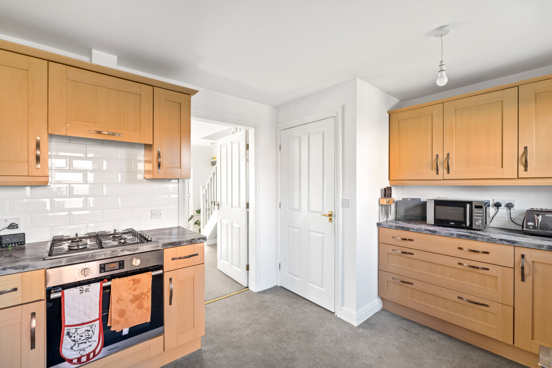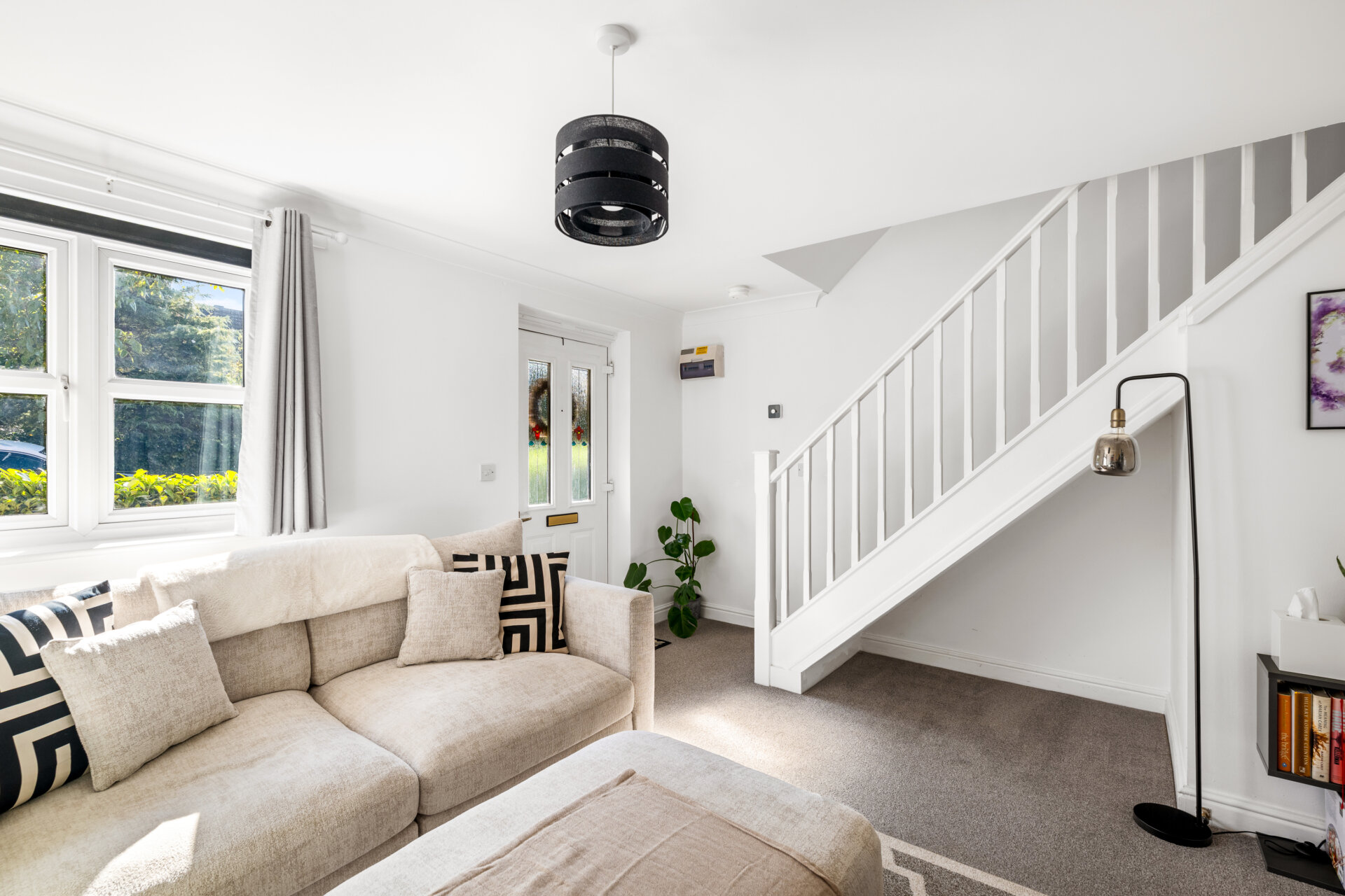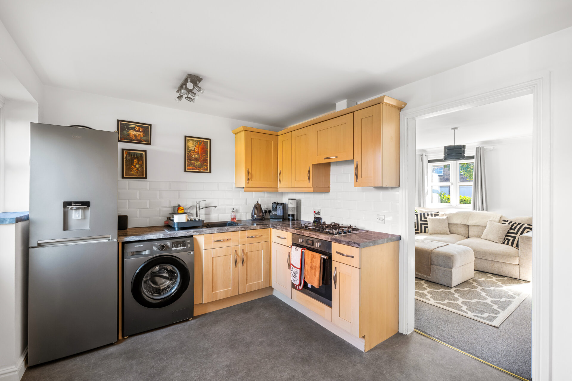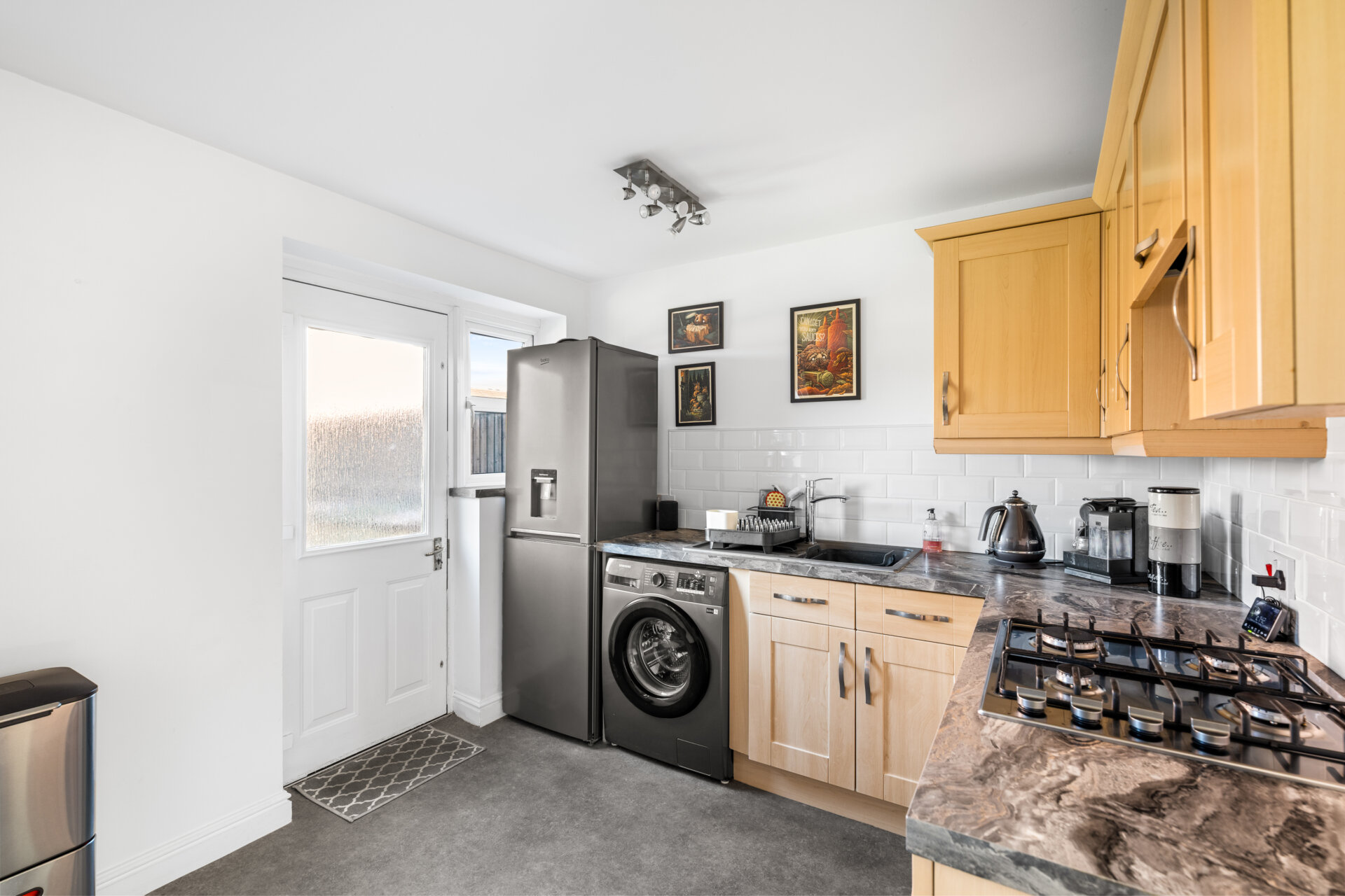 Inside, the property has a modern feel with neutral decor and well maintained kitchen. The kitchen benefits from generous storage and the inclusion of a gas hob and electric oven. A ground floor WC can also be accessed via the kitchen. The lounge benefits from modern carpets and features the stairs leading up to two bedrooms, one with two storage cupboards and a family bathroom with large walk-in shower.