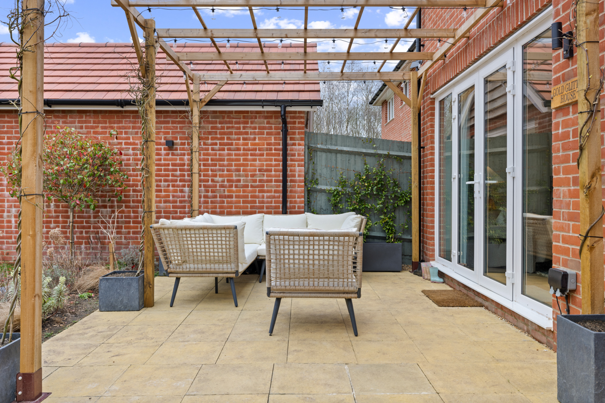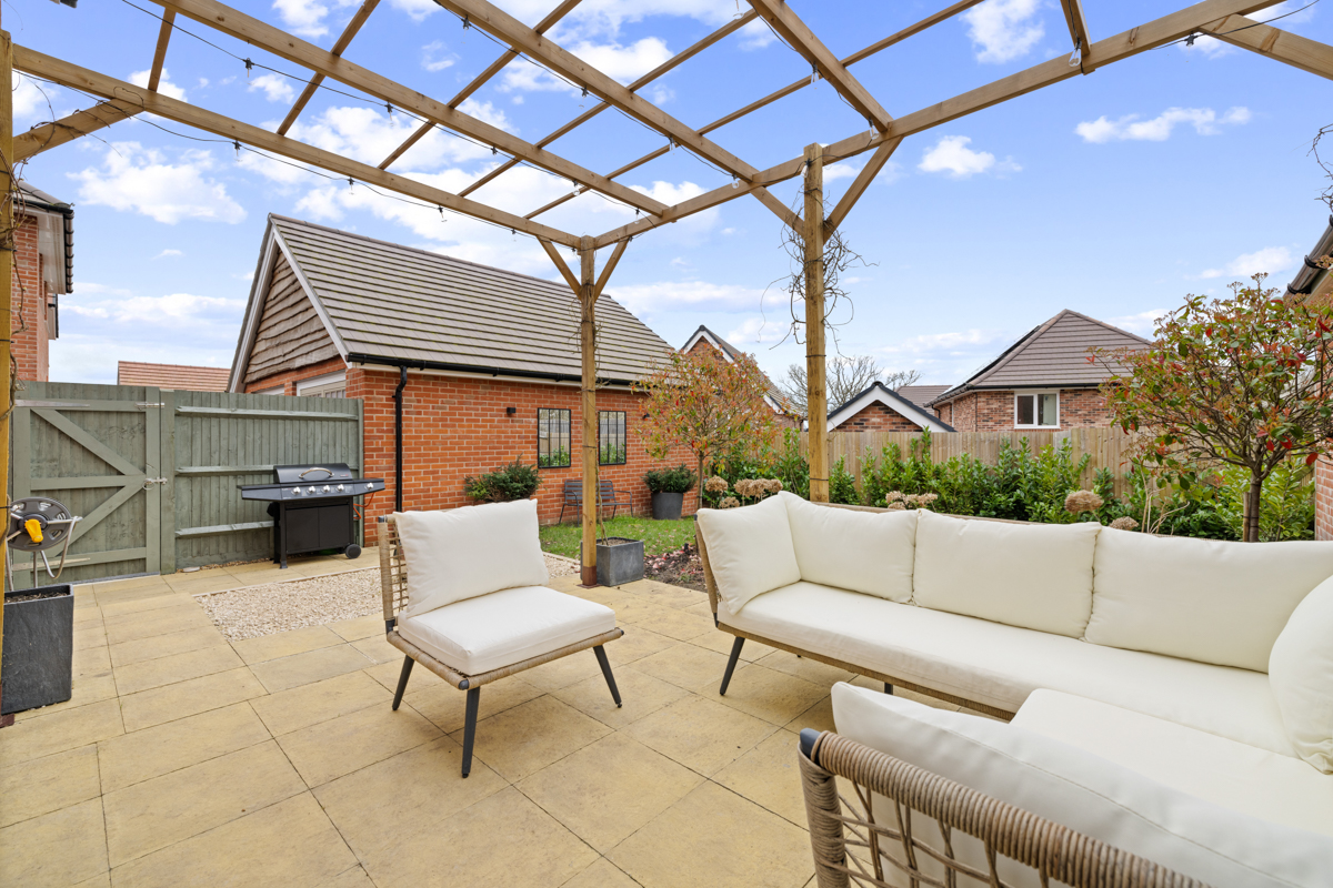 Enjoying a desirable west-facing aspect, the garden which can be accessed directly from the kitchen as well as via a side gate, provides an ideal setting for afternoon and evening sun. The space is thoughtfully arranged with a combination of lawn, patio and a pergola, creating distinct areas for relaxation and outdoor entertaining. Carefully planted trailing greenery will mature over time, enhancing both privacy and visual appeal.
