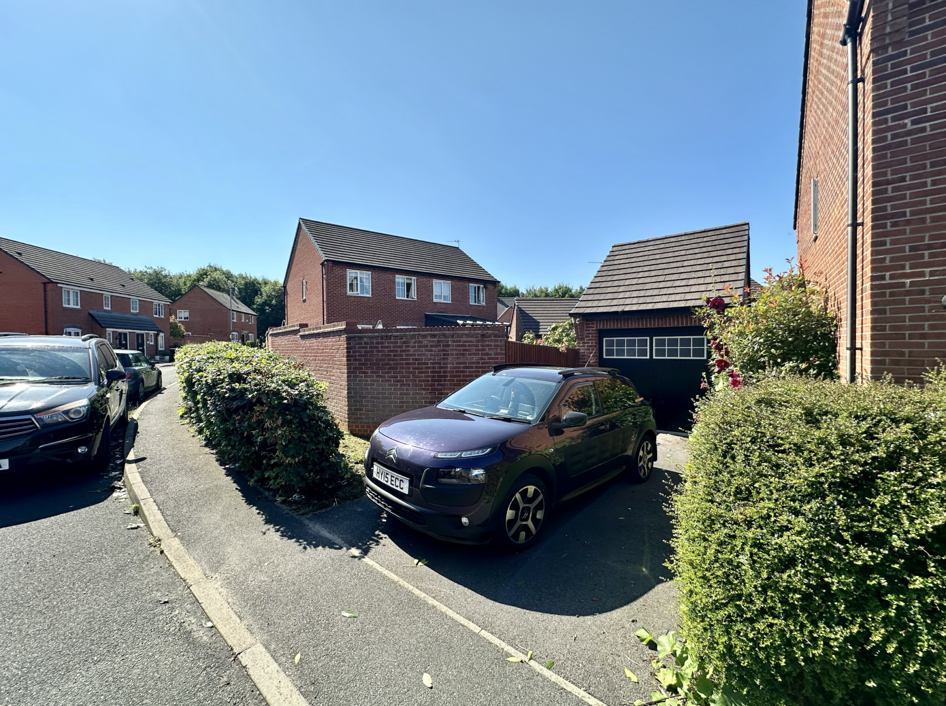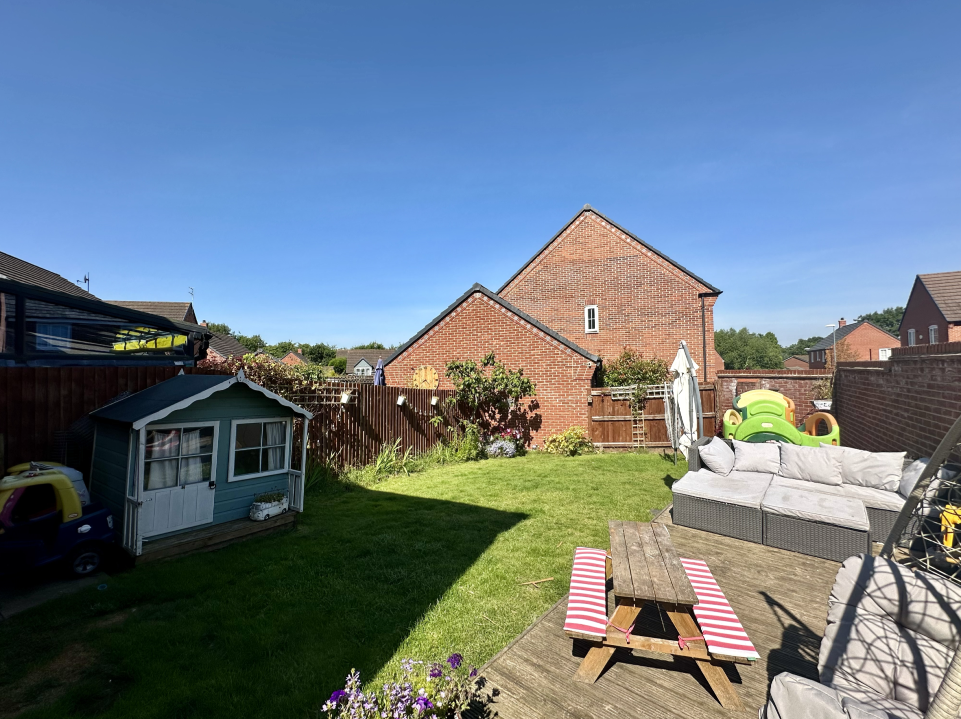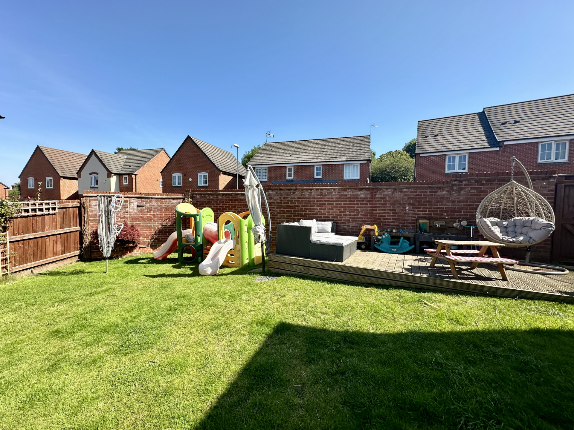 The rear garden is designed for low maintenance, featuring a raised decking area that serves as an ideal suntrap, perfect for enjoying sunny days and outdoor dining. Beyond the garden, there is a detached single garage and off-road parking, adding to the property’s practicality and convenience.