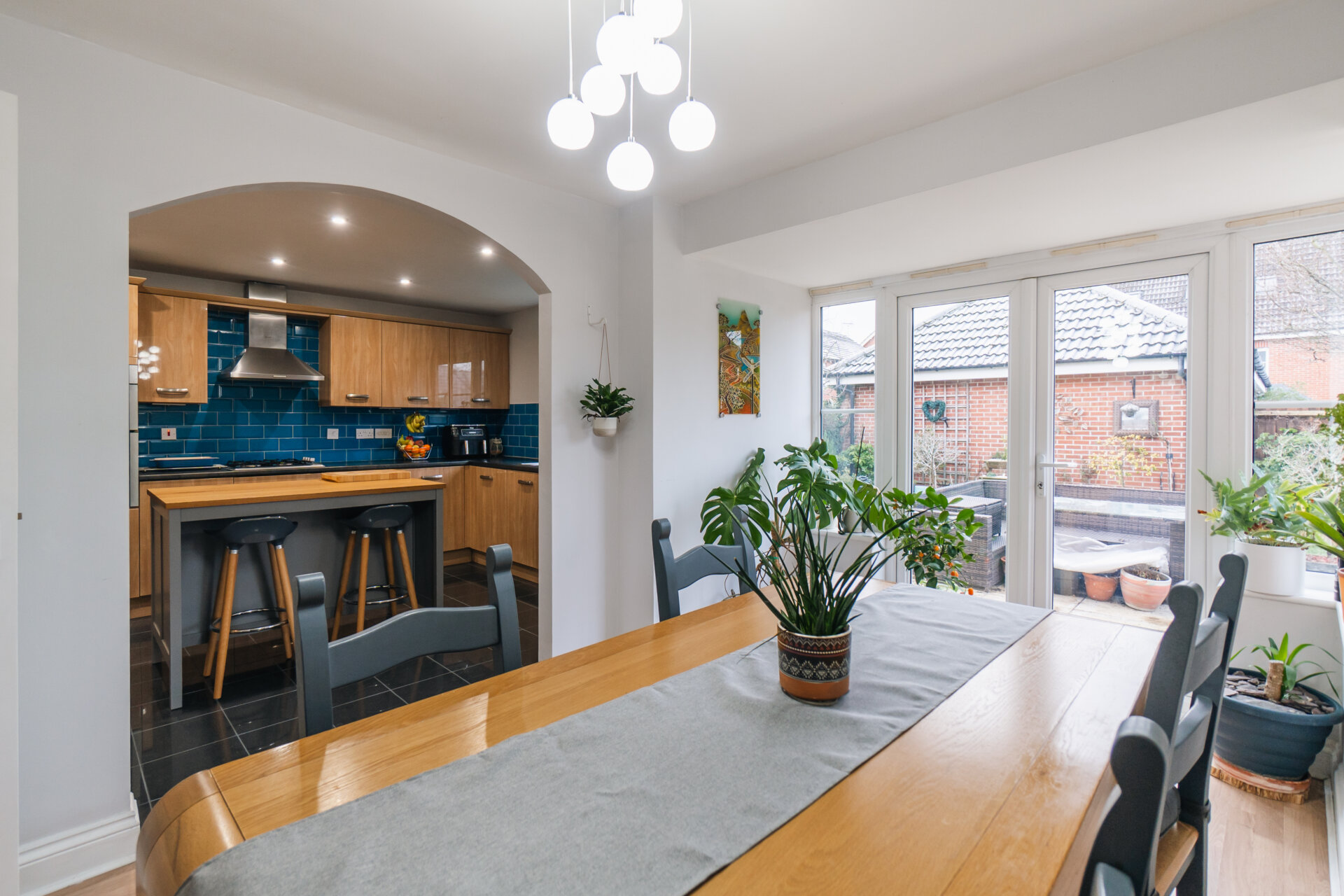 The lounge is of a good size lounge, perfect for relaxing or entertaining guests. The study which looks out onto a small green area is the ideal space for those working from home or seeking a quiet retreat. The heart of the home is the stunning kitchen diner, thoughtfully designed with contemporary fittings and featuring French doors that provide a seamless connection to the rear garden. A real benefit to this family home is the useful utility room located directly off the kitchen.