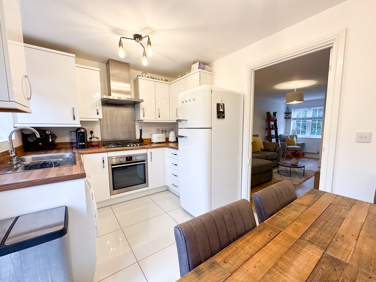Upon stepping inside, the hallway gracefully leads to the inviting lounge and a convenient downstairs W/C. The lounge is generously sized and exudes a welcoming, bright atmosphere. You'll find ample room for your furnishings and a handy under-stair storage cupboard. Continuing from the lounge, you'll discover the upgraded Kitchen/Dining Room. It features modern base and eye-level units, an integrated oven with a hob, space for a fridge-freezer and washing machine, and double French patio doors opening onto the rear garden. There's also space for a dining table, making it an ideal space for gatherings and meals.