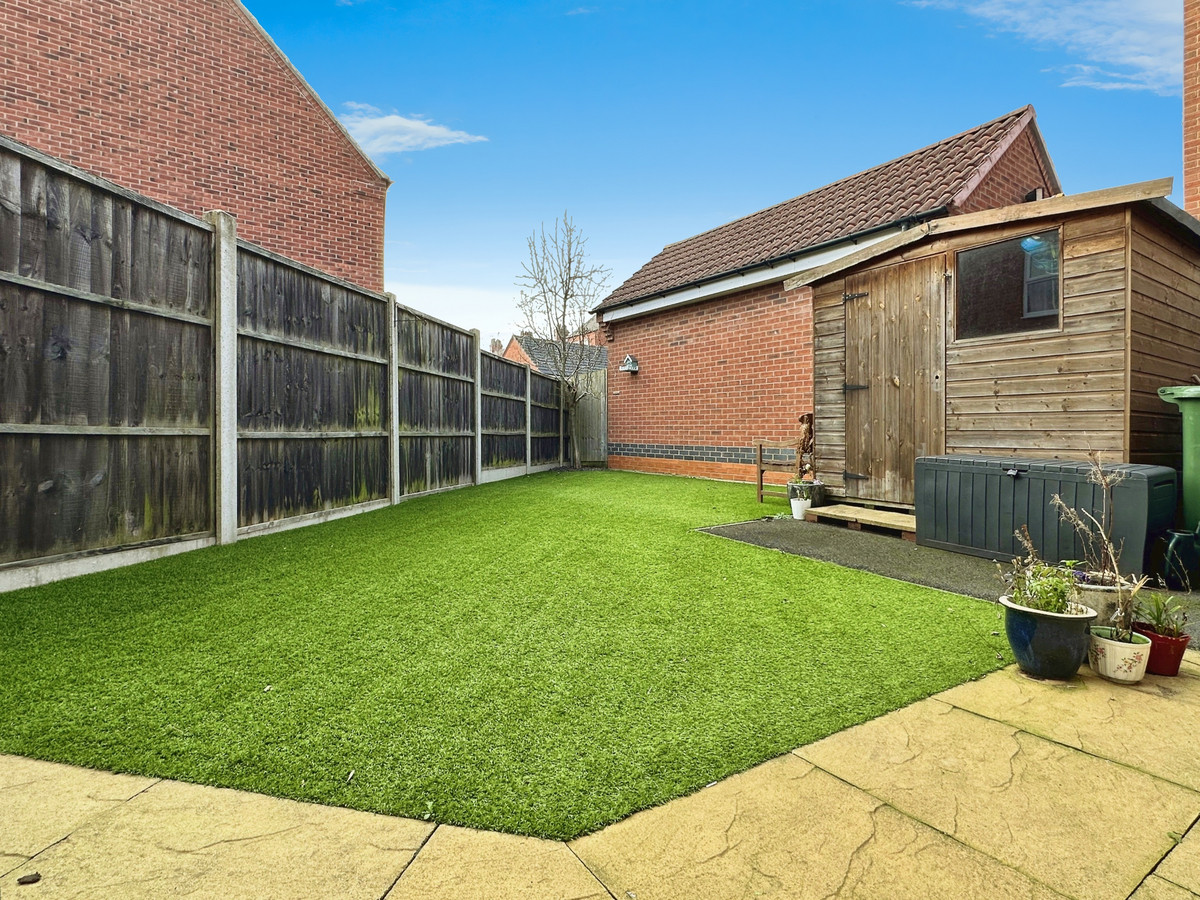 Outside, the garden awaits, with a patio area complemented by artificial lawn, perfect for alfresco dining or basking in the sun's warmth. A shed provides practical storage, keeping outdoor essentials organized. At the front, a charming garden area for curb appeal, while a convenient off-road parking for two cars under the carport ensures stress-free parking.
