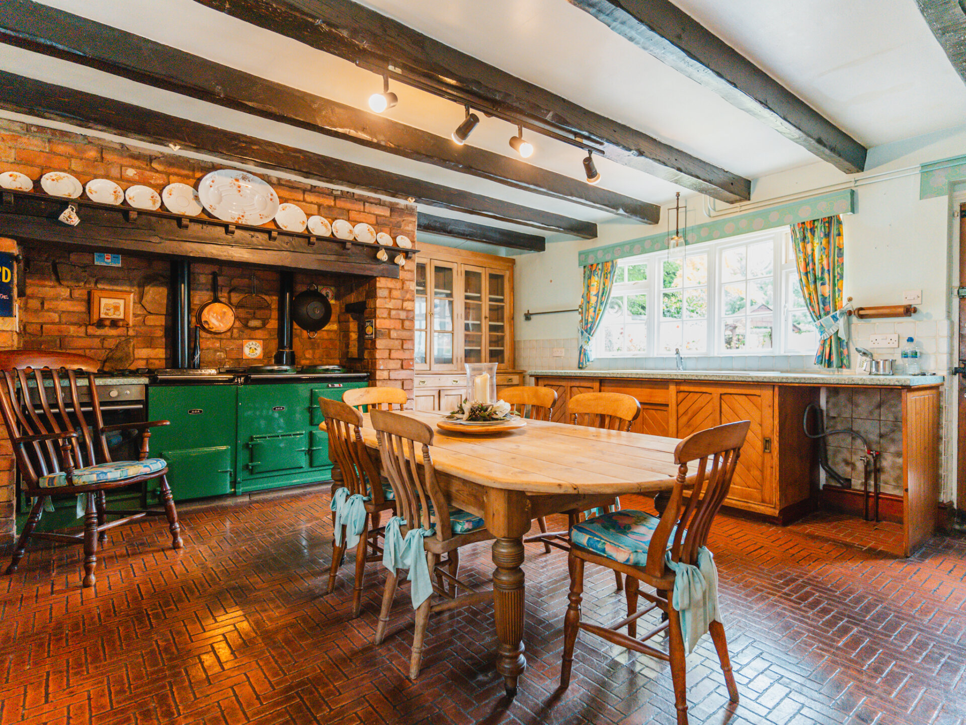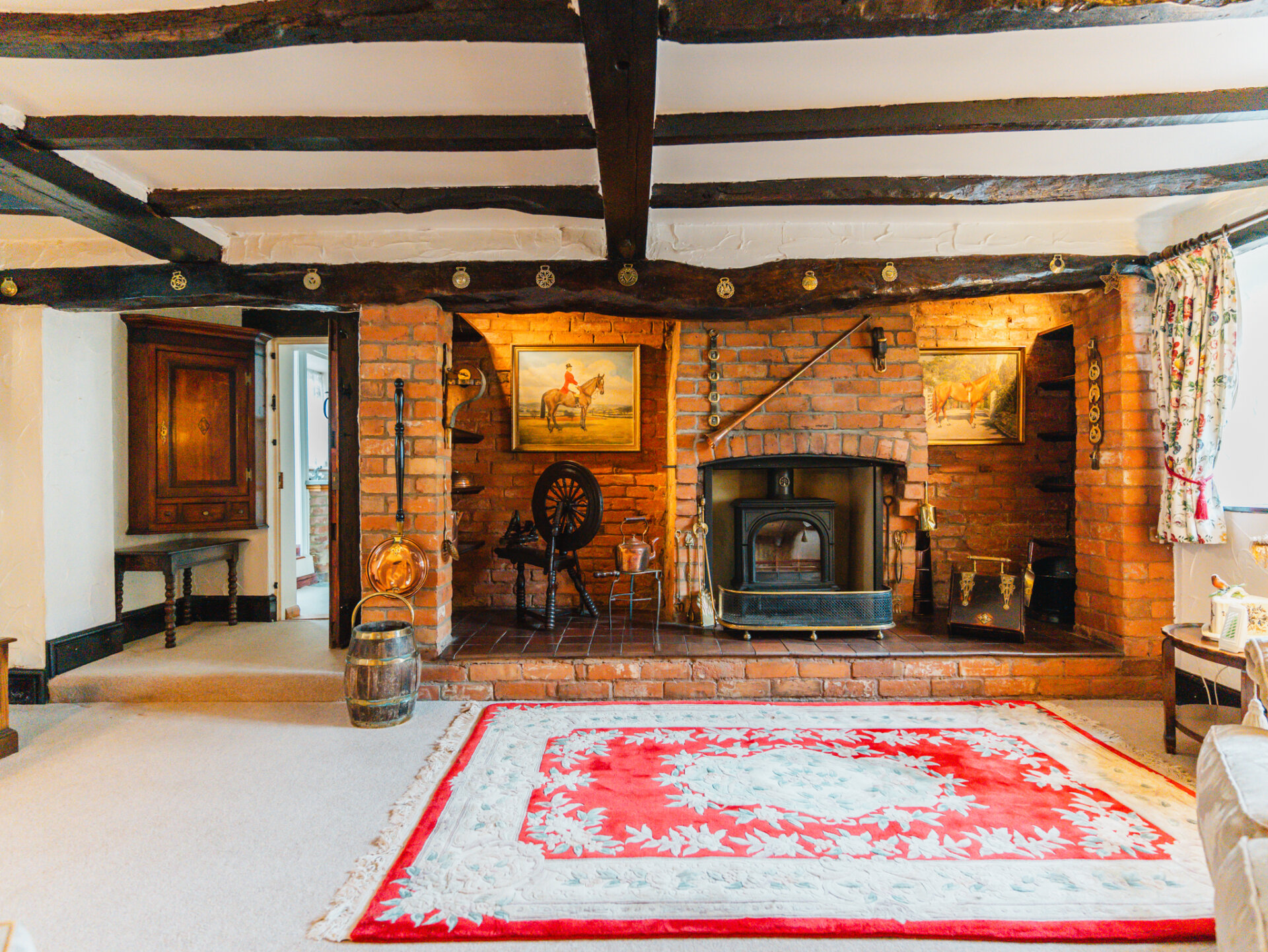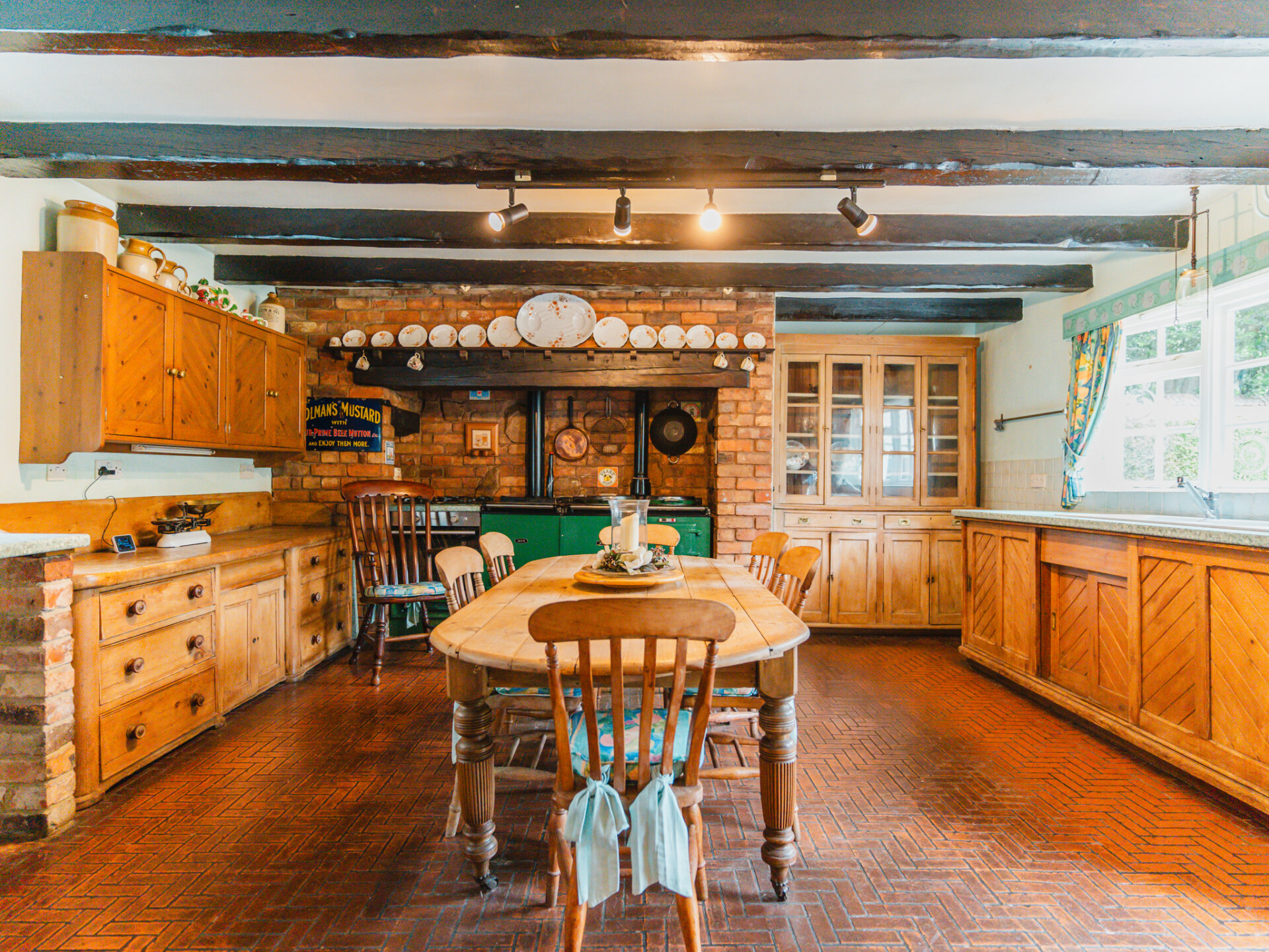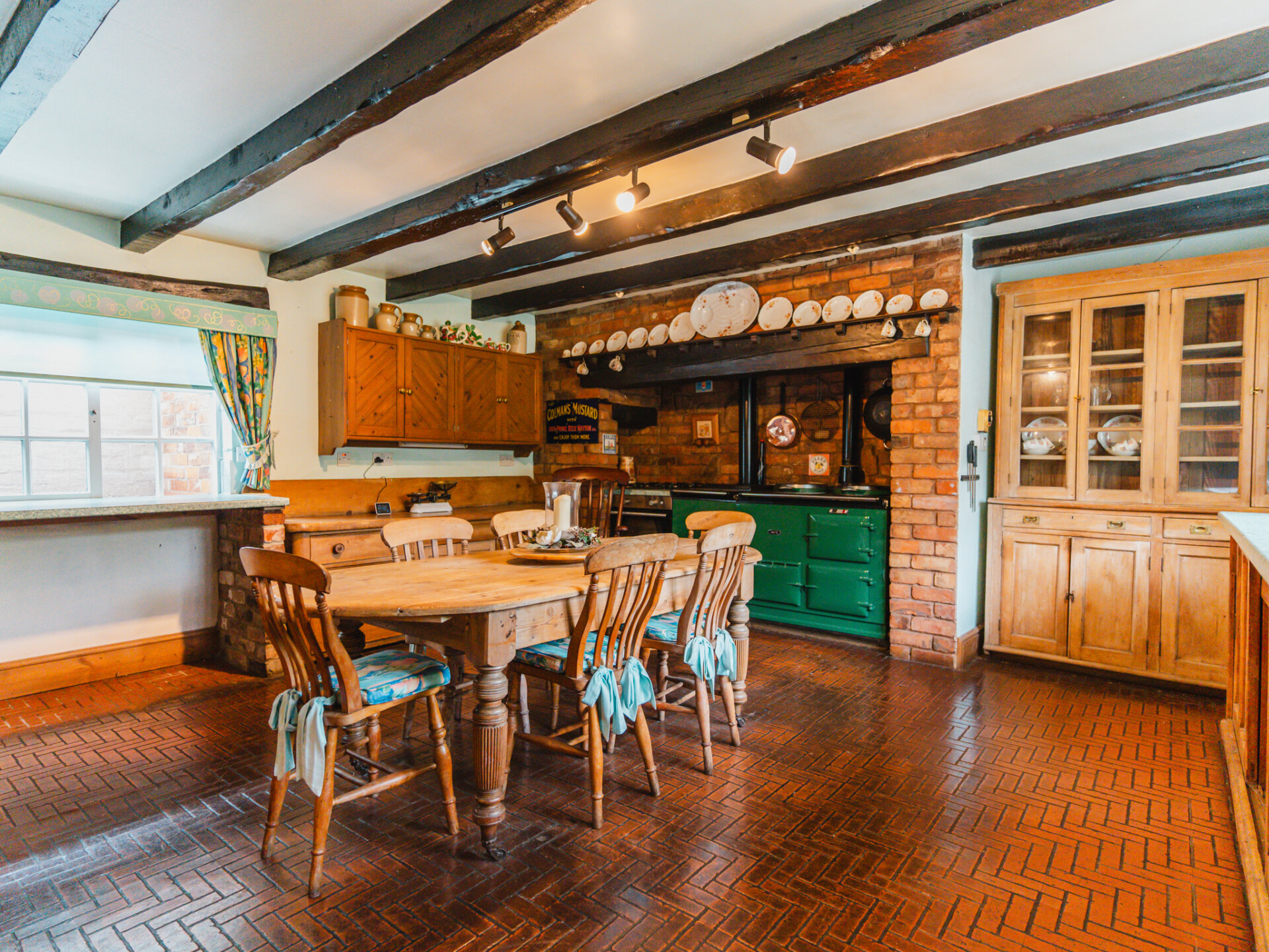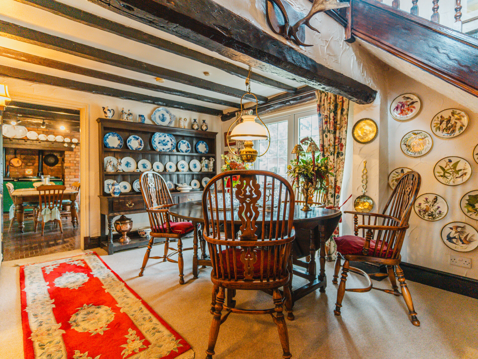 Positioned in the centre of the village on a slightly elevated plot, the house occupies a wonderfully secluded spot with a leafy backdrop to the rear. A substantial paved driveway with provides off-street parking for multiple vehicles and leads to the primary entrance, positioned in the original part of the cottage. With a distinctive Swithland slate roof, a welcoming entrance leads through to one of the spacious ground-floor reception rooms, featuring a galleried, handcrafted open staircase at the centre, creating an incredible focal point. Characterful stained-black beams stretch overhead, with a large, open Inglenook feature fireplace with exposed brickwork positioned to the right wing of the downstairs accommodation. Two further interconnected reception rooms are decorated in decadent dark colours, with a deep-set stone reclaimed fireplace and log burners positioned centrally, providing a warm winter retreat at the side of the house, offering pleasant views onto the rear garden. The breakfast kitchen is a perfect contrast – an expansive, light-filled room framing views of the terrace and gardens through barn-style doors. A large AGA range cooker is centrally positioned, with ample space for all necessary appliances.