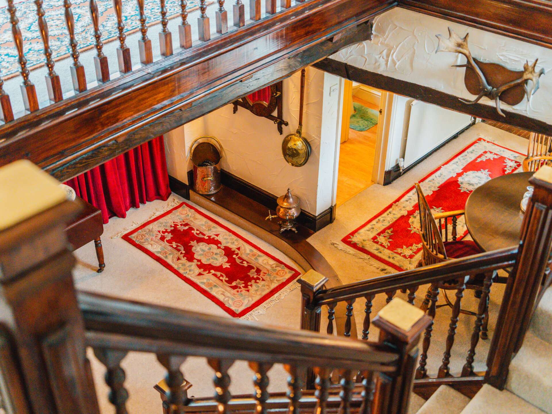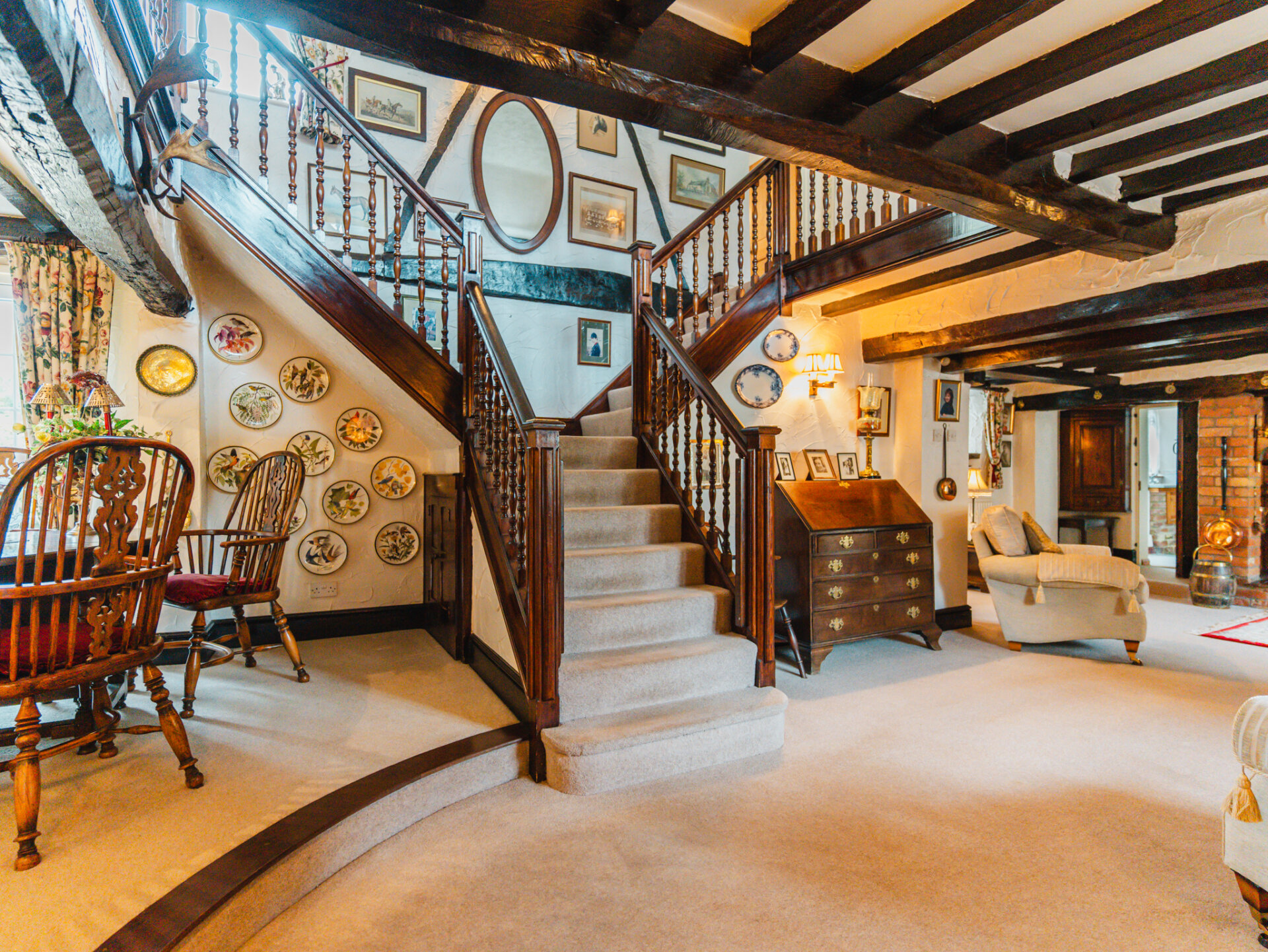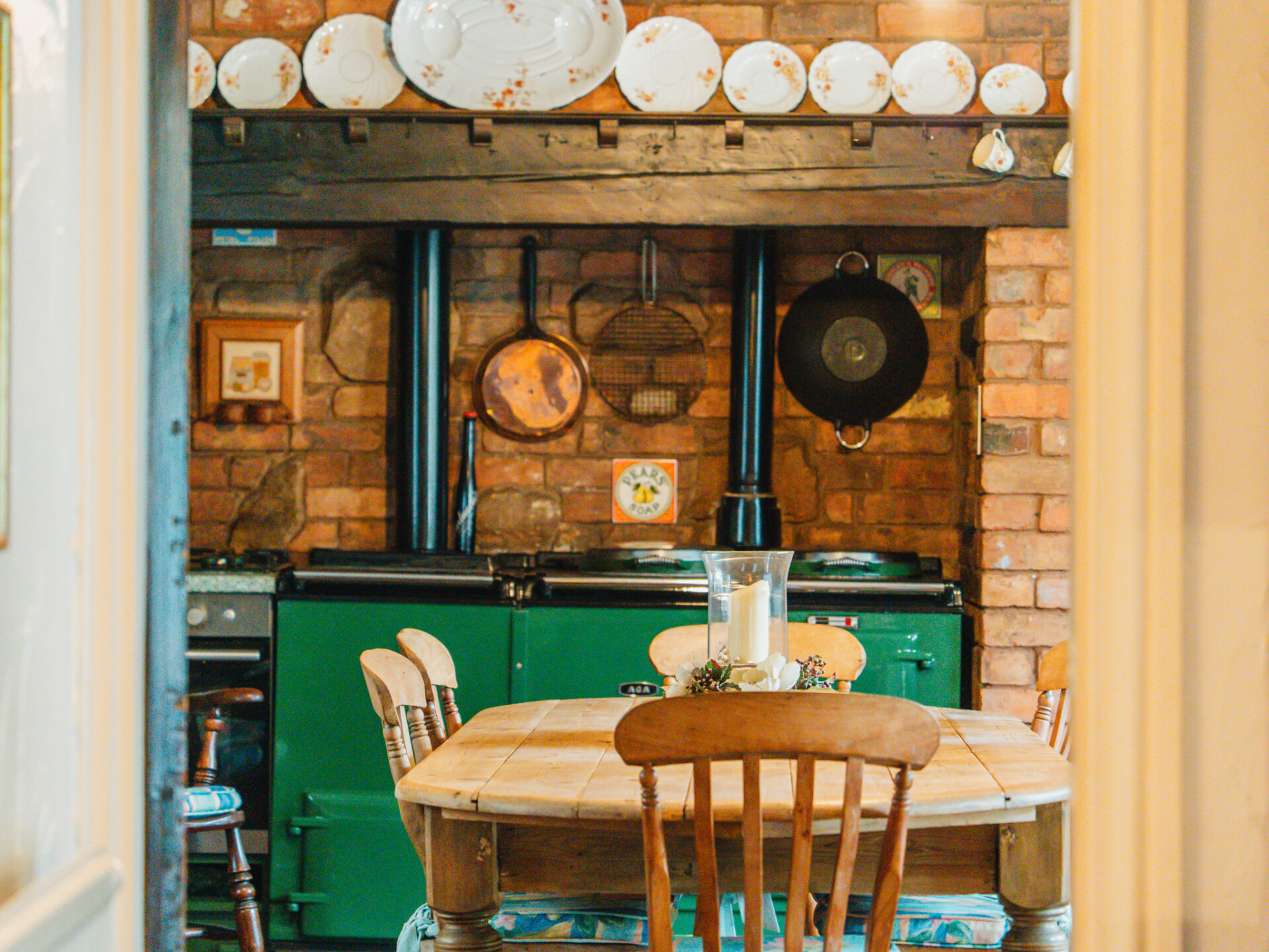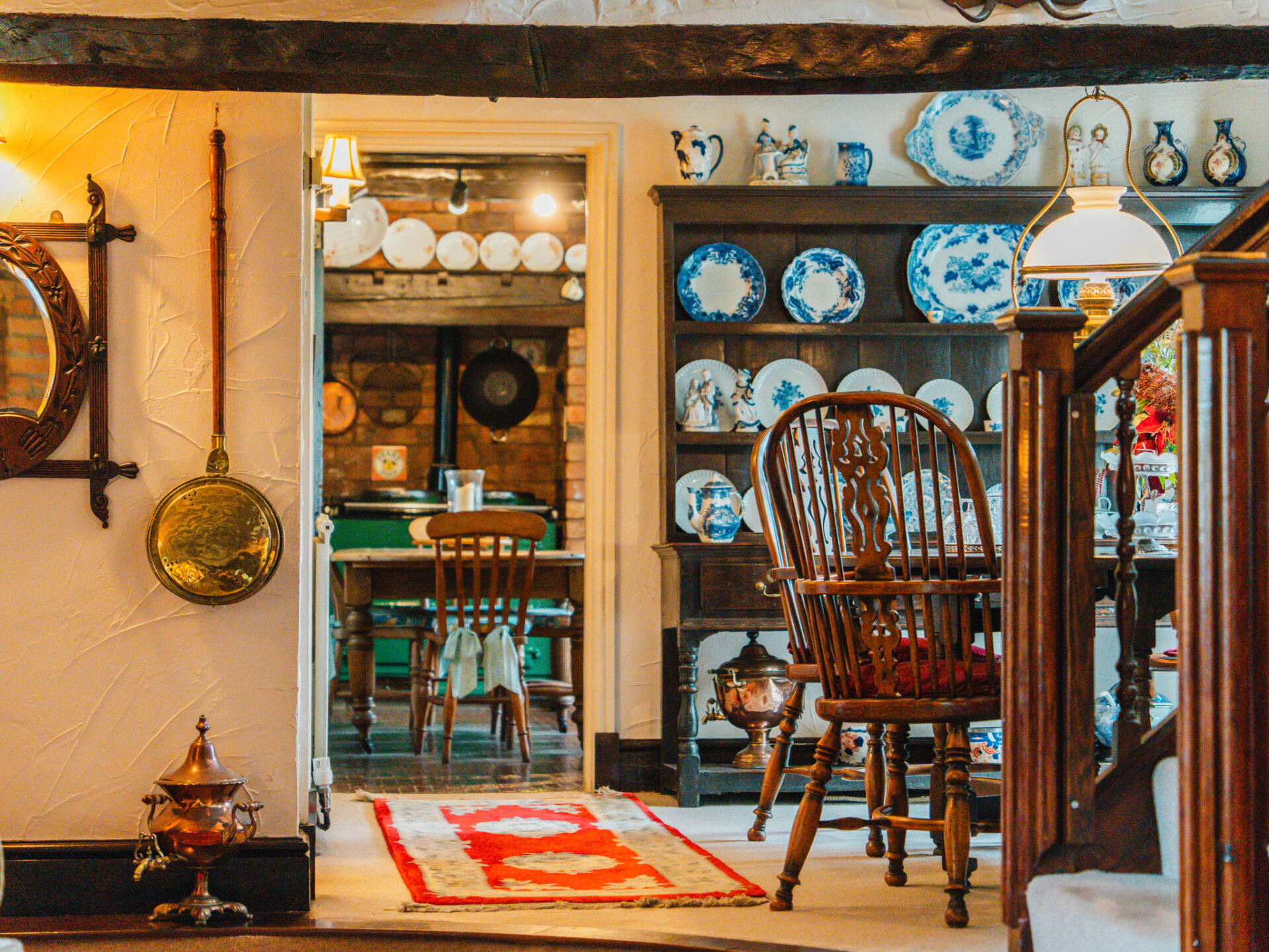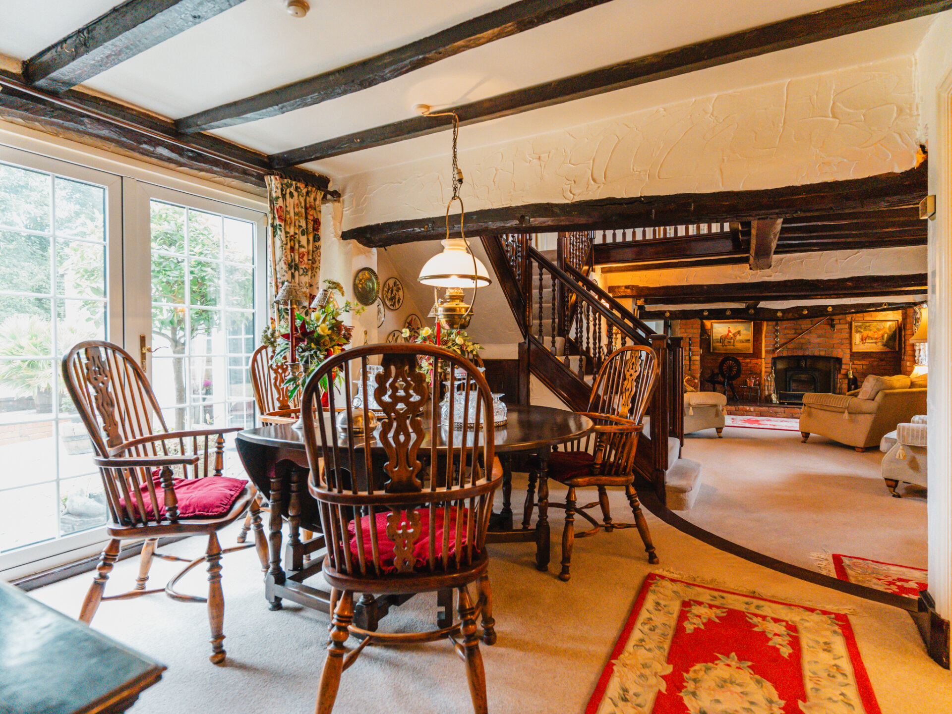 Positioned in the centre of the village on a slightly elevated plot, the house occupies a wonderfully secluded spot with a leafy backdrop to the rear. A substantial paved driveway with provides off-street parking for multiple vehicles and leads to the primary entrance, positioned in the original part of the cottage. With a distinctive Swithland slate roof, a welcoming entrance leads through to one of the spacious ground-floor reception rooms, featuring a galleried, handcrafted open staircase at the centre, creating an incredible focal point. Characterful stained-black beams stretch overhead, with a large, open Inglenook feature fireplace with exposed brickwork positioned to the right wing of the downstairs accommodation. Two further interconnected reception rooms are decorated in decadent dark colours, with a deep-set stone reclaimed fireplace and log burners positioned centrally, providing a warm winter retreat at the side of the house, offering pleasant views onto the rear garden. The breakfast kitchen is a perfect contrast – an expansive, light-filled room framing views of the terrace and gardens through barn-style doors. A large AGA range cooker is centrally positioned, with ample space for all necessary appliances.