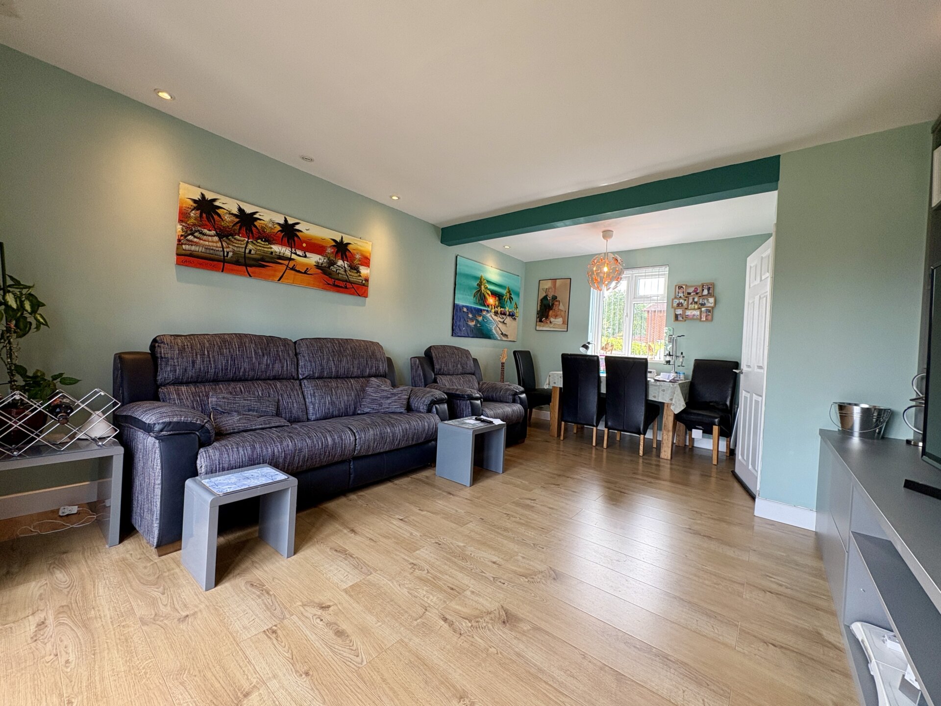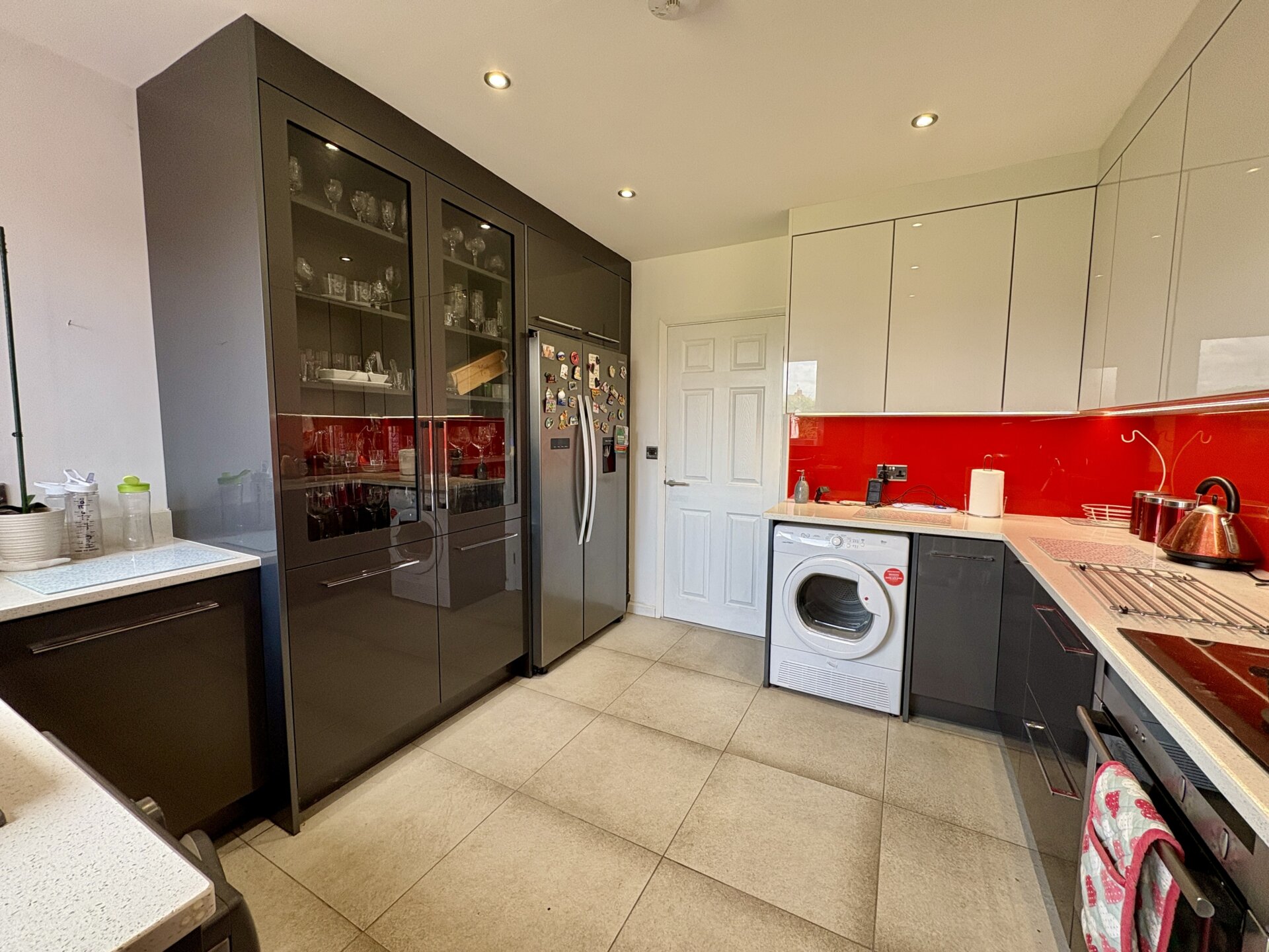 Step inside and you’ll find a thoughtfully designed interior that makes an instant impression. The bespoke fitted kitchen is a standout feature, complete with integrated appliances and high-quality finishes that bring a modern elegance to everyday living. The spacious lounge offers a warm and inviting atmosphere, with sliding doors opening out to the rear garden, seamlessly connecting the indoors with the outdoors.