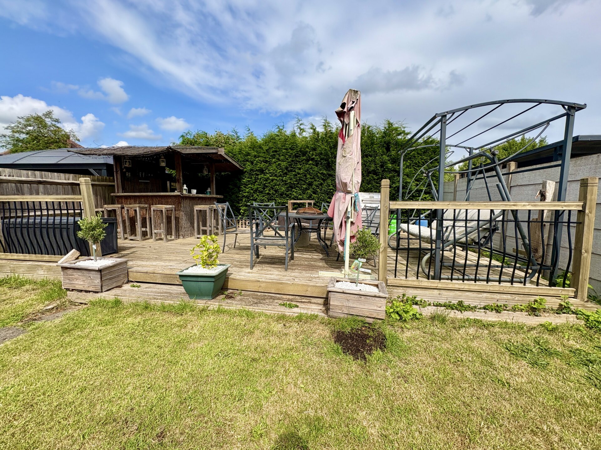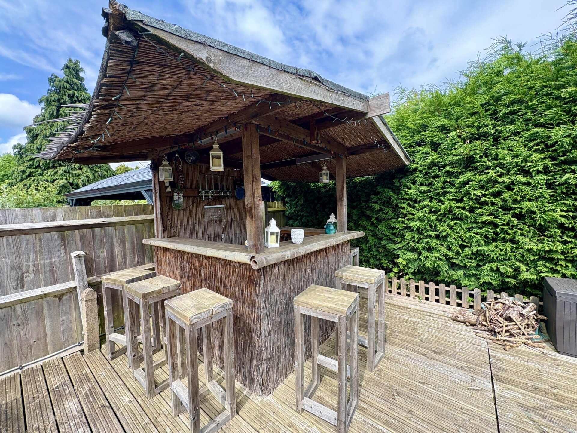 Outside, the property continues to shine. A large private driveway provides off-road parking for up to three vehicles, offering both convenience and security. The rear garden is a real highlight, with an impressive lawned area ideal for families or those who love spending time outdoors. Practical outbuildings add extra functionality, while at the very rear, an elevated decking space becomes an instant favourite. Complete with its very own tiki bar, this is a garden made for hosting, relaxing and enjoying those long summer evenings.