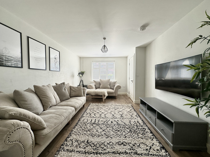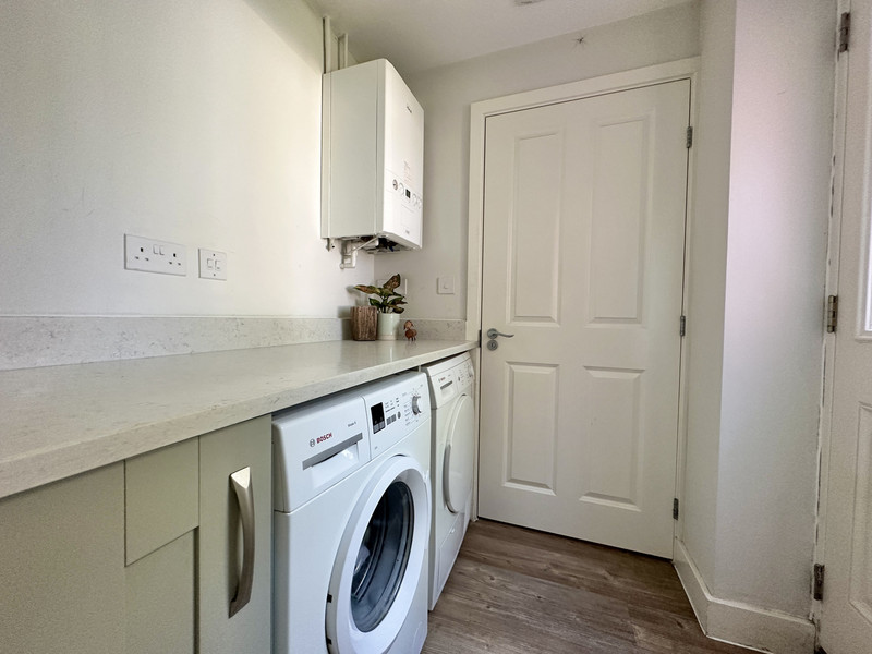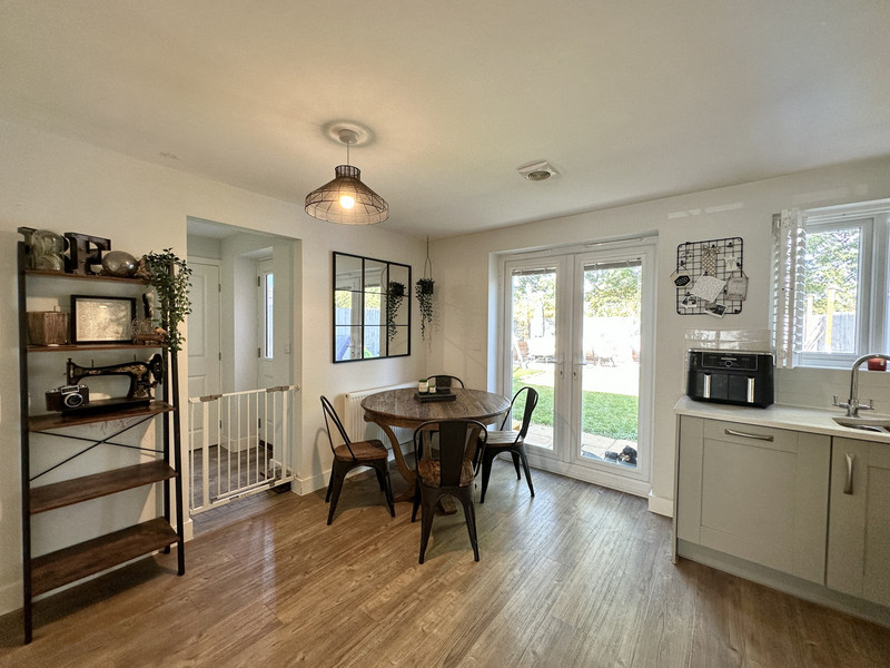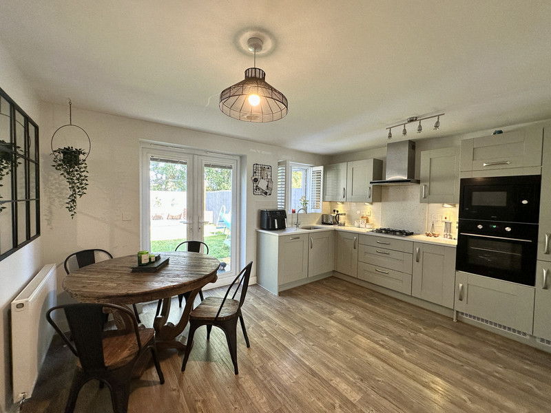 The ground floor accommodation is accessed via an entrance hallway that provides access to the living accommodation, garage and first floor. A well proportioned lounge is situated to the front of the property and is a lovely bright room with wood effect flooring running throughout. From here French doors lead to a living dining kitchen that is fitted with a range of shaker units with quartz work surfaces over and includes a range of integrated appliances. The room comfortably accommodates a dining table and seating area, and has French doors that open onto the rear garden. The ground floor accommodation is completed by a utility room and ground floor WC.