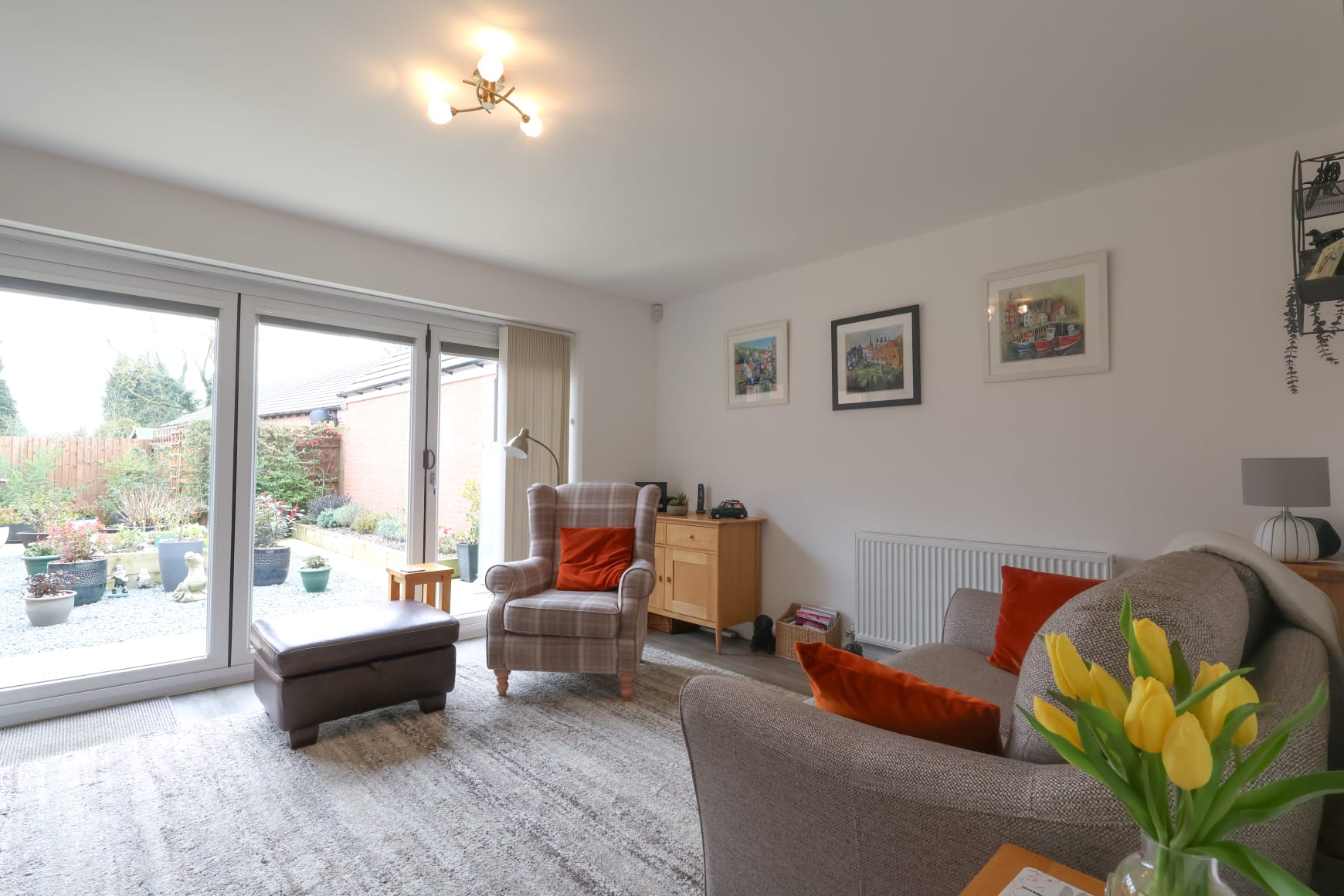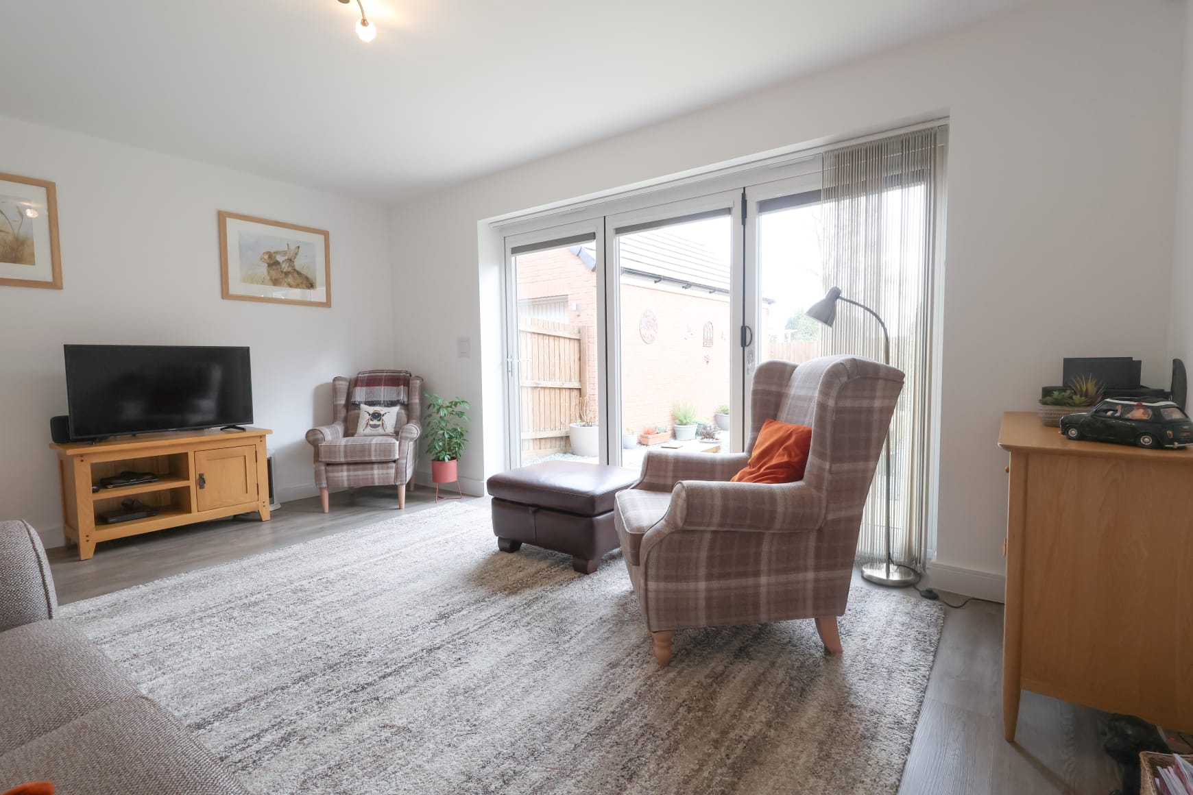 At the rear of the home, the spacious lounge is a perfect place to relax, featuring bi-fold doors that open onto the beautifully landscaped south-facing garden. The doors are fitted with bespoke blinds, offering privacy while allowing in plenty of natural light.