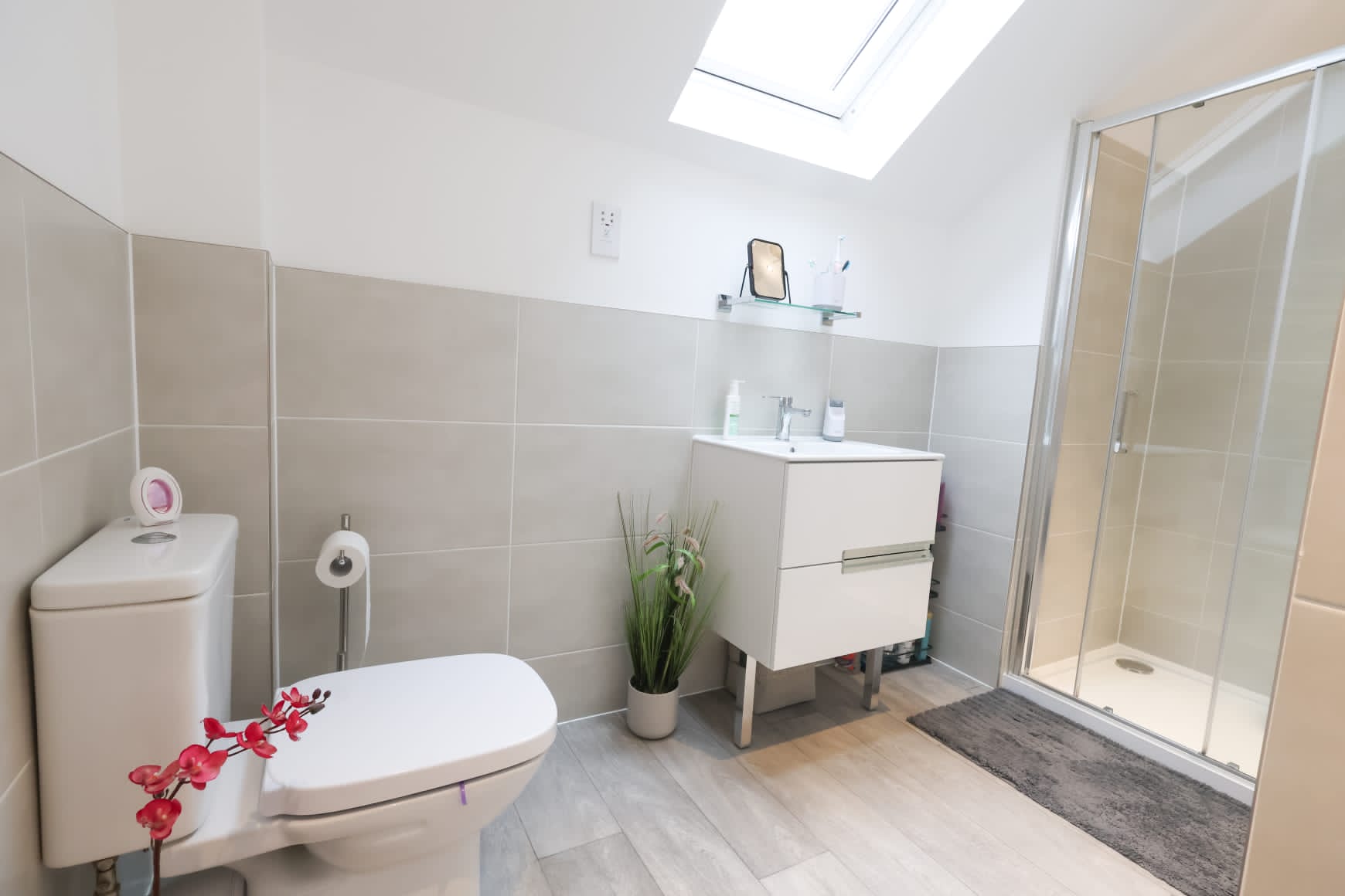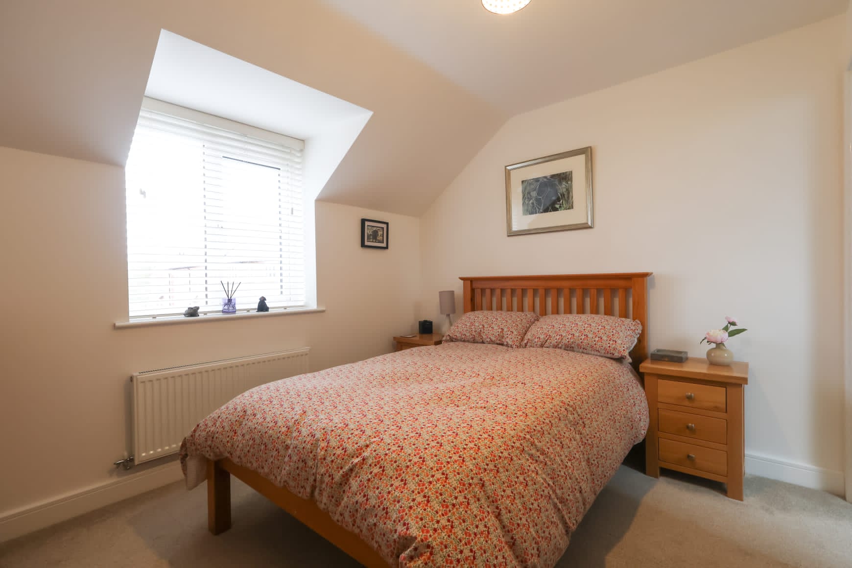 The principal bedroom is generously sized and benefits from a well-appointed ensuite, complete with a large Velux window that enhances the light and airy feel.