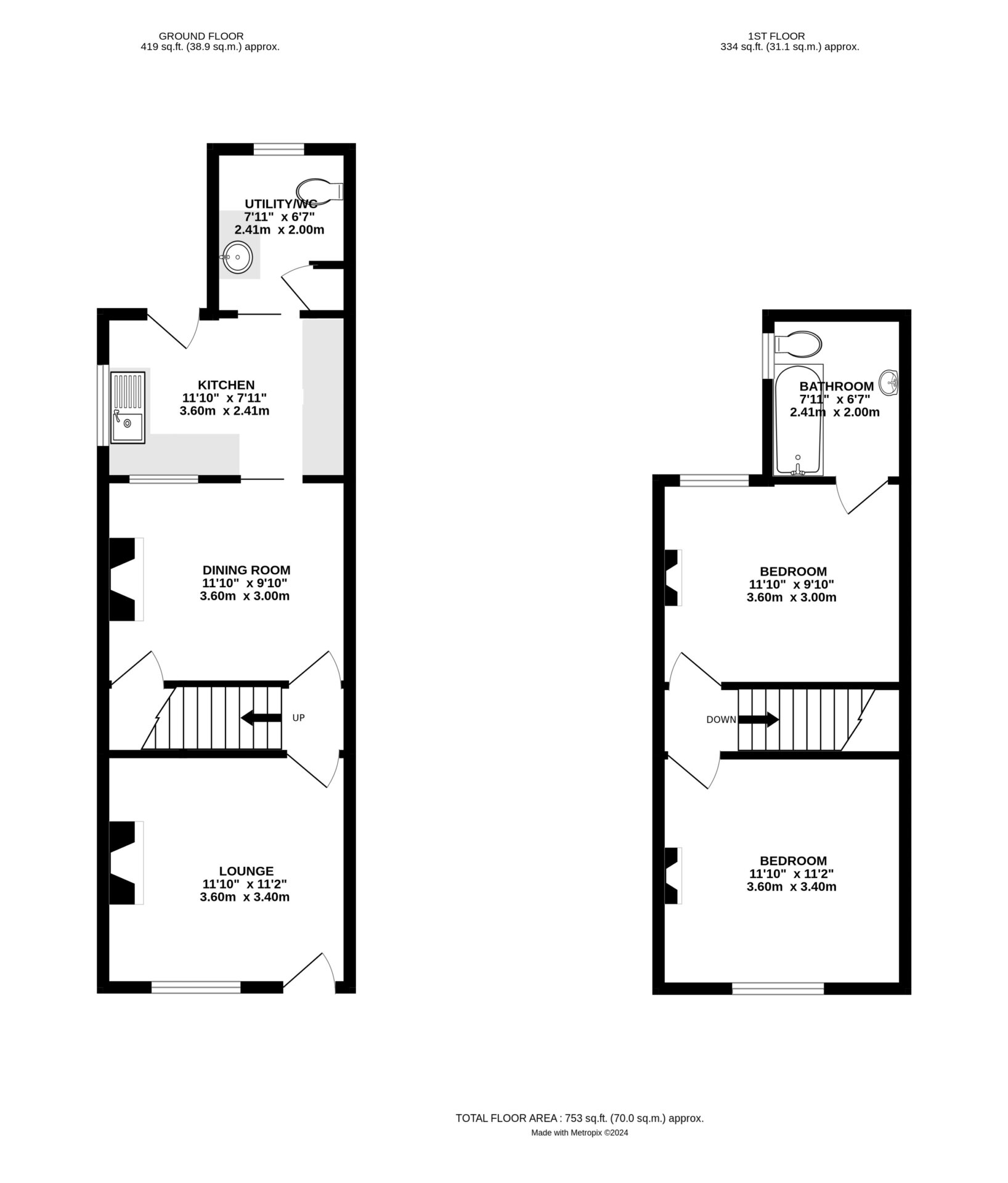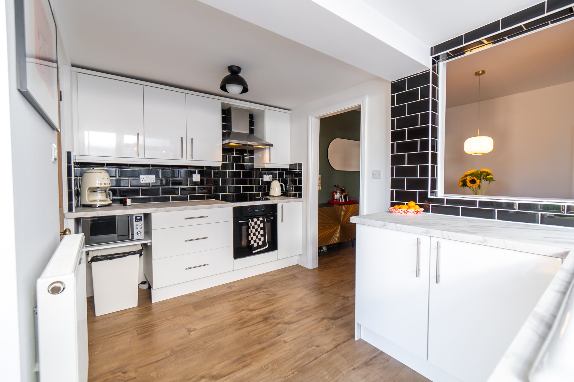 Leading through from the dining room you will find a newly refreshed kitchen, with brand new sink, white gloss units, laminate surfaces and a sleek black metro tile backsplash. The kitchen benefits from a built in electric oven, hob, extractor and dishwasher. The floor is laid with Amtico light wood flooring. There is a radiator, a window to the side elevation, a rear door leading to the courtyard garden and an original Victorian pine door leading into the Utility room and WC.