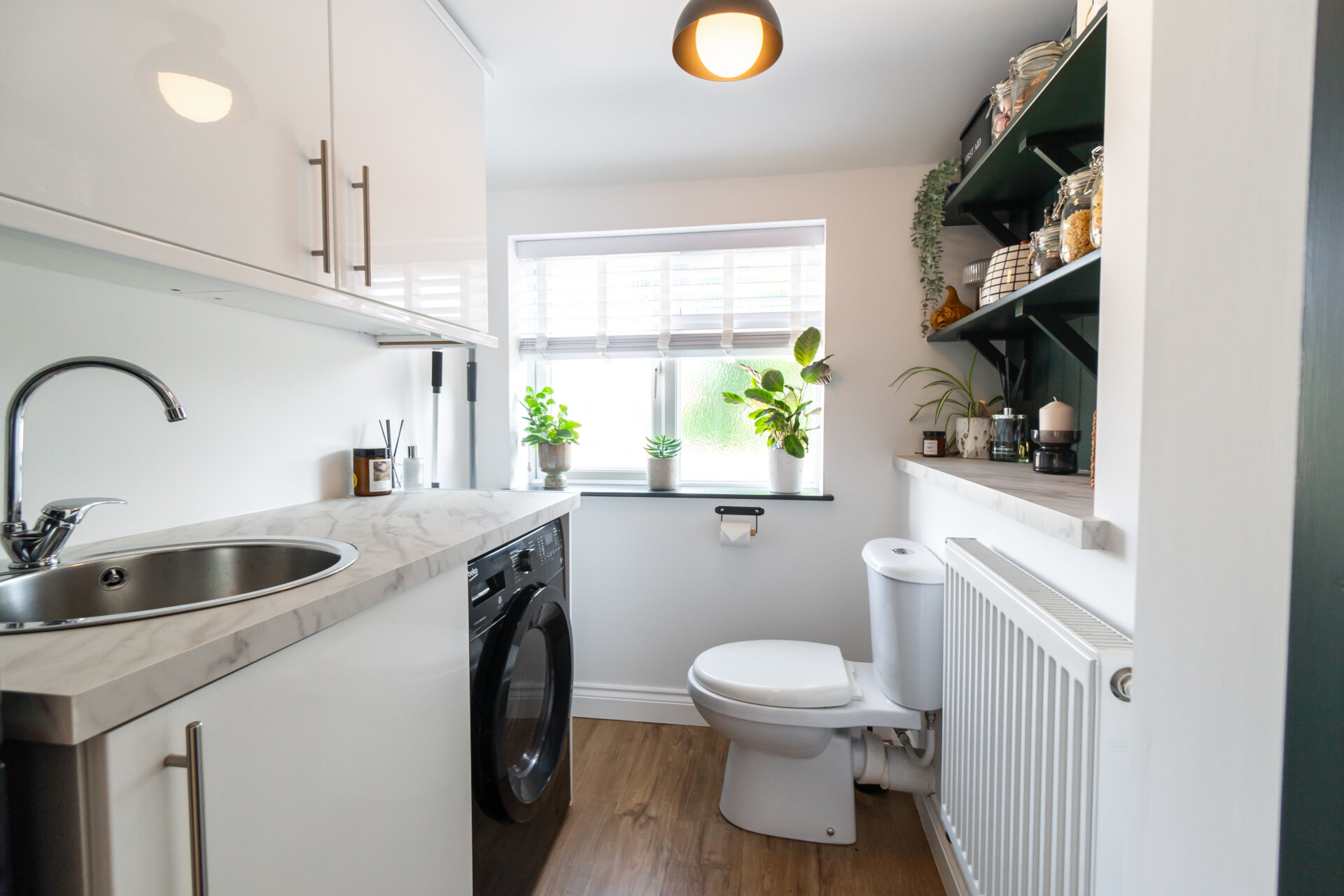 Through the original pine door from the kitchen you will find the Utility room and downstairs toilet. Laid with Amtico flooring, laminate countertops, and cupboards to match the kitchen. You will find a storage cupboard, space for a Fridge Freezer and washing machine, a sink, a radiator and a low level WC. There is an obscure window to the rear garden.