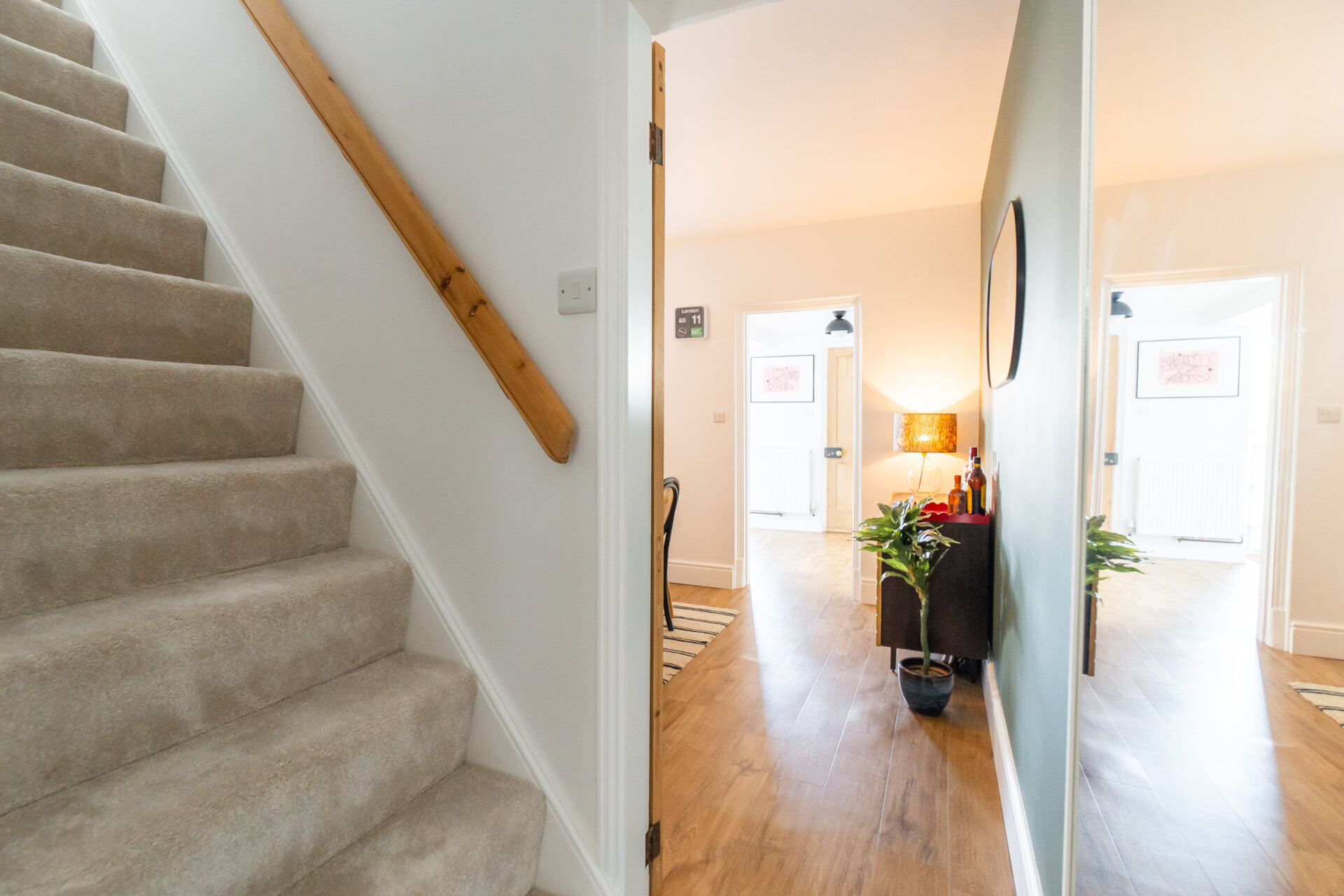 You will find the hallway between the lounge and dining room, the floor is laid with tiles. The carpeted stairs lead onto the first floor.
