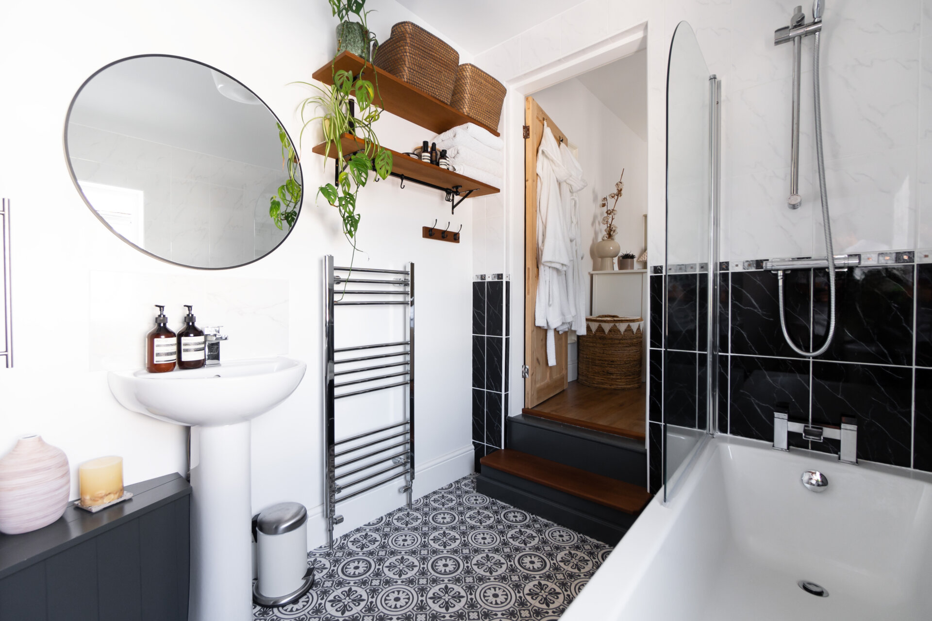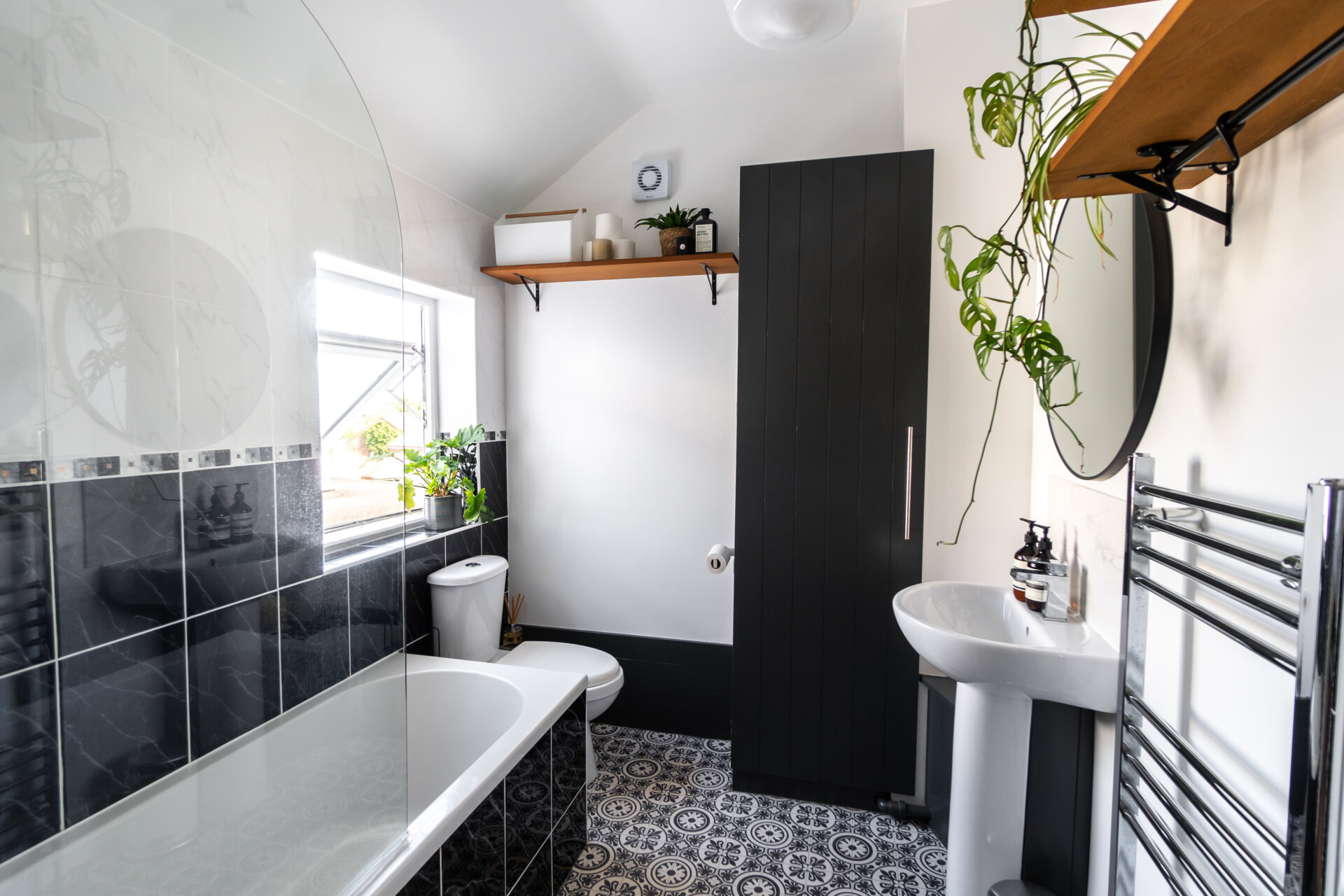 Step down into the bathroom through an original pine door, you will find a cupboard housing the boiler, vinyl tiled flooring, an obscure window to the side elevation, a bath, low level WC, heated towel rail and hand wash basin.