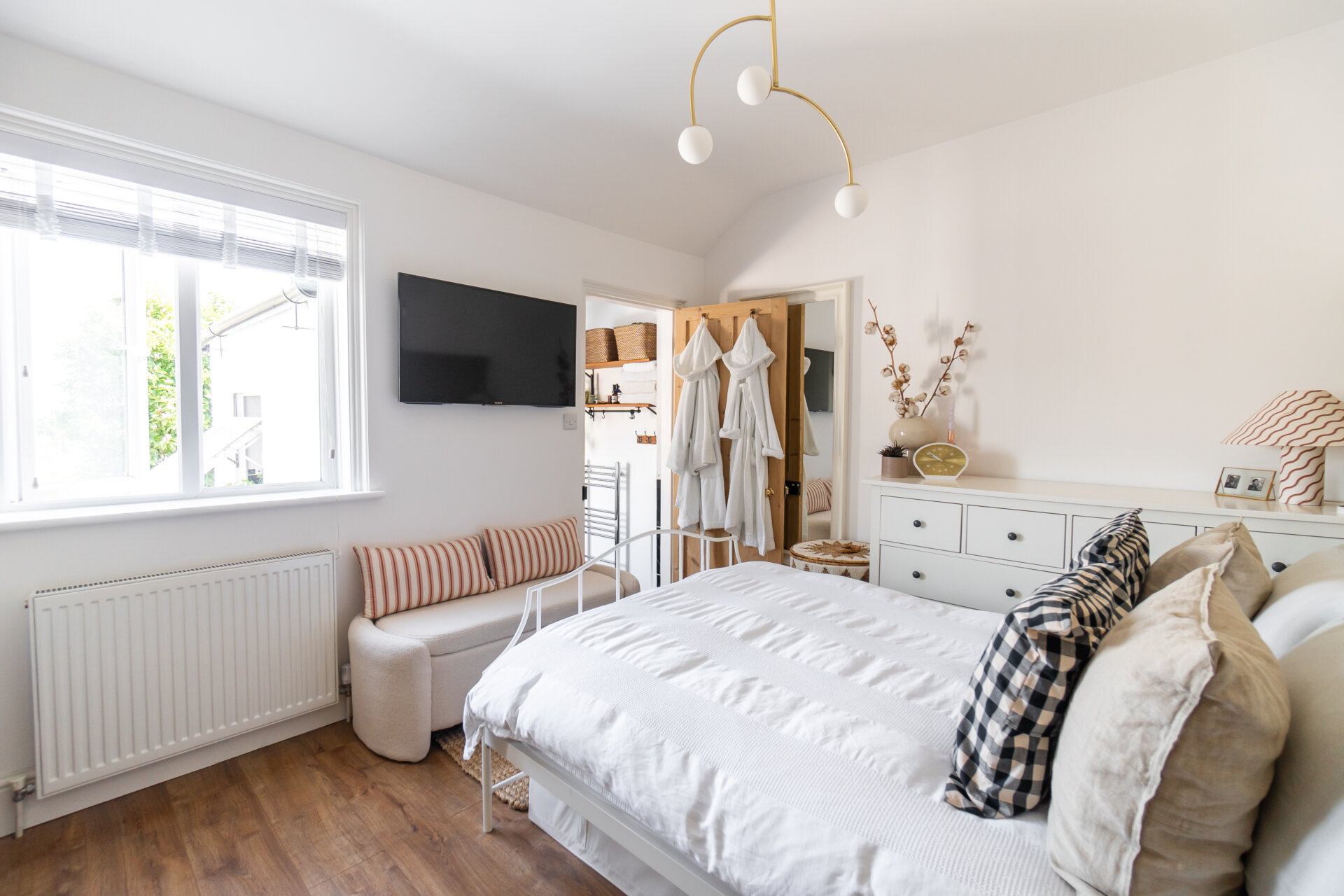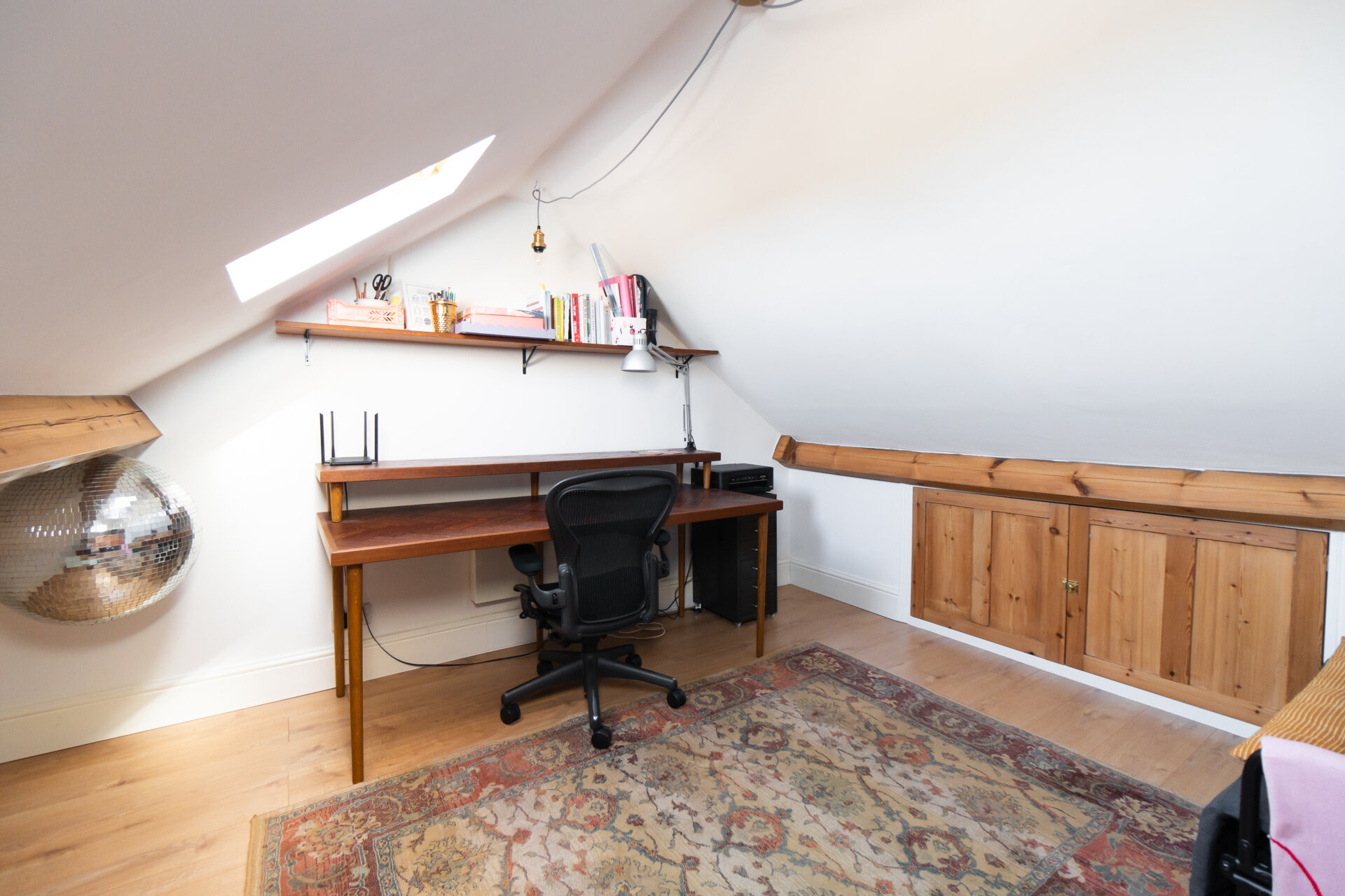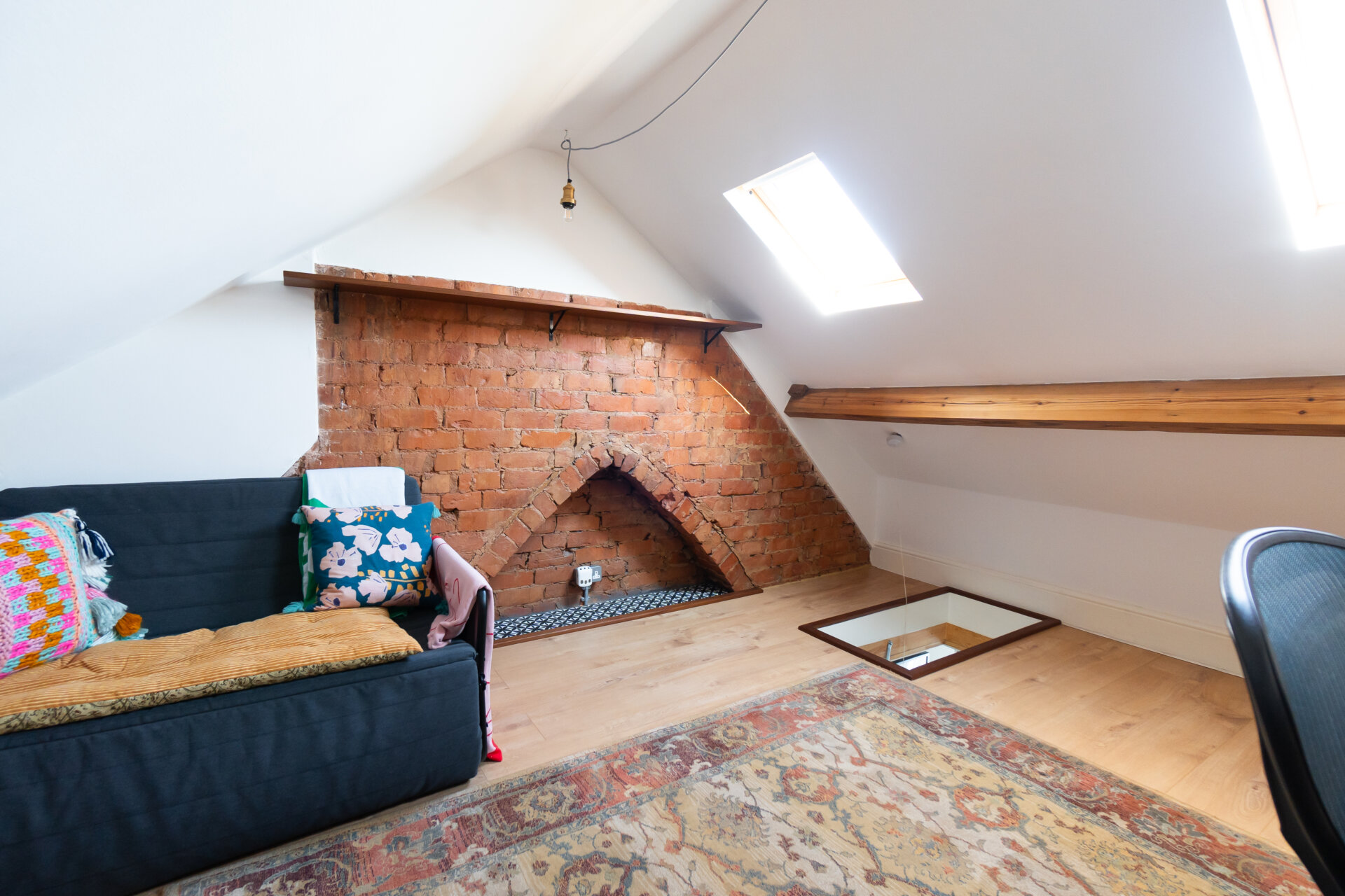 Pull down loft hatch from Bedroom two, the ladders lead you up into the loft space that has laminate flooring, two Velux windows, and a storage cupboard. Also the loft has power, light and direct internet connection. There is an exposed brick chimney which is a lovely feature.