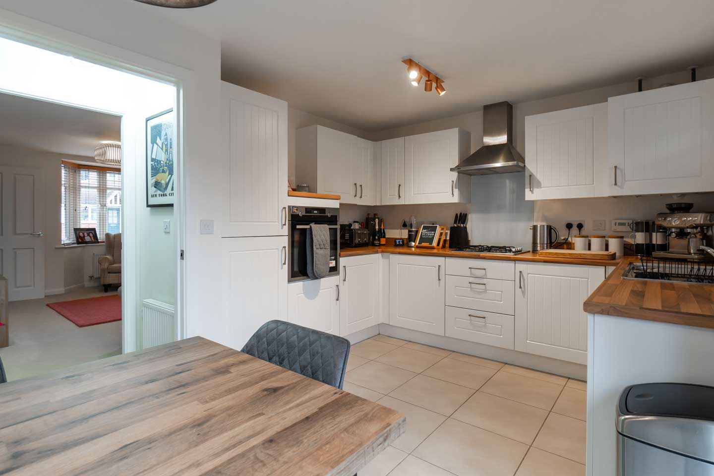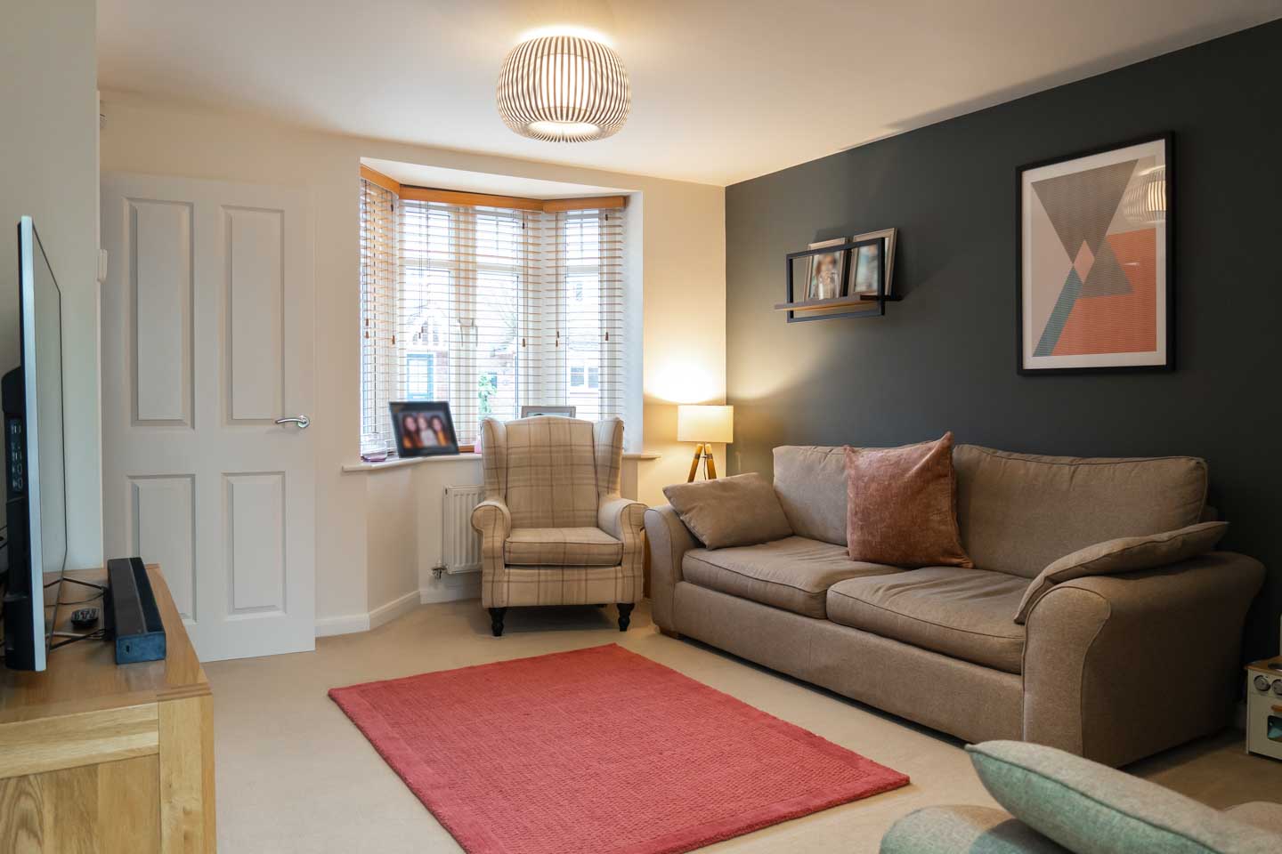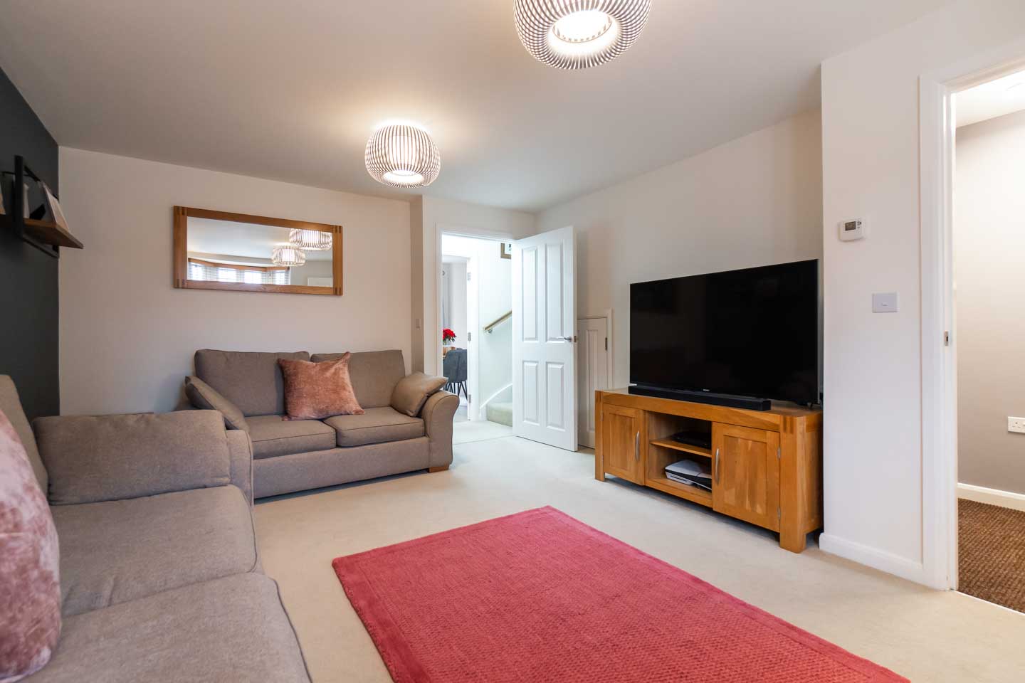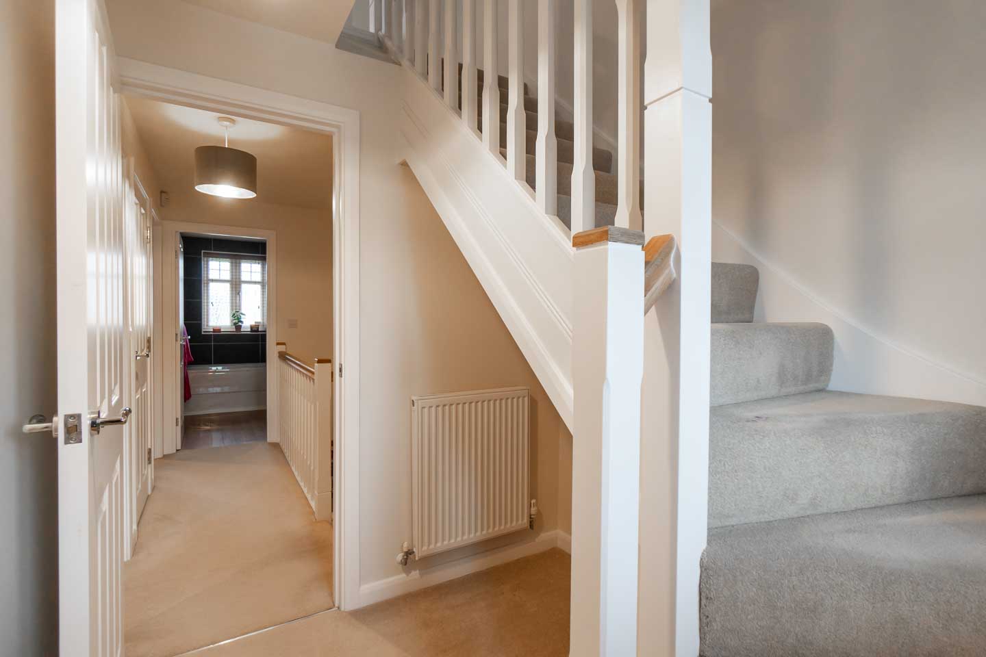 Set back from Angell Drive, you enter the property underneath a storm porch into the hallway which offers a cloakroom wc and access through to the main accommodation. Positioned to the front is a spacious living room with bay window and storage cupboard. In the centre of the ground floor is a lobby and the staircase leads up to the first floor from there - a really clever design so that cold air from your front door doesn’t rush upstairs in more traditional layouts of a similar home style!