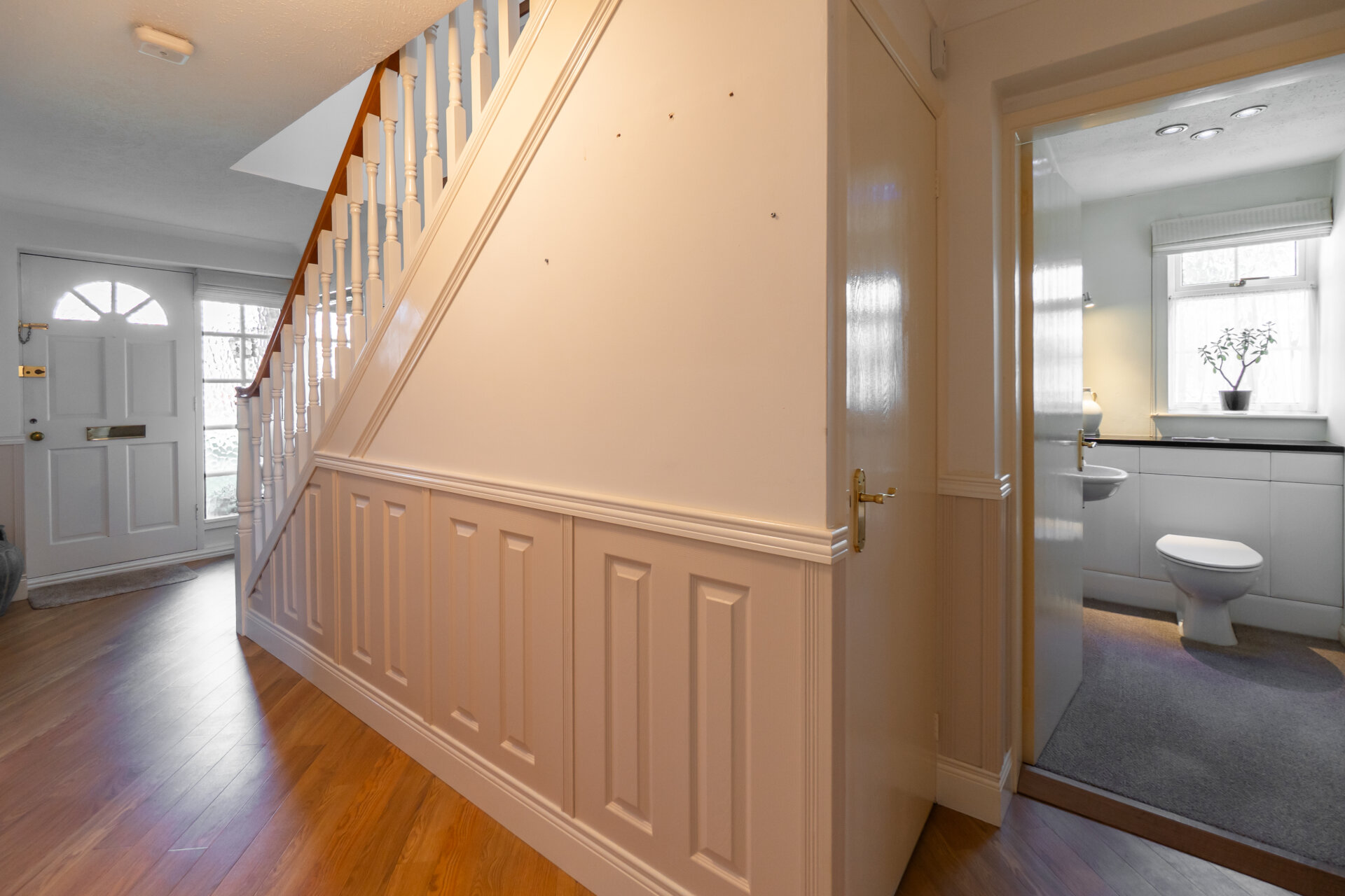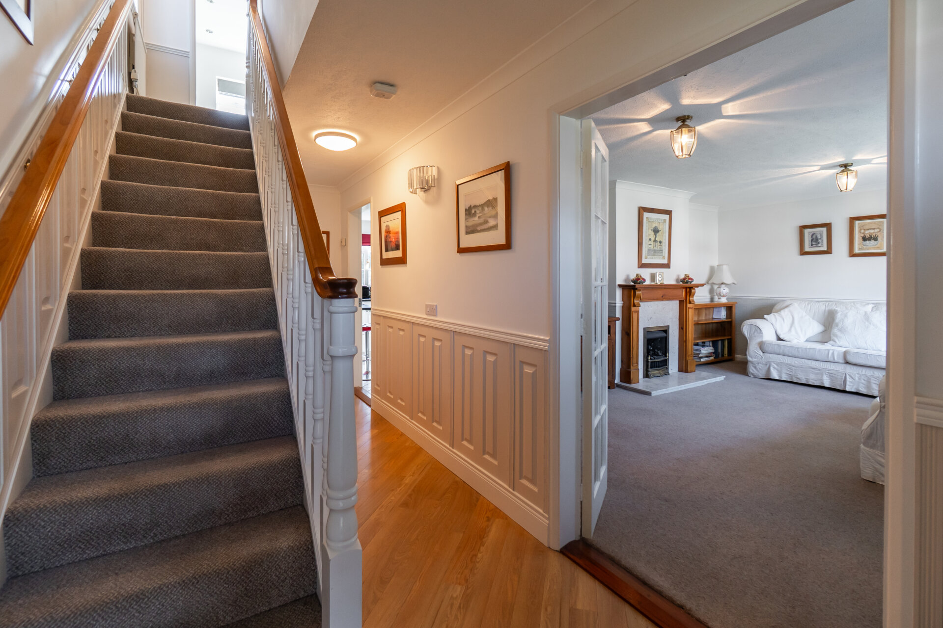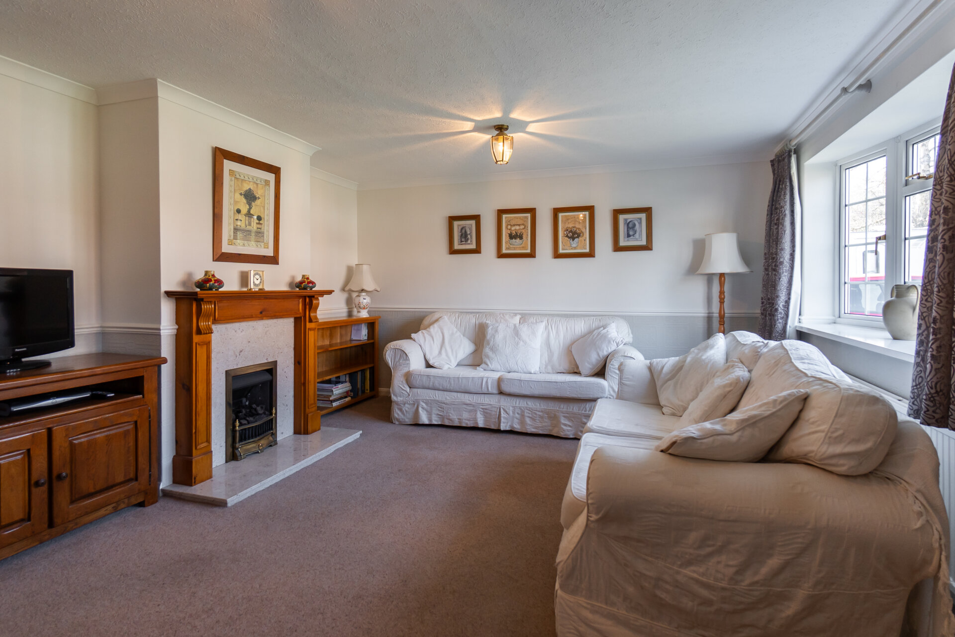 You arrive via a storm porch into a welcoming central hallway, which sets the tone for a well-proportioned home throughout. To the front, the living room is a naturally comfortable space, centred around a fireplace and filled with natural light. The hallway also accommodates a useful understairs WC, keeping the ground floor practical as well as presentable.