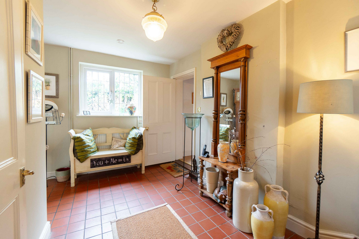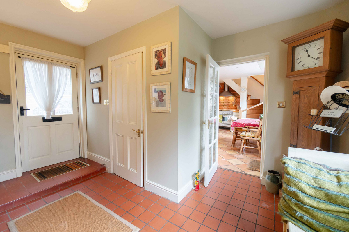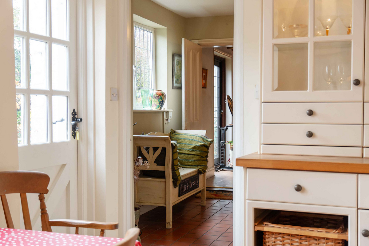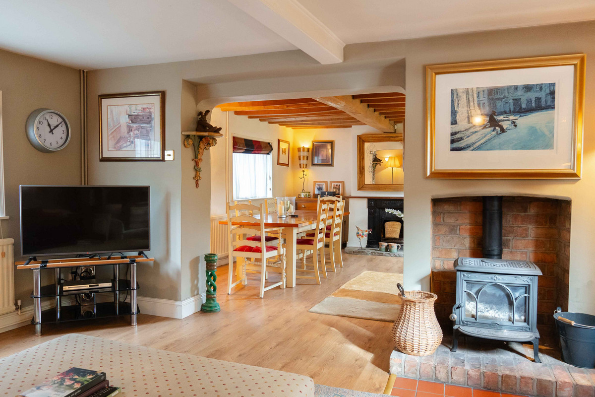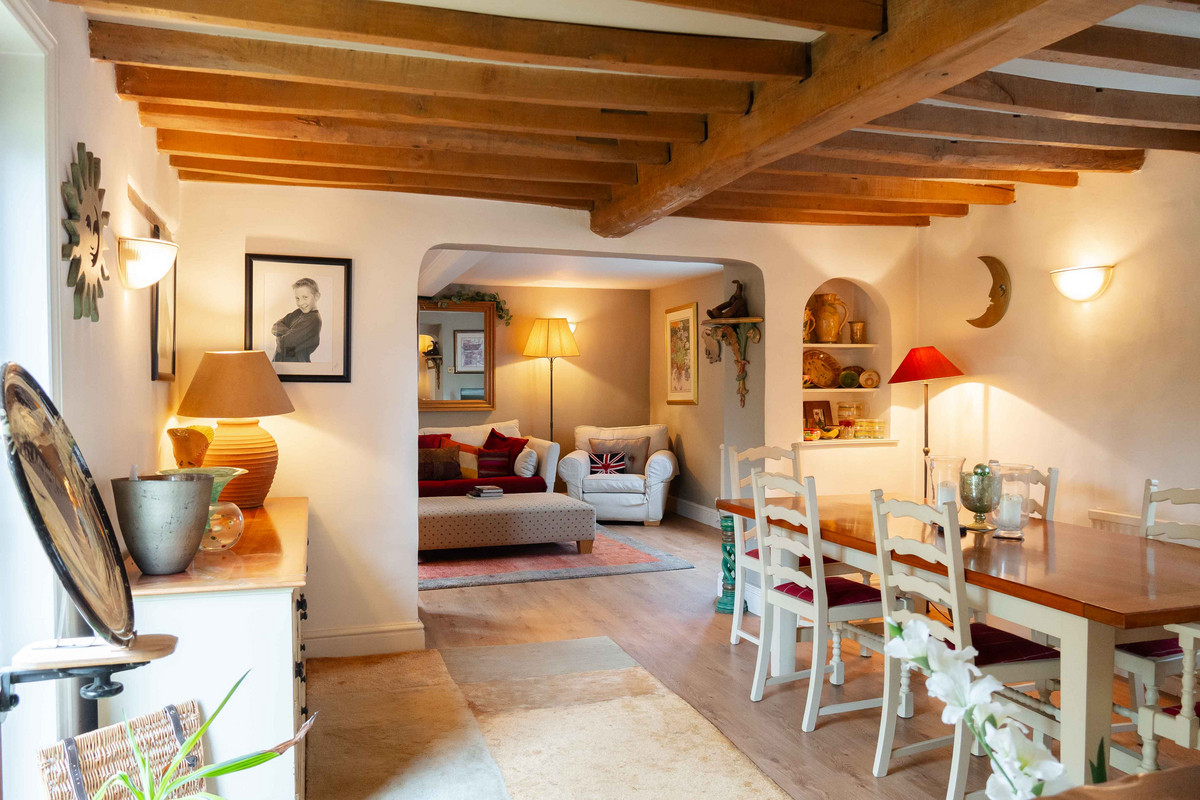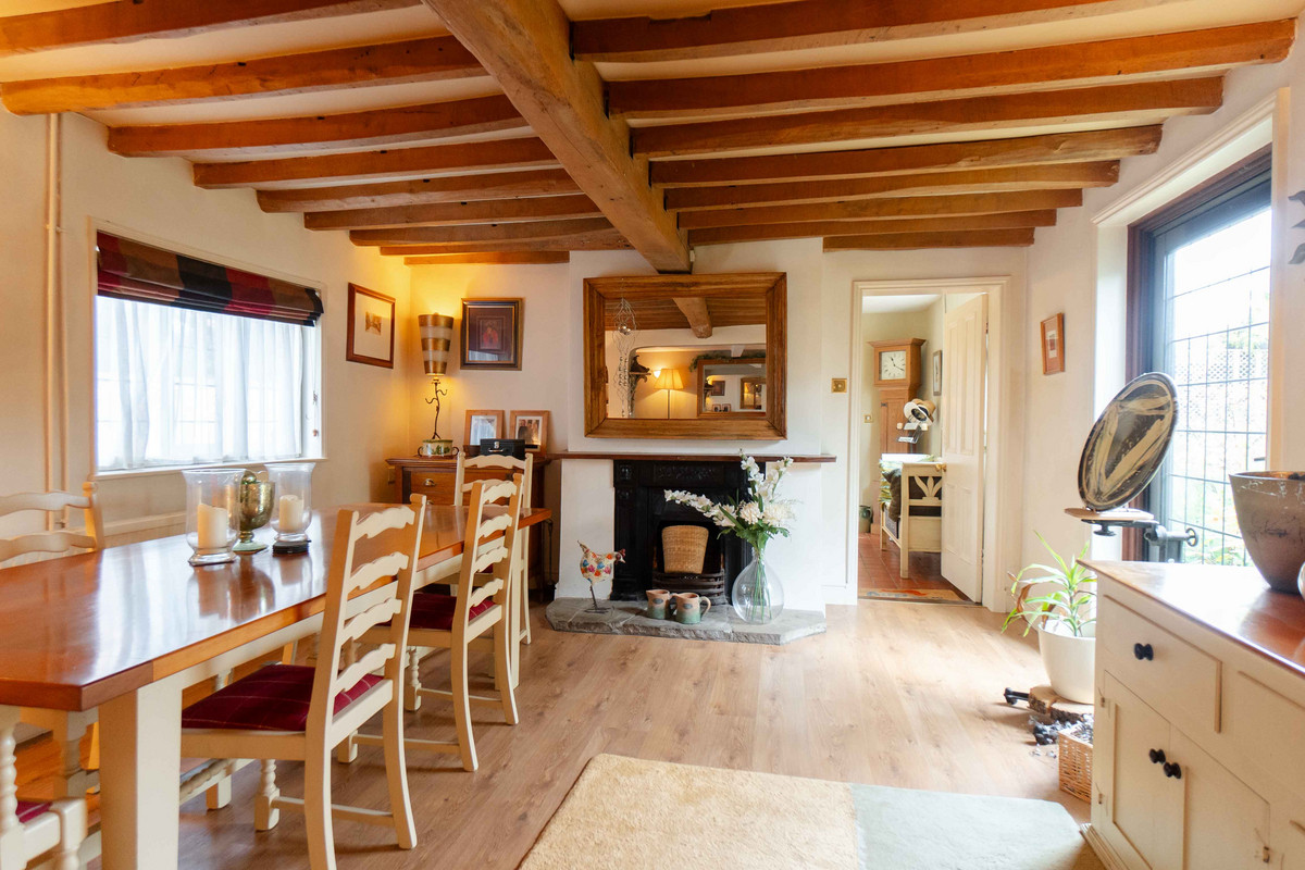As you enter, you're greeted by a warm and inviting hallway having a classic quarry tiled floor which sets the tone for further character features to follow. A window at the back lets in plenty of light and offers a nice view of the garden. On your left, there's a handy cloakroom with downstairs toilet. Leading through to the right side of the property, you'll find a large dining room that opens into the living room through a big archway, both of these spaces originally being the two separate blacksmith’s cottages. Exposed beams and a decorative fireplace / log burner in each room give each space a cozy feel whilst still having plenty of space for large furniture. Additionally natural light floods into each area, with both of the rooms having dual aspect from windows to the front and rear.