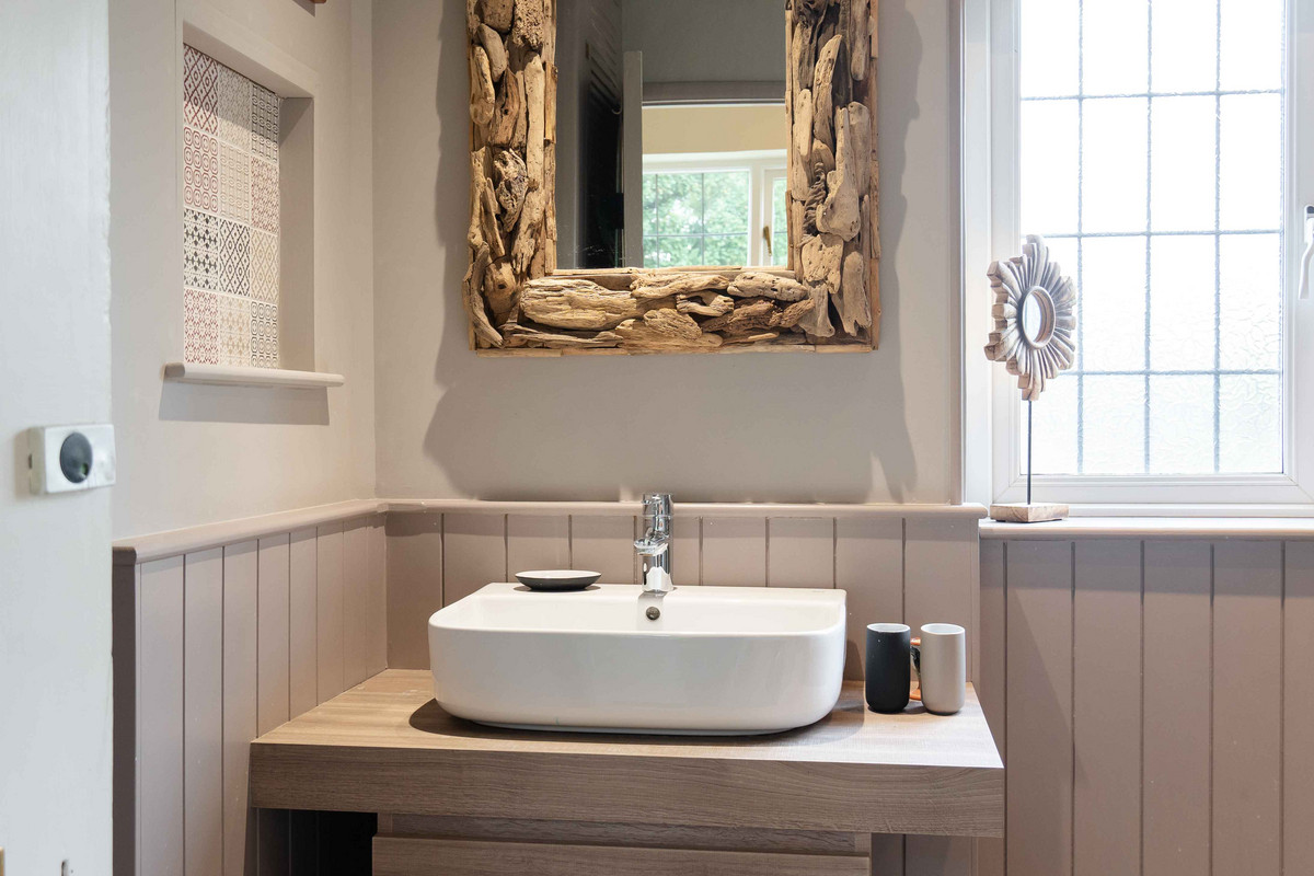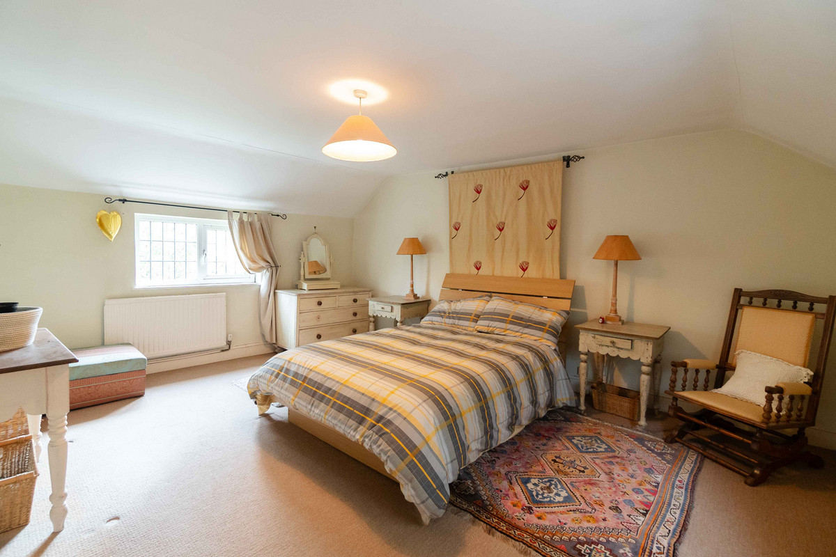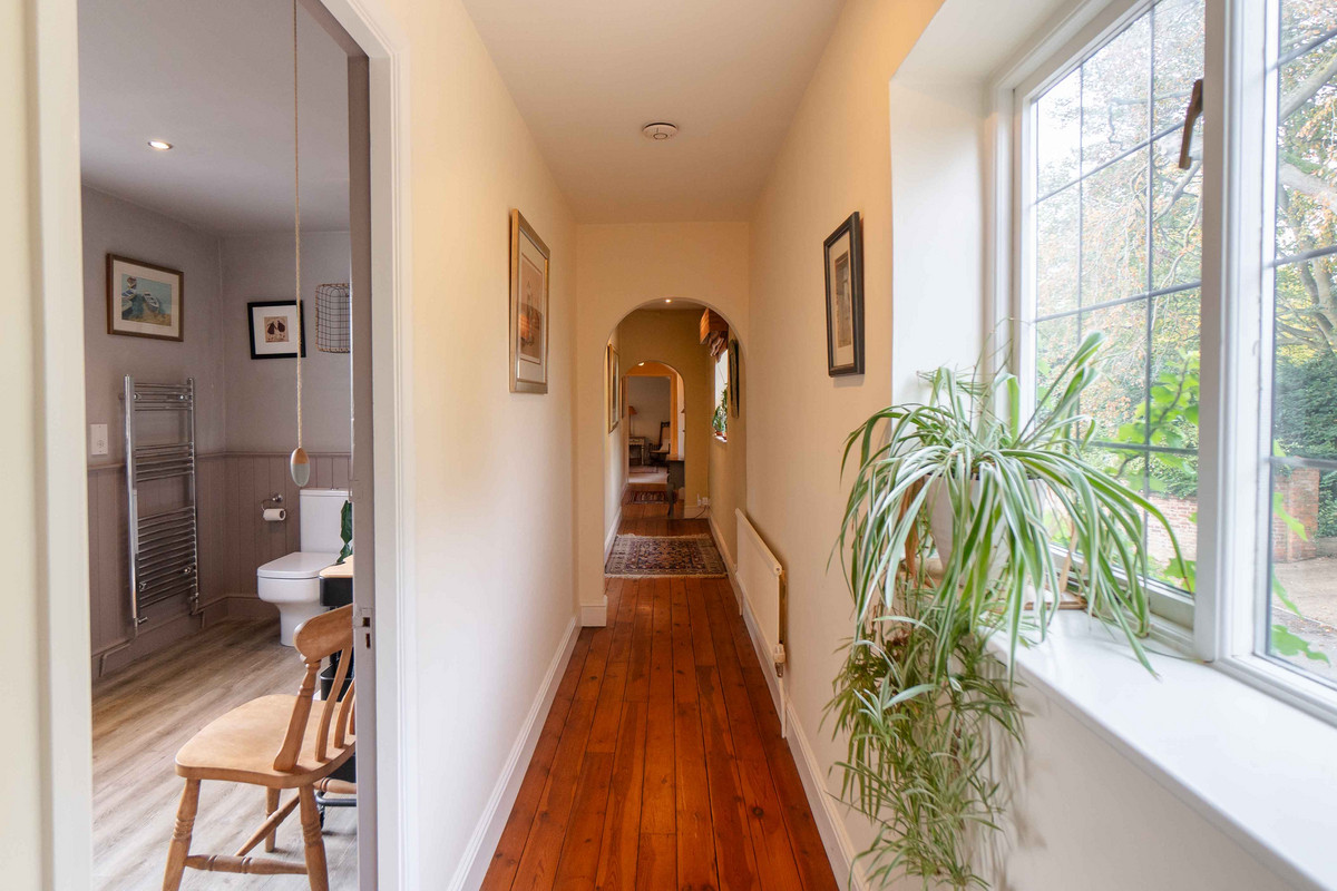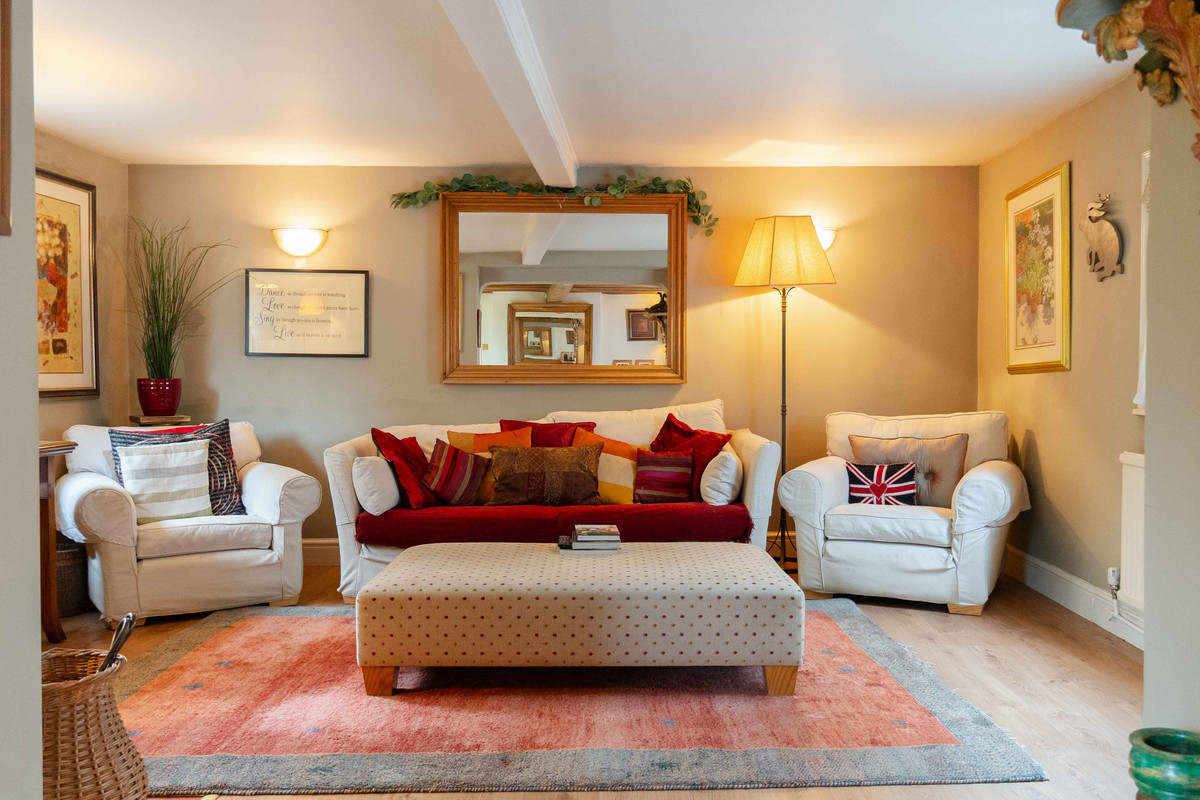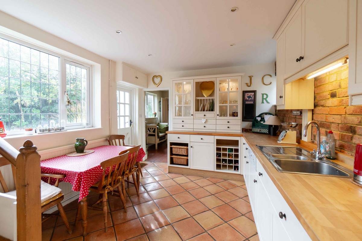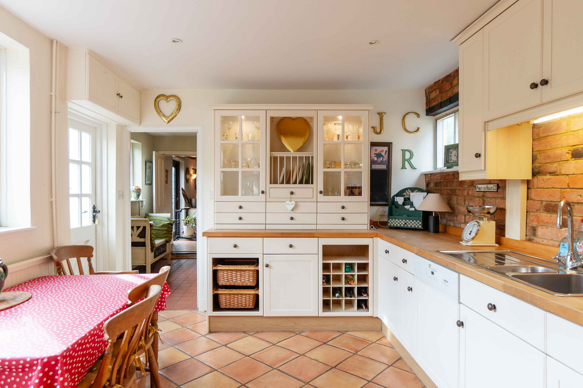 As you enter, you're greeted by a warm and inviting hallway having a classic quarry tiled floor which sets the tone for further character features to follow. A window at the back lets in plenty of light and offers a nice view of the garden. On your left, there's a handy cloakroom with downstairs toilet. Leading through to the right side of the property, you'll find a large dining room that opens into the living room through a big archway, both of these spaces originally being the two separate blacksmith’s cottages. Exposed beams and a decorative fireplace / log burner in each room give each space a cozy feel whilst still having plenty of space for large furniture. Additionally natural light floods into each area, with both of the rooms having dual aspect from windows to the front and rear.
