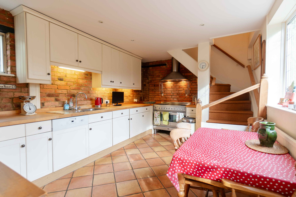 The kitchen is designed with a country touch, featuring plenty of storage and wooden countertops. It comes with built-in appliances such a dishwasher and a fridge/freezer, plus a large oven and inset sink. A door and window look out onto the garden, and there are stairs to one corner leading to the next floor. Adding to the character again are exposed brick walls, unique to this room.