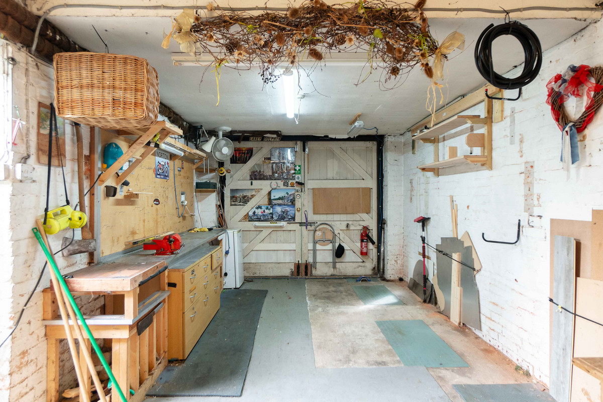 To the left of the property there lies a large garage, accessed via huge timber double doors from the front which provide access for a vehicle comfortably. This space leads through to the garage which has plenty of space for storage and could be used as a workshop. It's equipped with electricity, lighting, and plumbing for a washing machine with further storage rooms at the end.