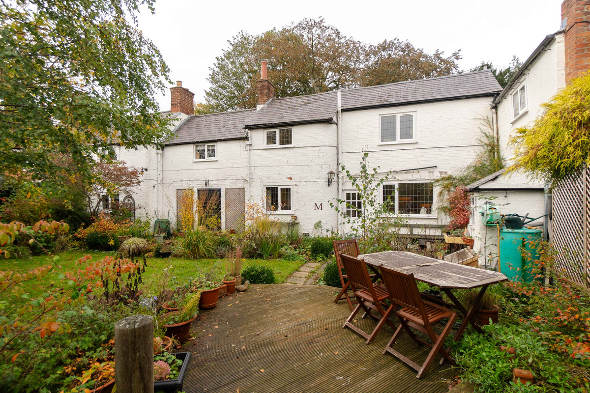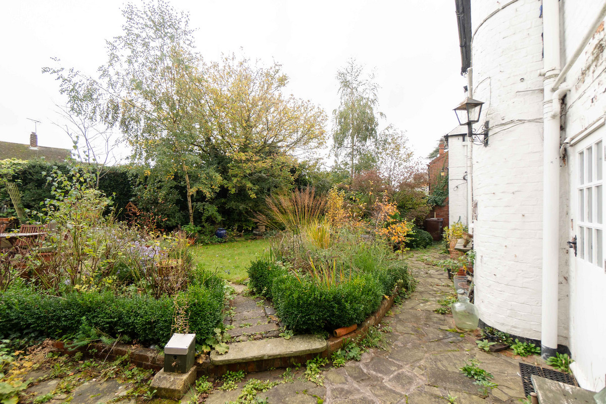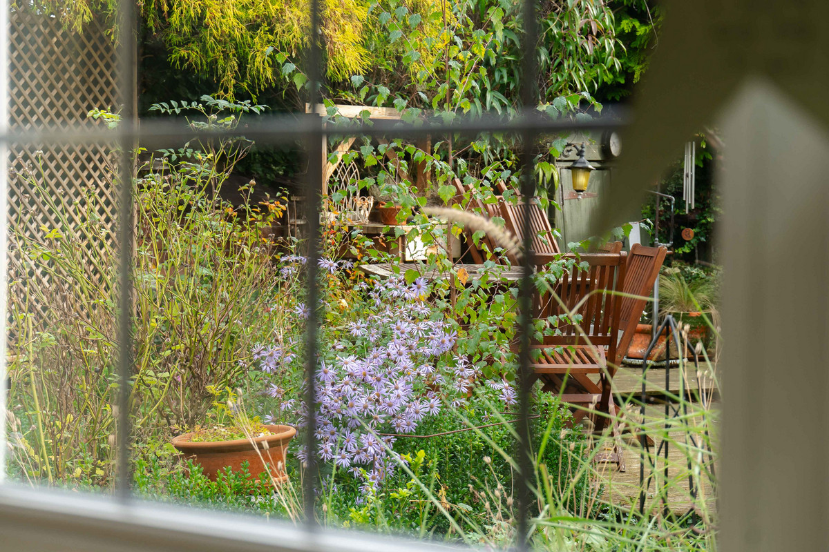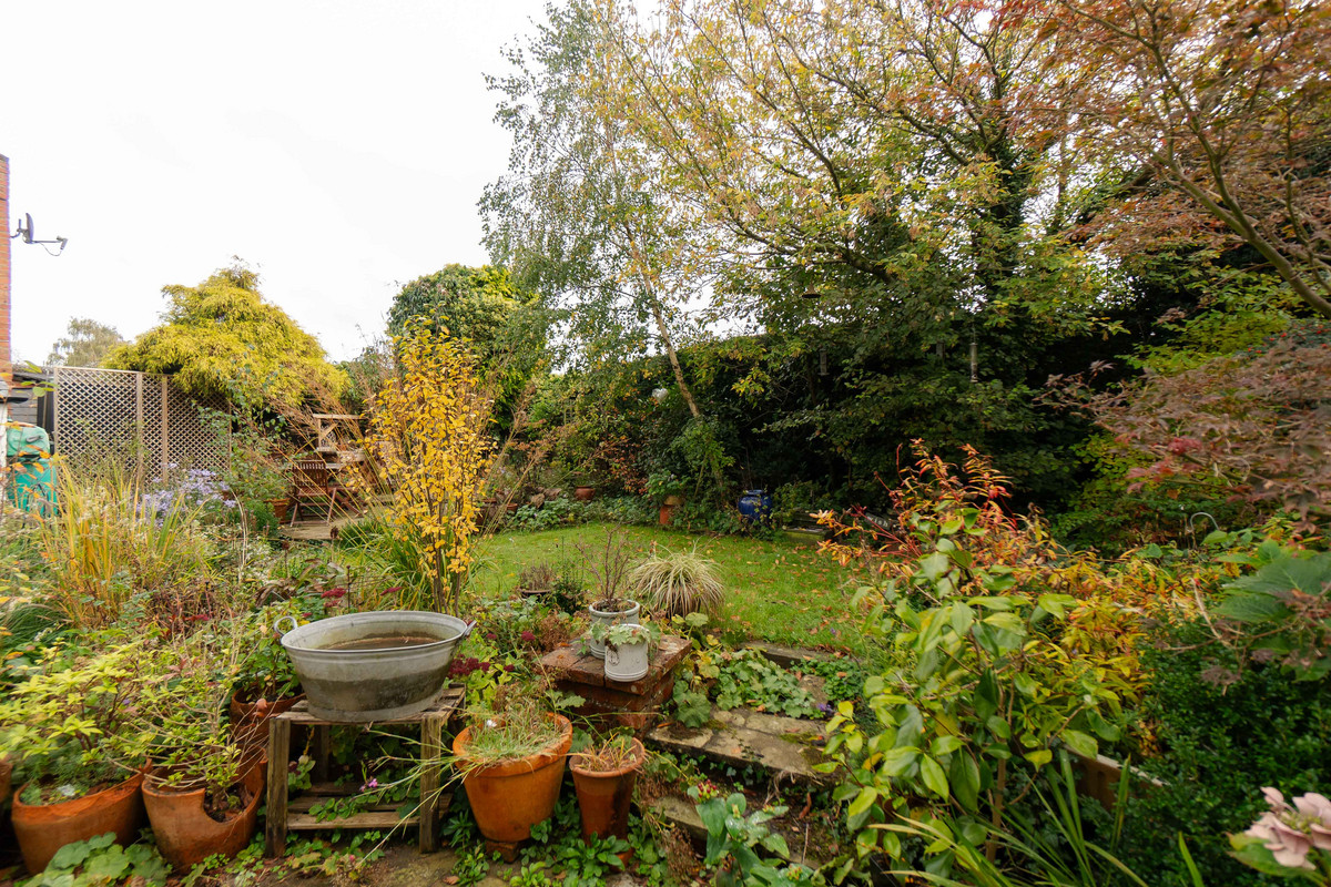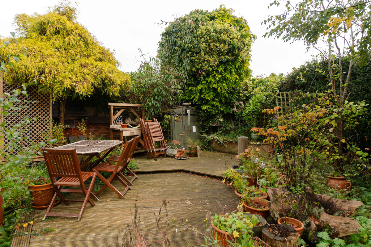 Outside, the garden gets a lot of sun, being south facing and has been landscaped to create a private space to relax with various different areas. There's a paved path and patio area, a raised lawned area, and a hidden decked spot for ideal for outdoor entertaining. The garden is surrounded by well-kept plant borders and mature trees.