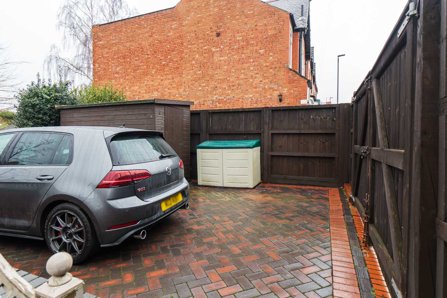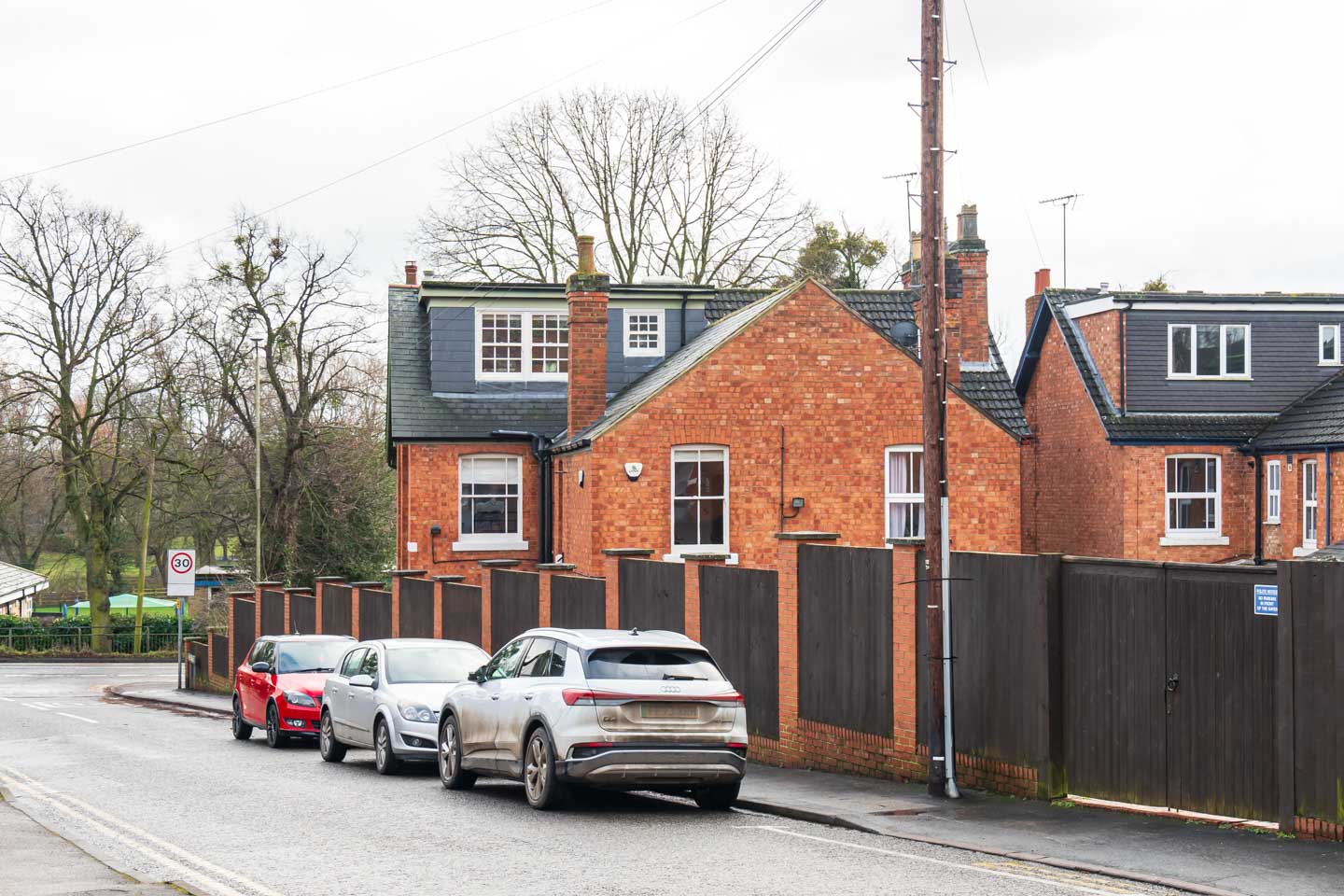 The rear garden matches the front's beautiful landscaping, split across three levels with private patios, manicured lawn, and stocked borders featuring specimen trees. Additional yard space runs alongside the property, thanks to its angular plot. This area has planning permission for a large extension, should future development be desired. At the rear of the plot, accessed through double gates from the side, lies a block-paved hardstanding for two vehicles. Planning permission has also been granted for a detached garage on this driveway.