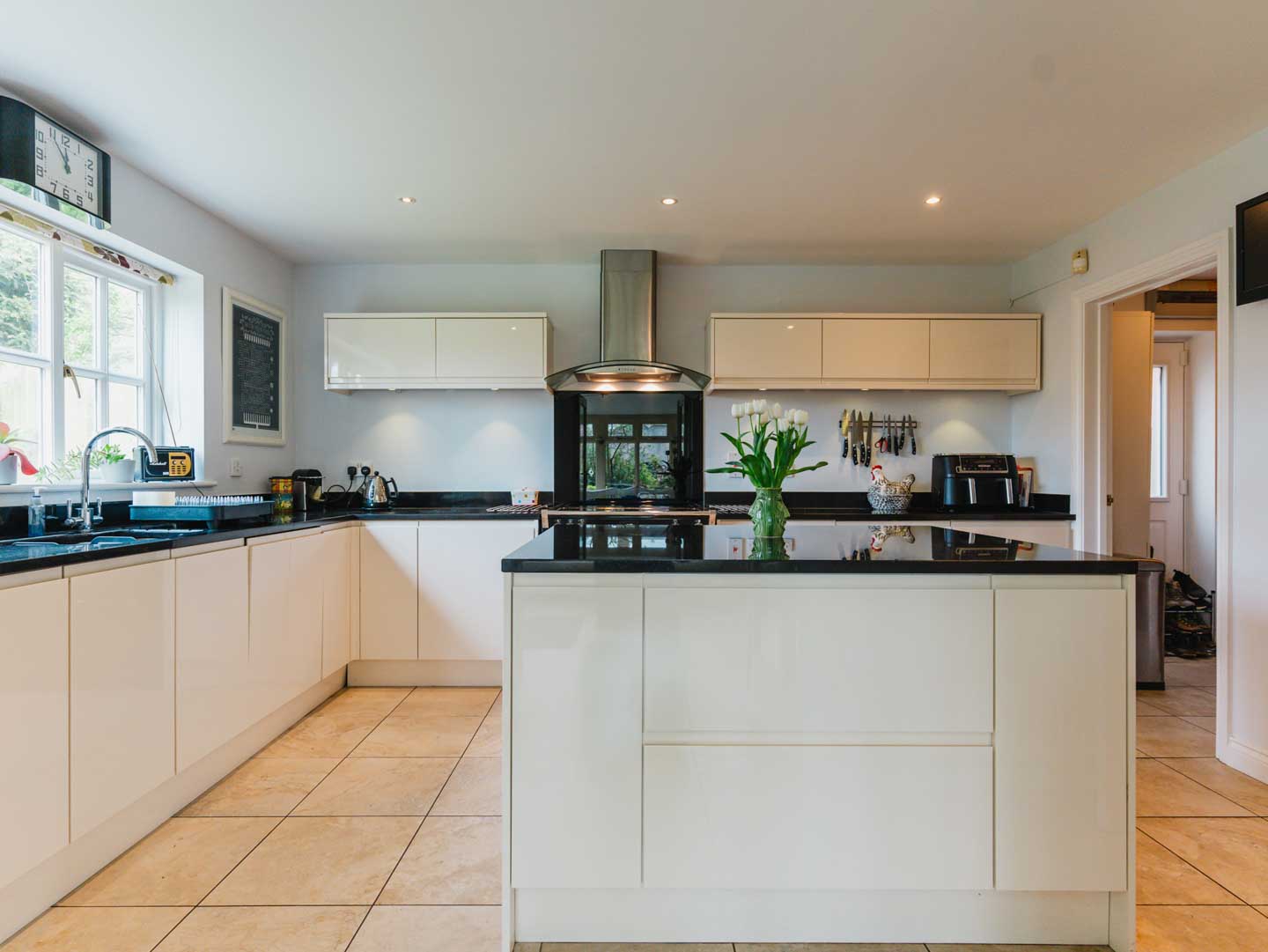 Stepping off to one side of the home, there is the living room where an abundance of natural light can flood in through the front window together with double doors from the garden room. A focal point of this space is the stone fireplace surrounding a cast iron log burning stove.