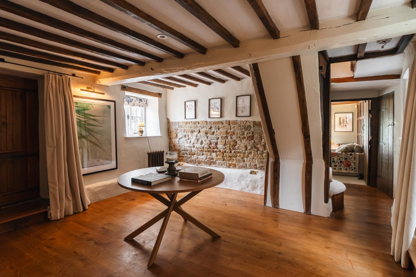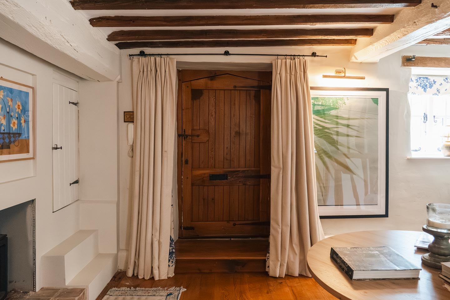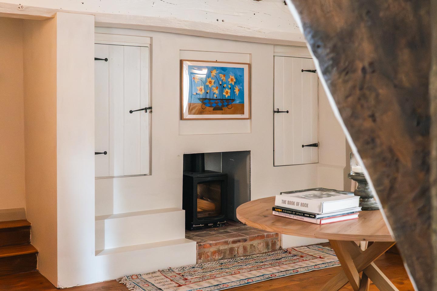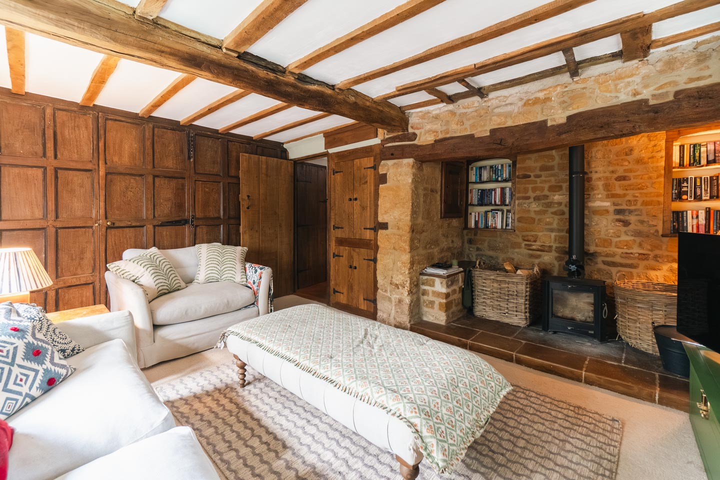From here, to the front of the house, a panelled sitting room offers another inviting retreat, with its own Inglenook fireplace housing a wood-burning stove and beautiful cabinetry. There is also secret store behind the wood panelled wall!