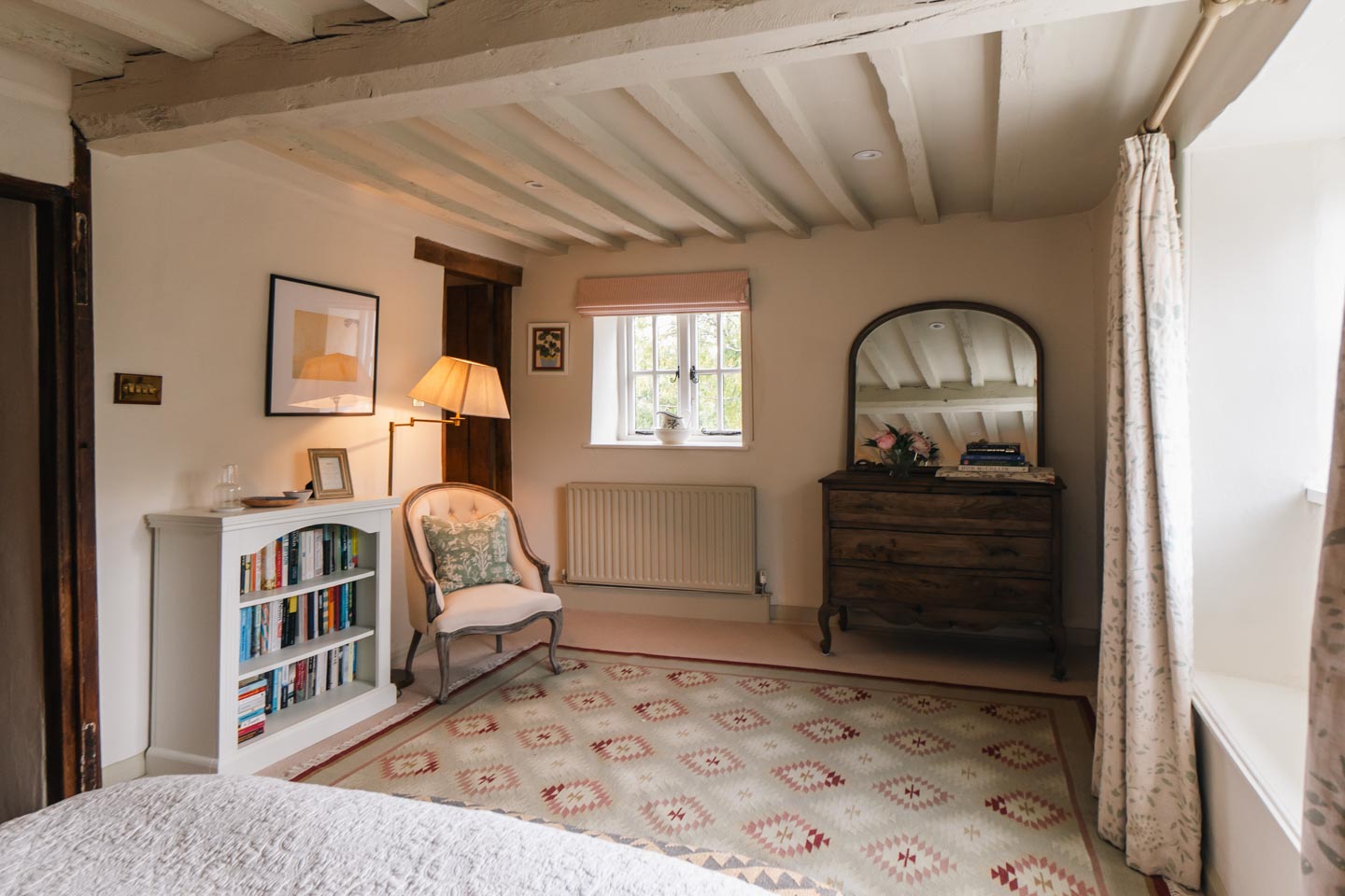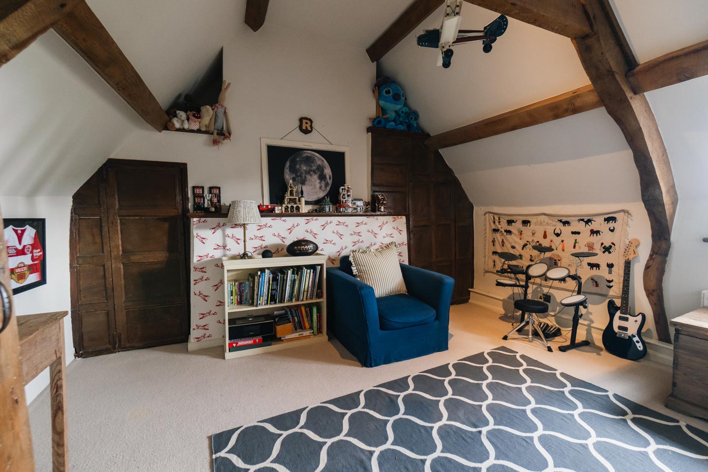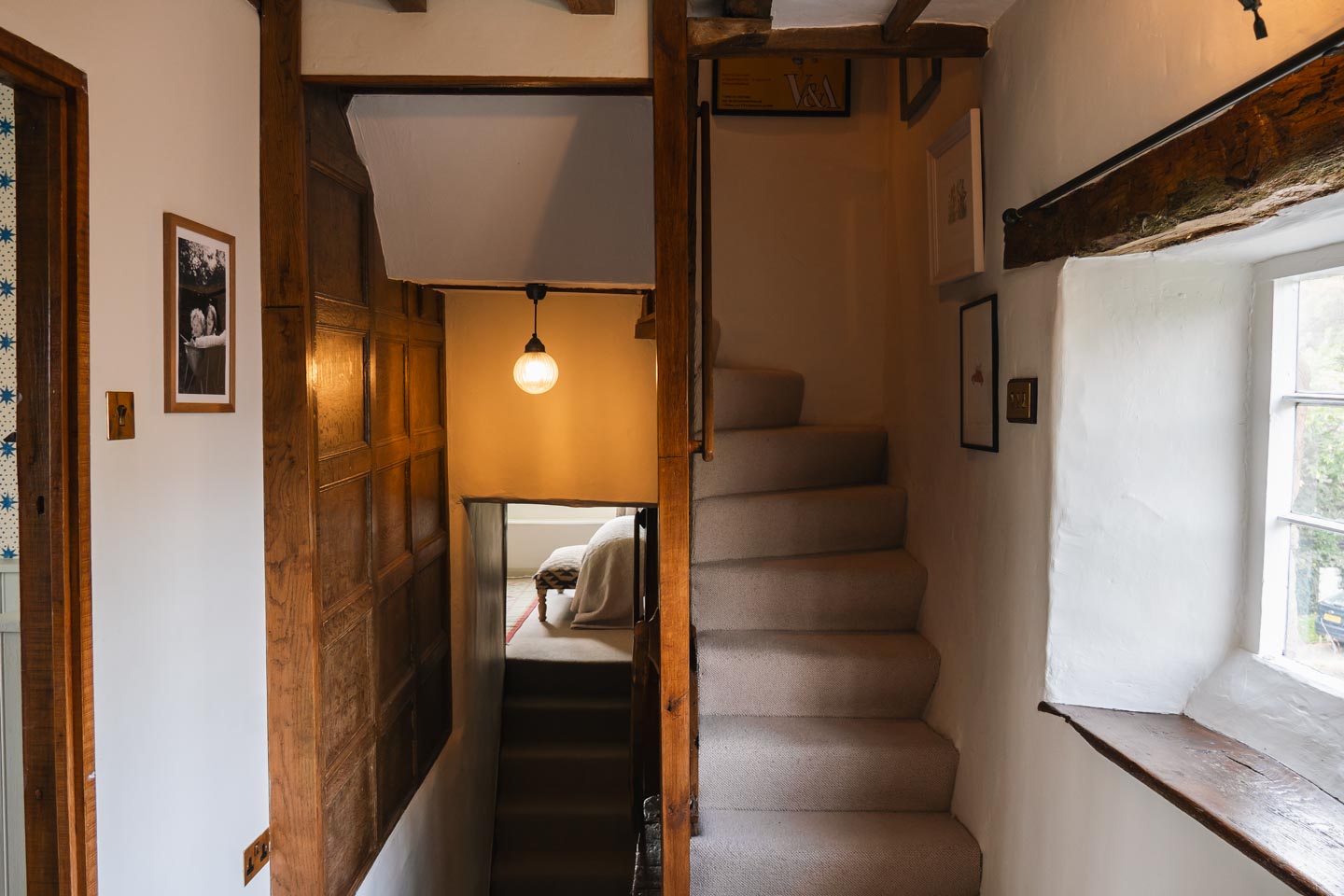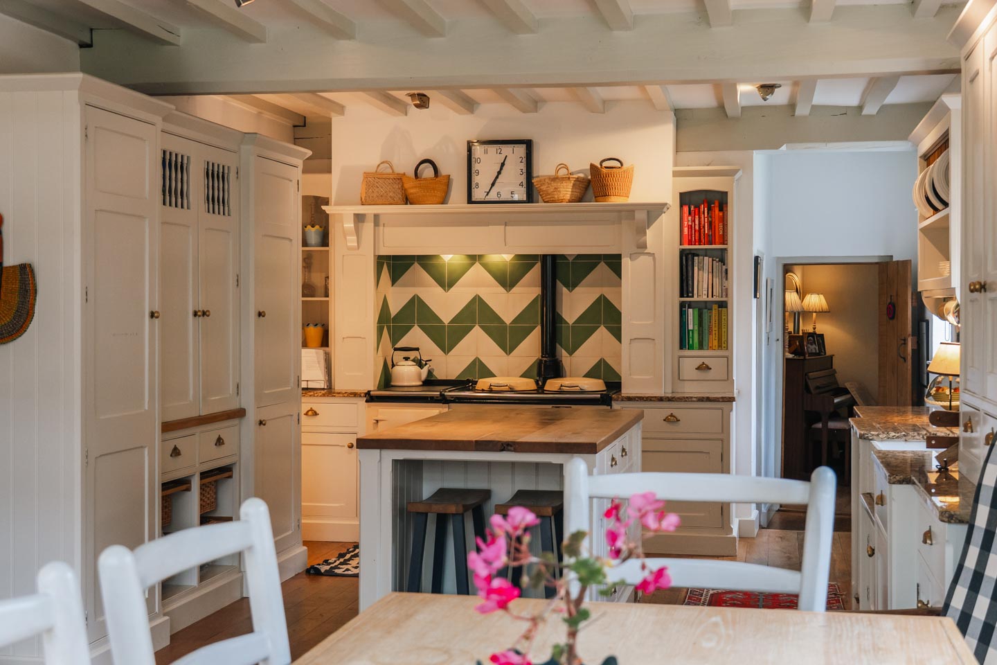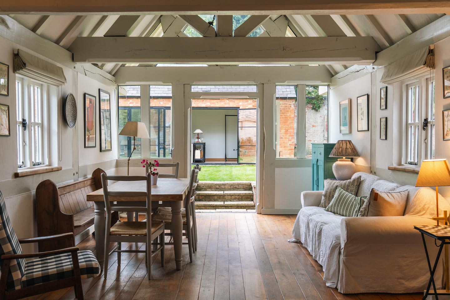 From here, to the front of the house, a panelled sitting room offers another inviting retreat, with its own Inglenook fireplace housing a wood-burning stove and beautiful cabinetry. There is also secret store behind the wood panelled wall!